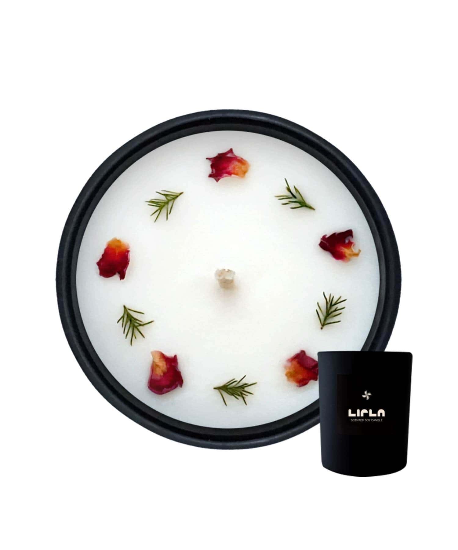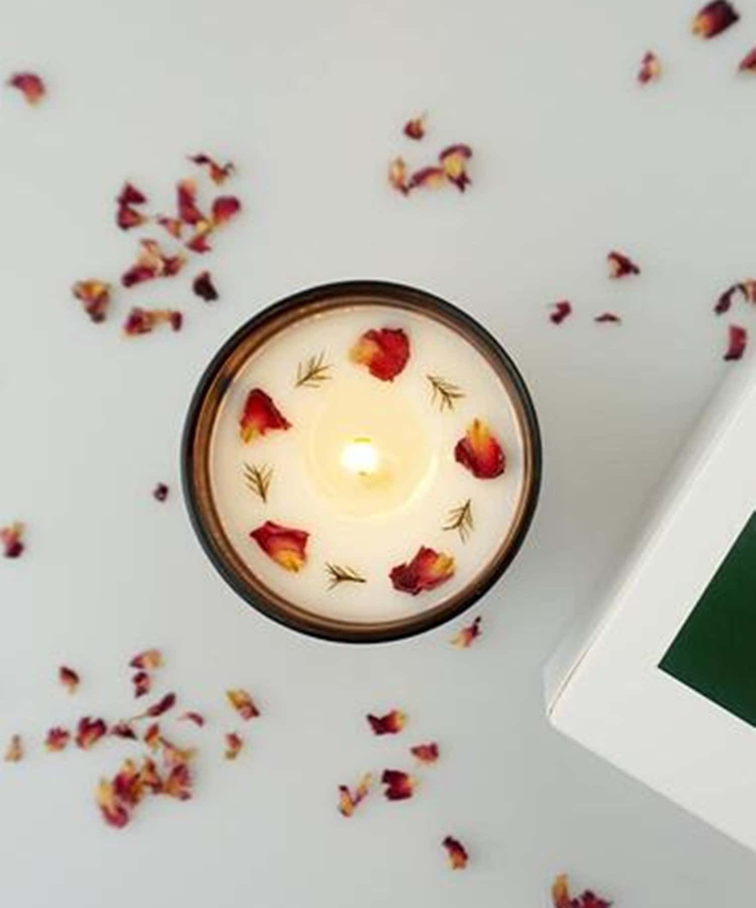 キャンドルの表面に、繊細な花びらなどが散りばめられ、その美しさはまるでアート作品のようなソイキャンドル。