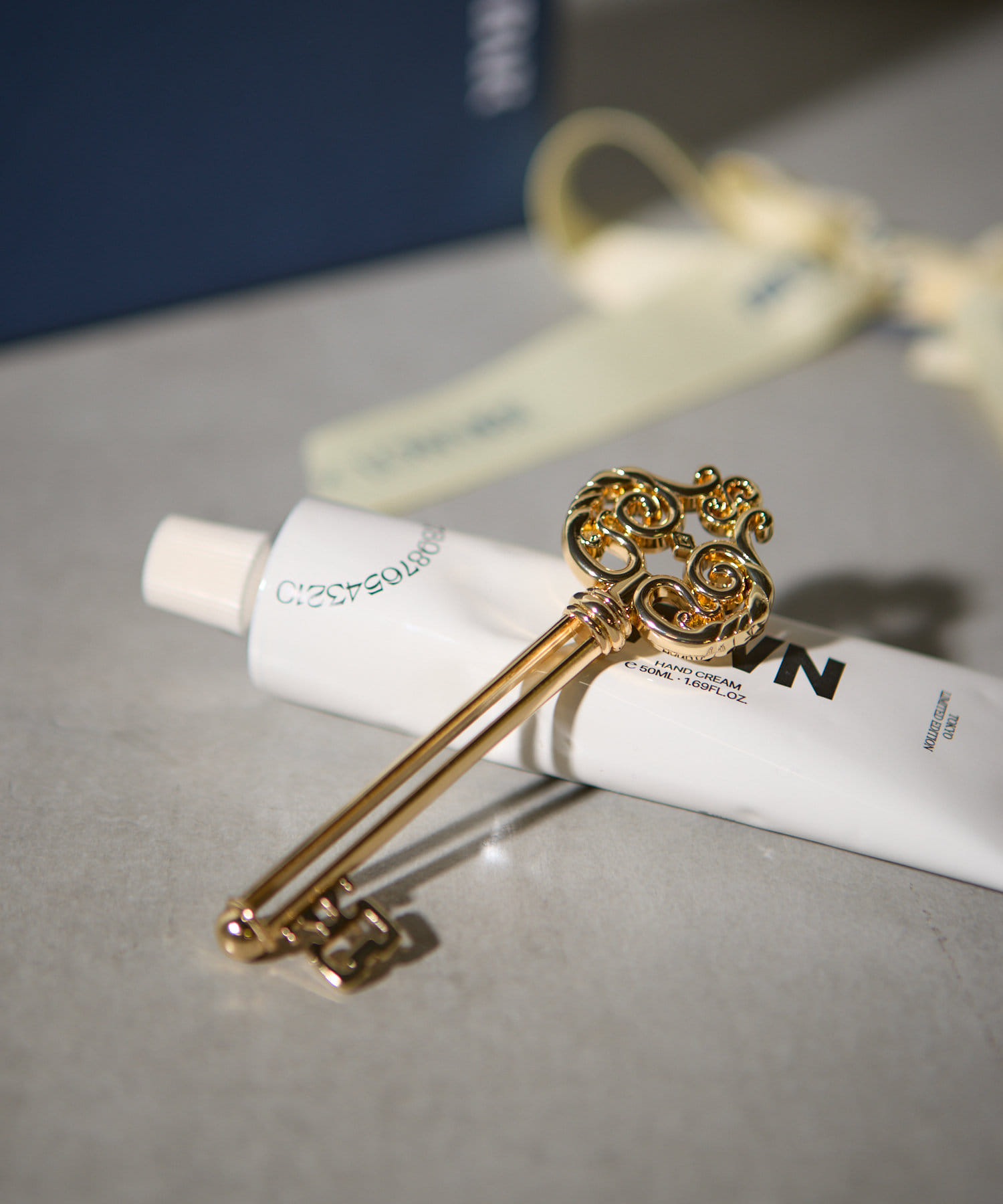 ハンドクリームと鍵のかたちをしたチューブホルダーのセット。ハンドクリームの残量が少なくなってきたら、ホルダーをセットして最後まで使い切ることができる便利なアイテム。珍しい鍵のかたちは使わないときも、インテリアのアクセントとしても。箱入りなので、自分へのご褒美にはもちろん、大切な方へのギフトにもぴったり。ハンドクリーム単品や箱入りギフトも別ページにてご用意しています。