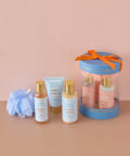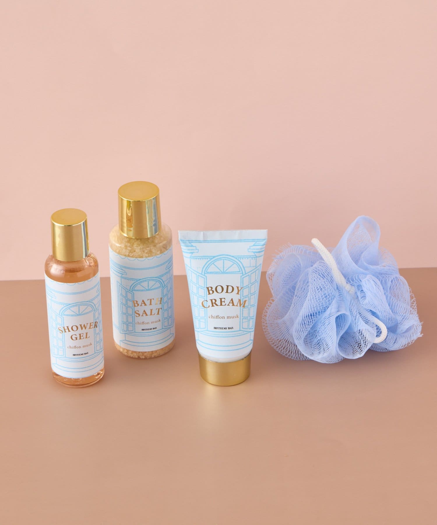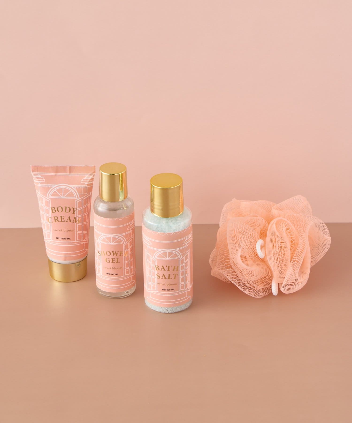 シャワージェル、バスソルト、ボディクリーム、バススポンジがセットになった、バスタイムをより優雅にするボディケアセット。