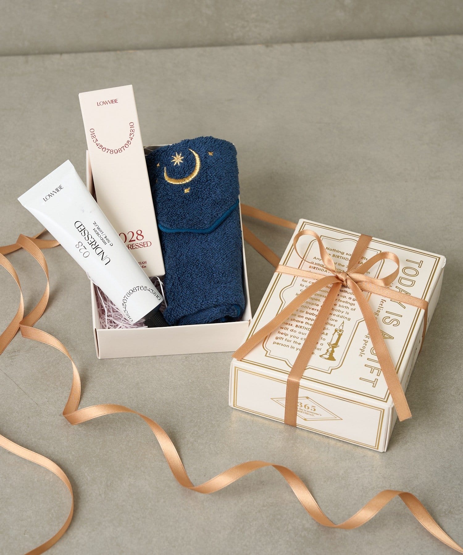大人気のLOWVIBEのハンドクリームと、月の刺繍がオシャレなタオルハンカチをセットにしました。