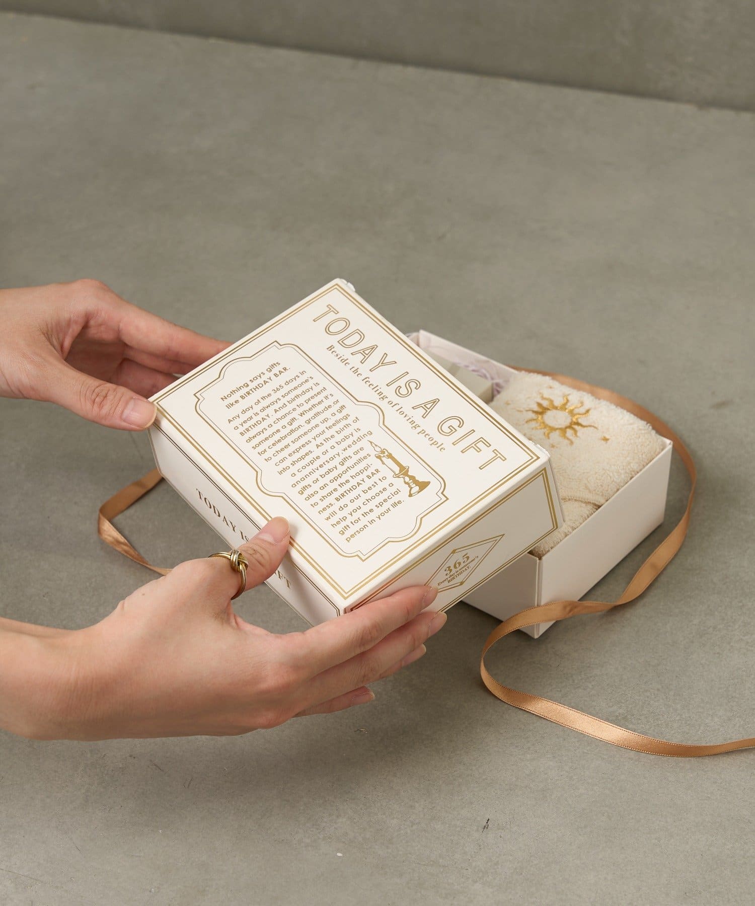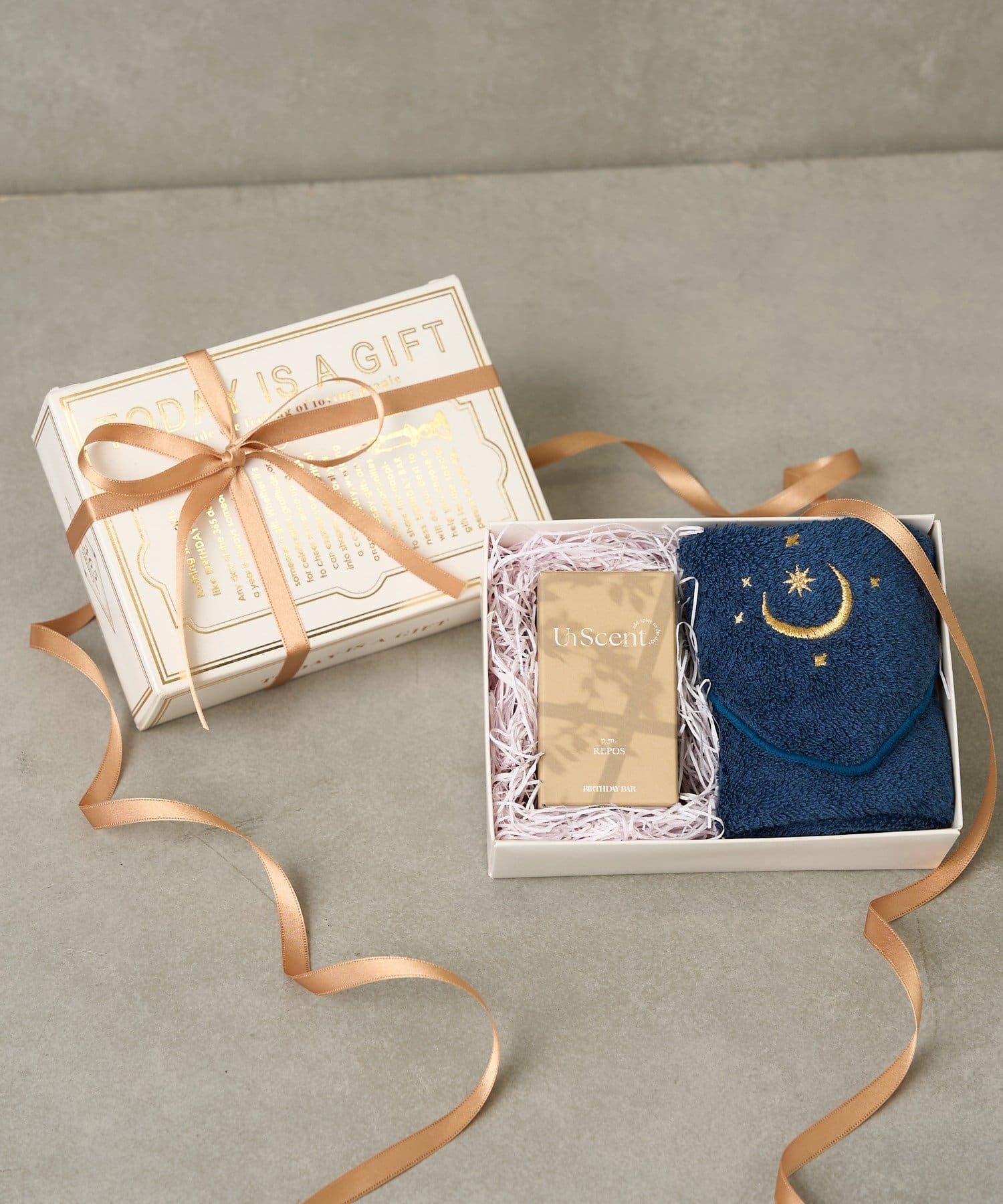 月モチーフのタオルハンカチを合わせました。ゆったりと過ごす時間に寄り添う、心安らぐギフトセットです。