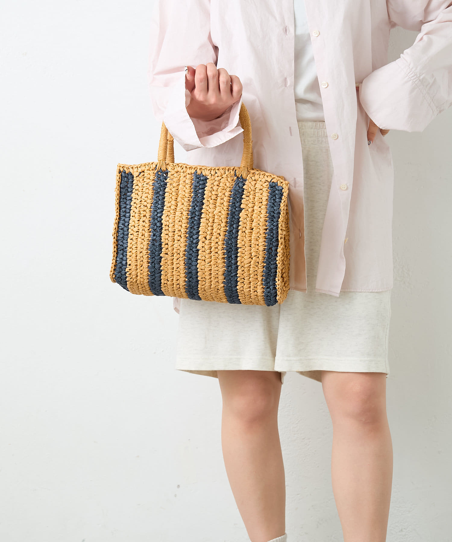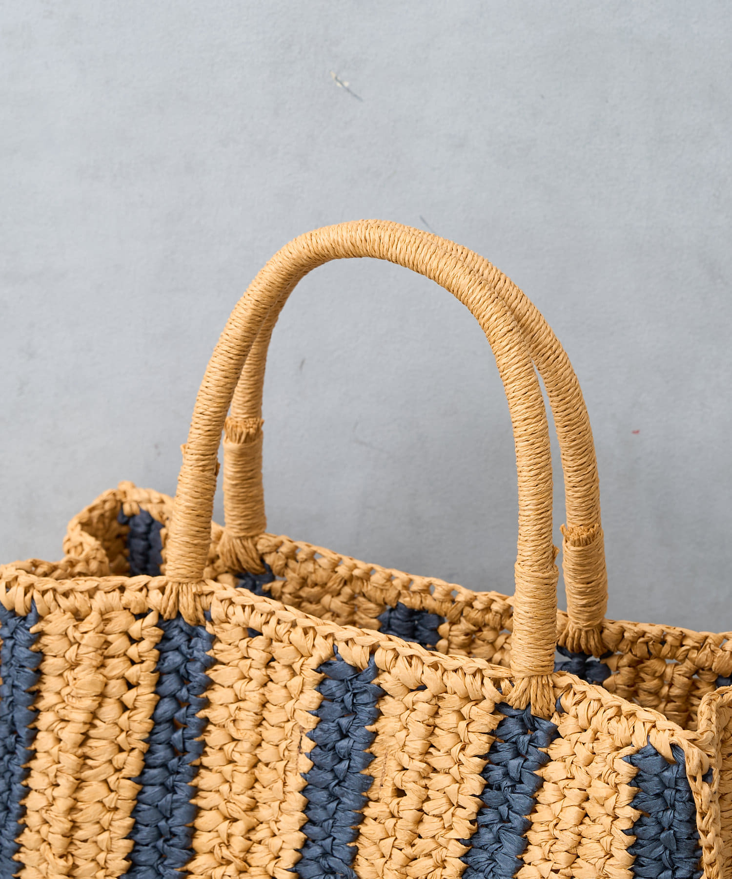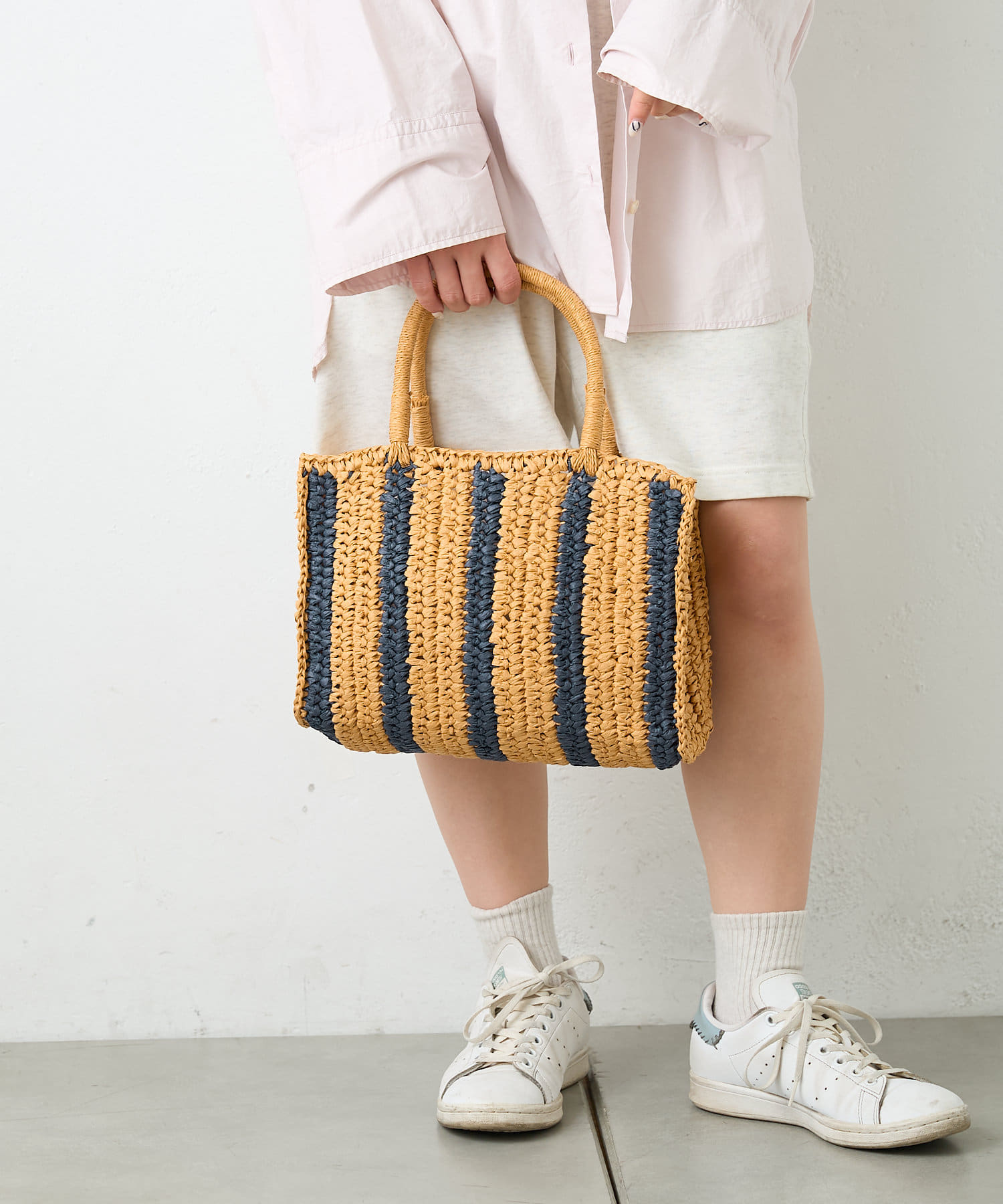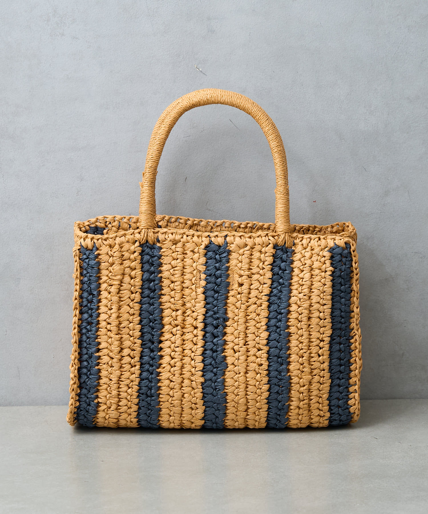 ナチュラルなペーパー素材に、ストライプが映えたトートバッグ。一点一点手編みで丁寧に作られています。