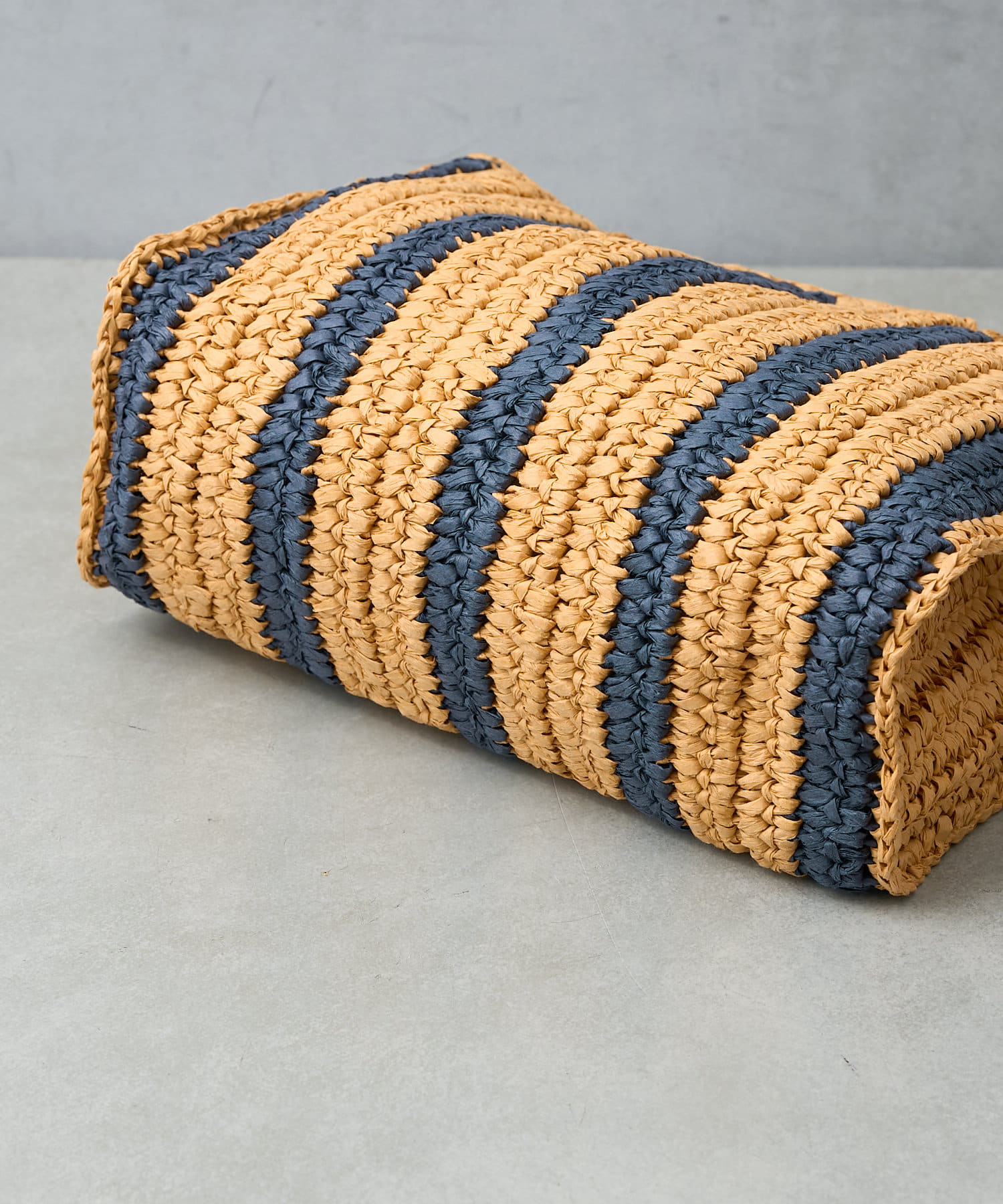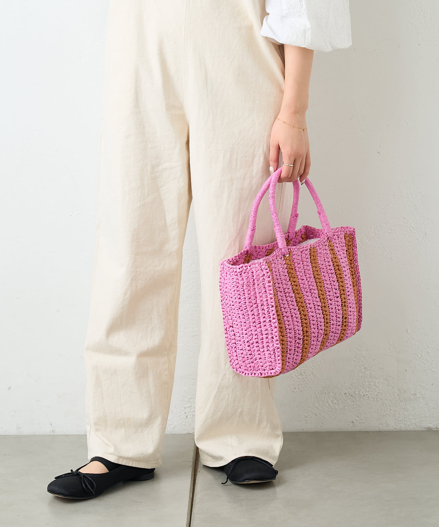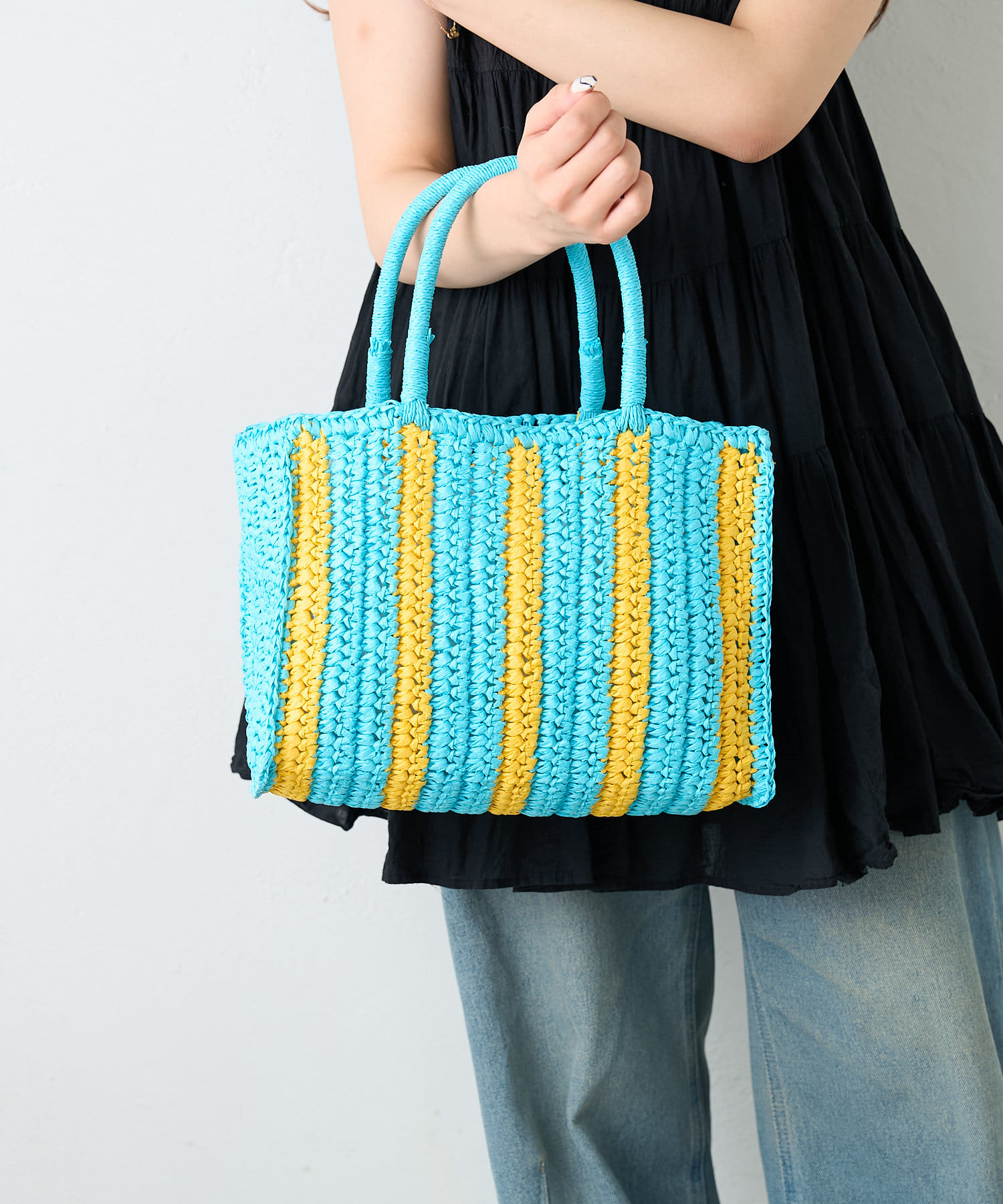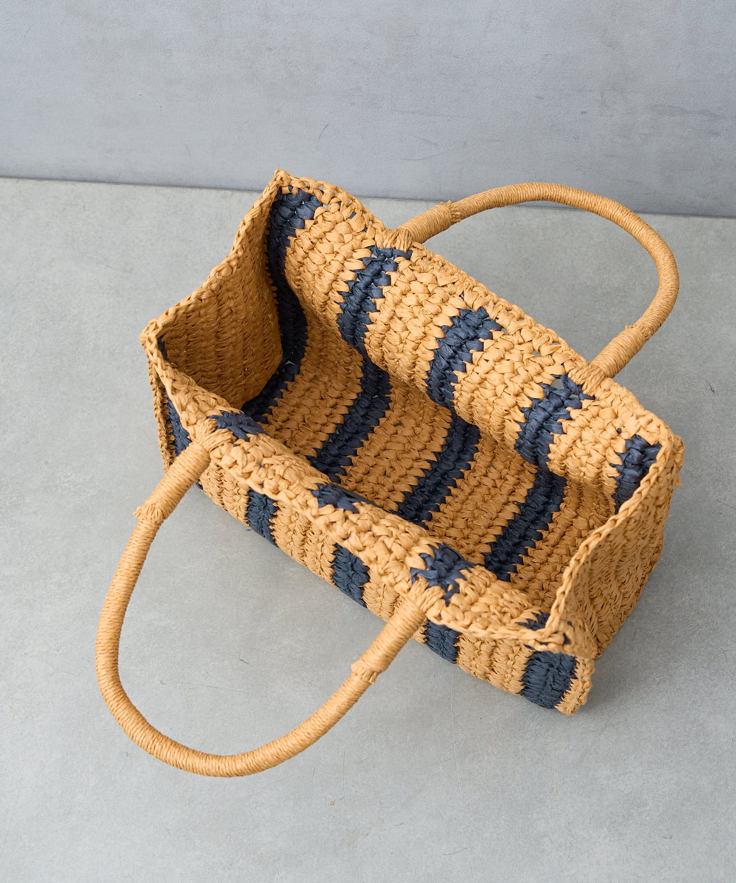 ナチュラルなペーパー素材に、ストライプが映えたトートバッグ。一点一点手編みで丁寧に作られています。
