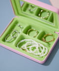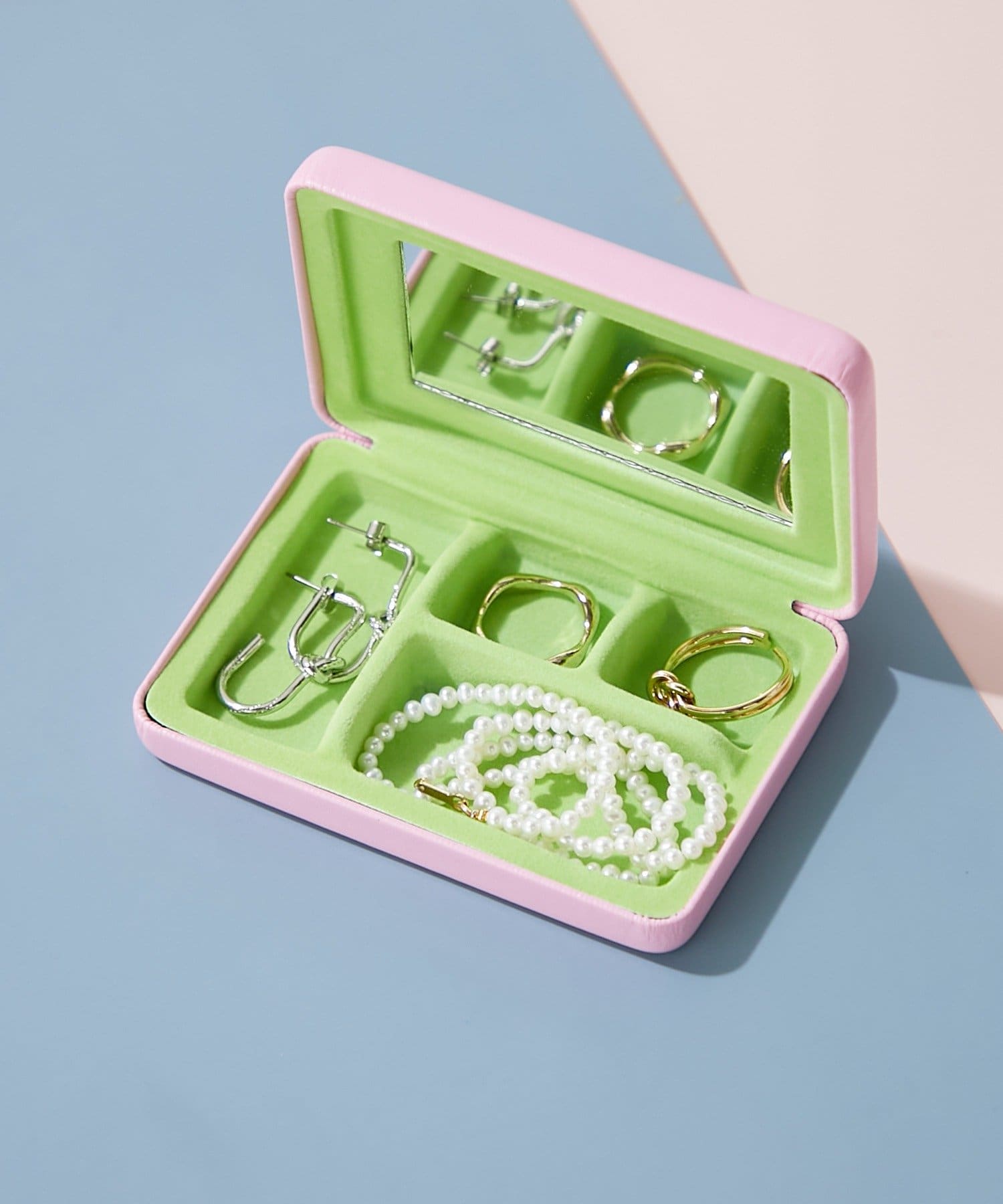 しっかりとしたつくりで、大切なアクセサリーやお薬等細かなものを収納するのにぴったり。ミラーつきなので、メイク直しやアクセサリーをつける際にも便利。