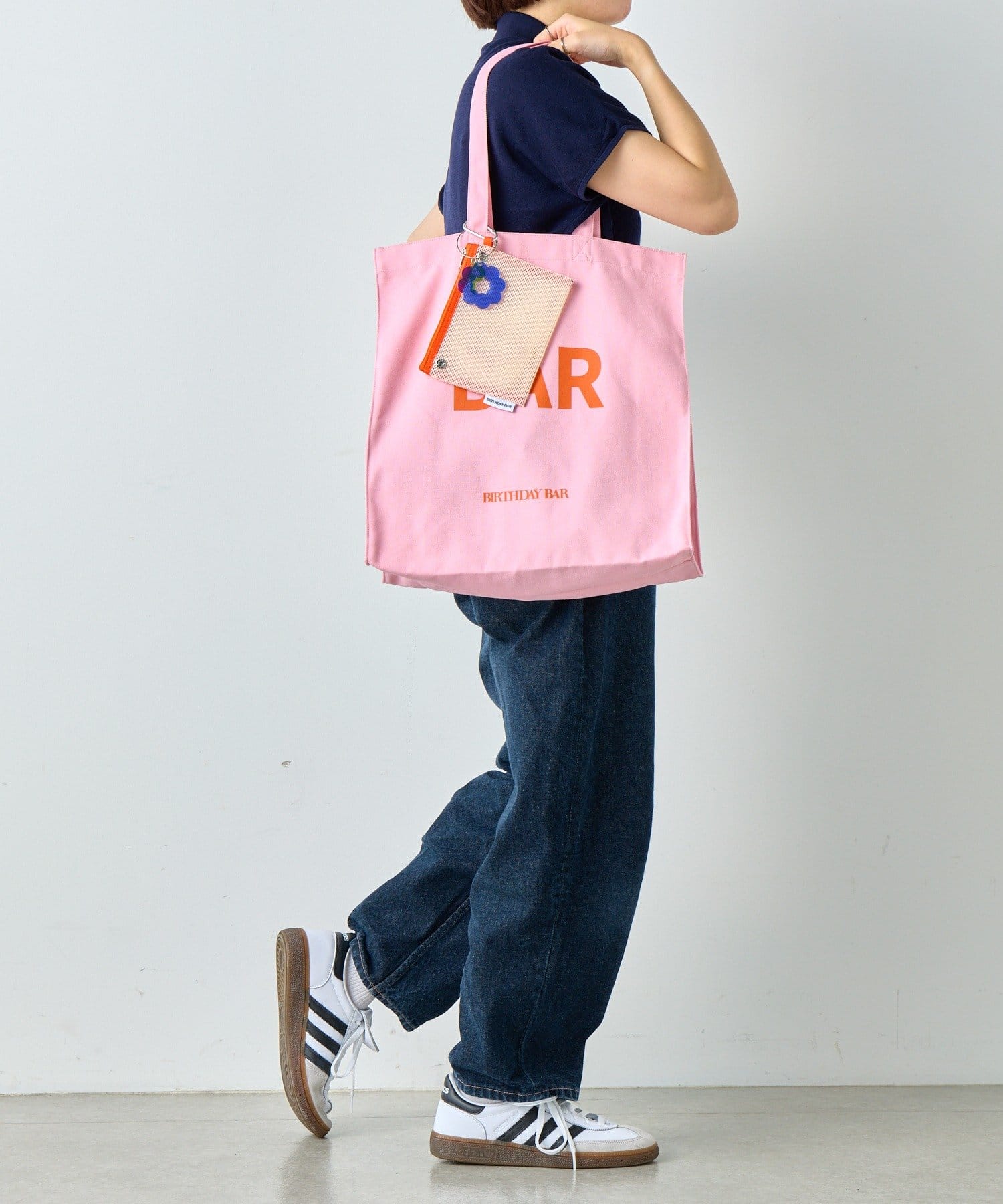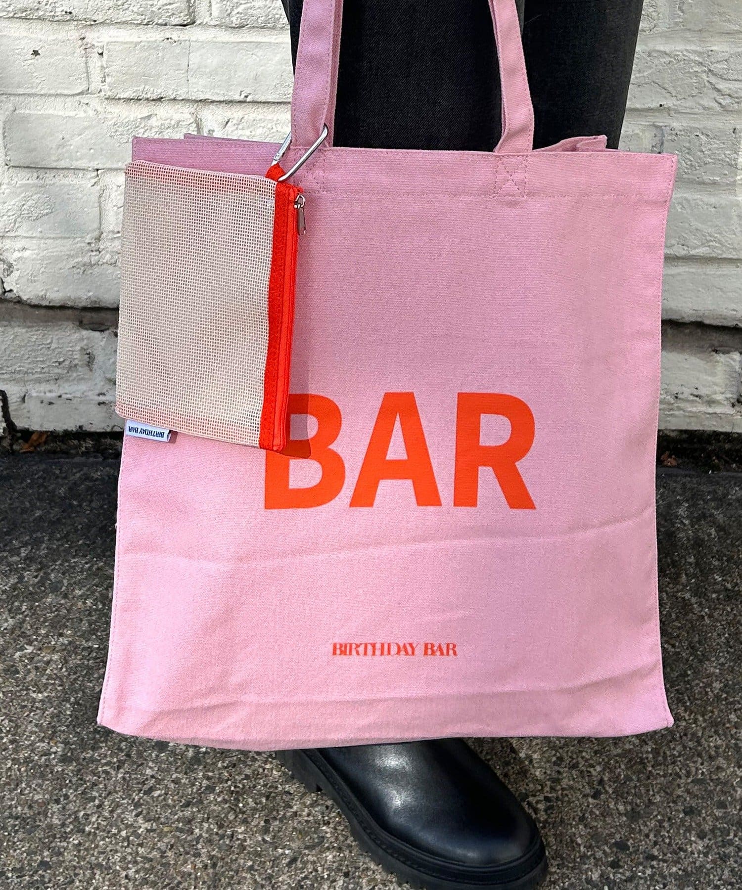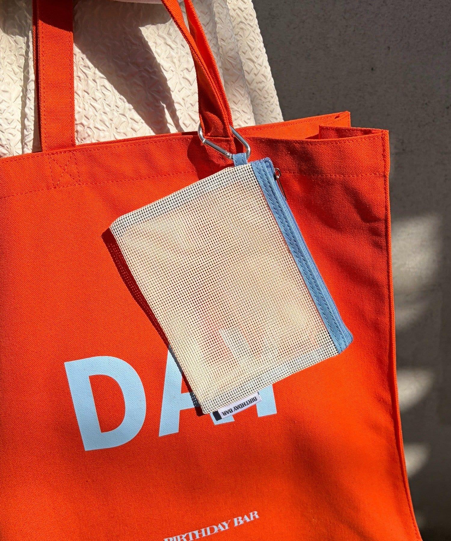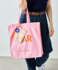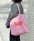 『BIRTHDAY BAR』の「BAR」と「DAY」がデザインされたキャンバス地の大容量トートバッグ。