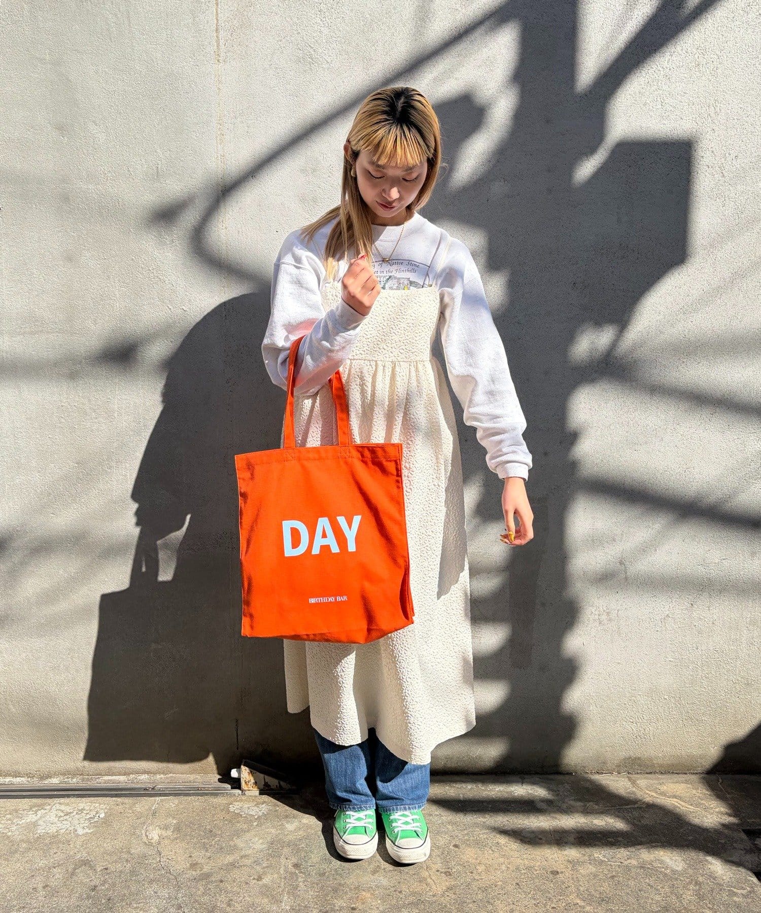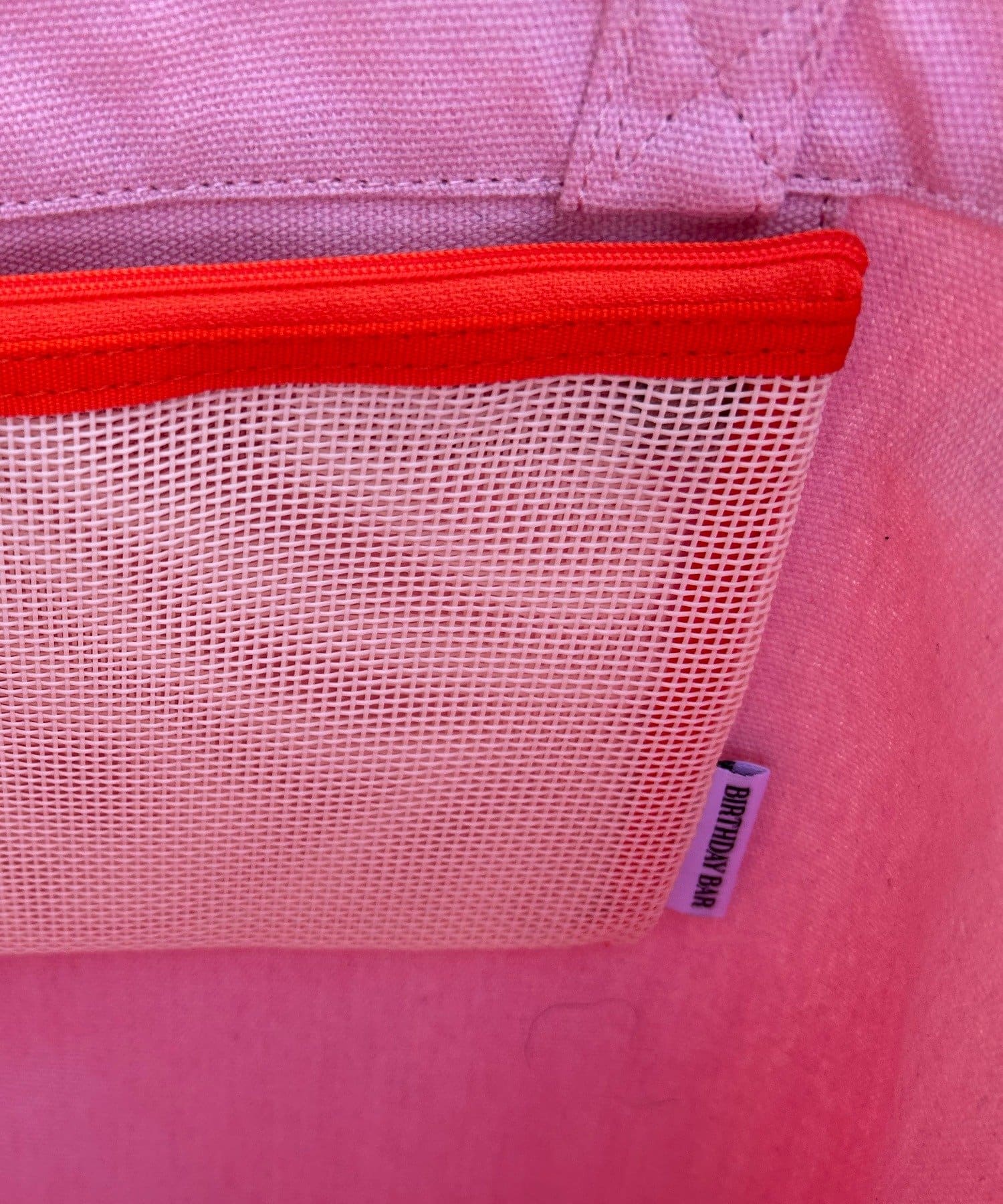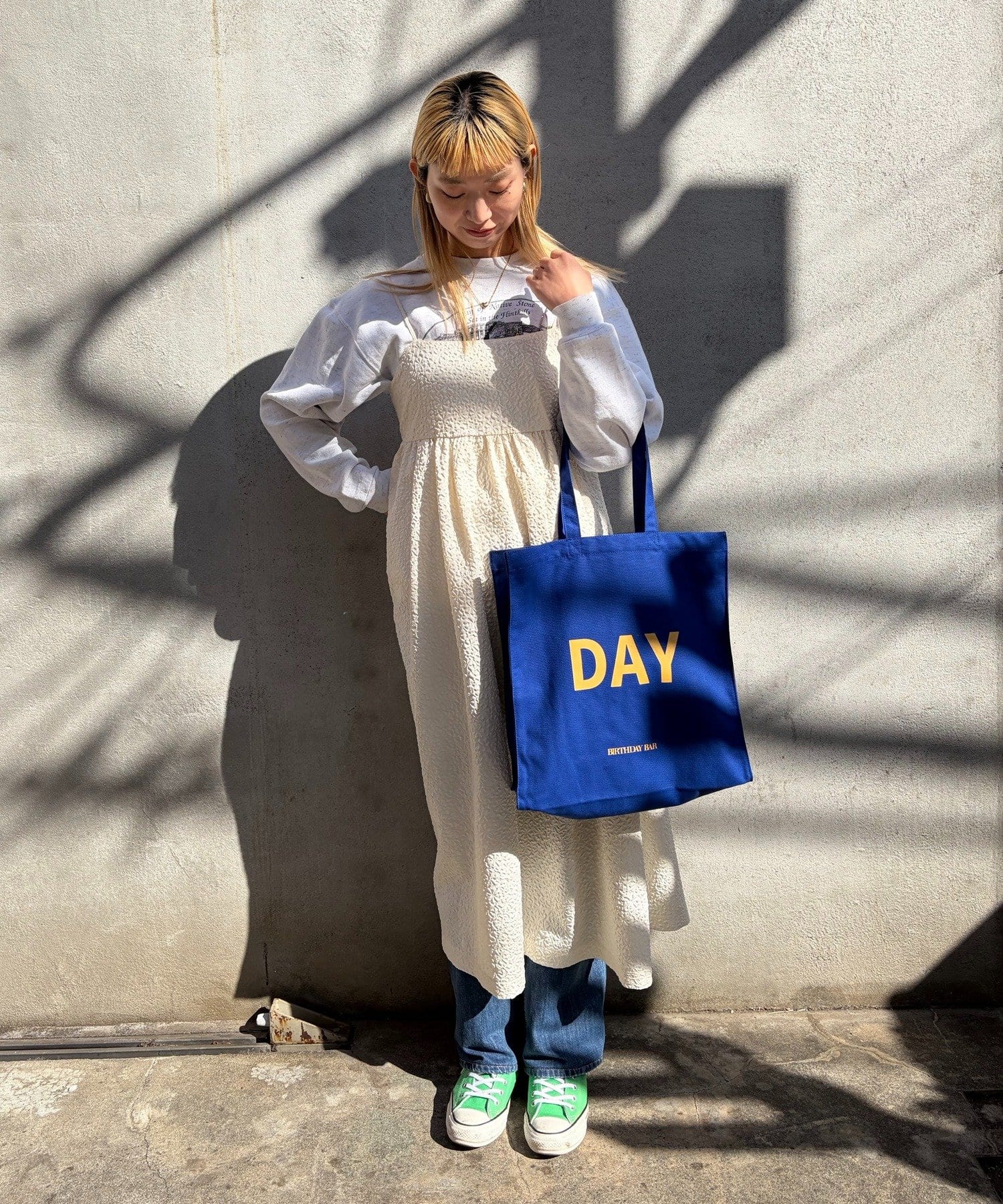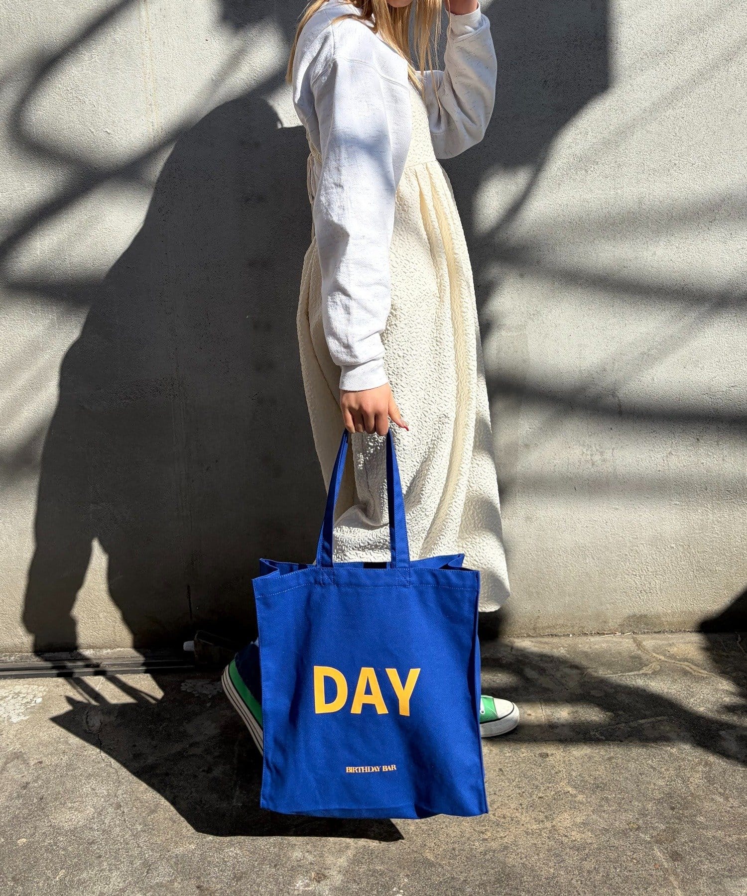 『BIRTHDAY BAR』の「BAR」と「DAY」がデザインされたキャンバス地の大容量トートバッグ。