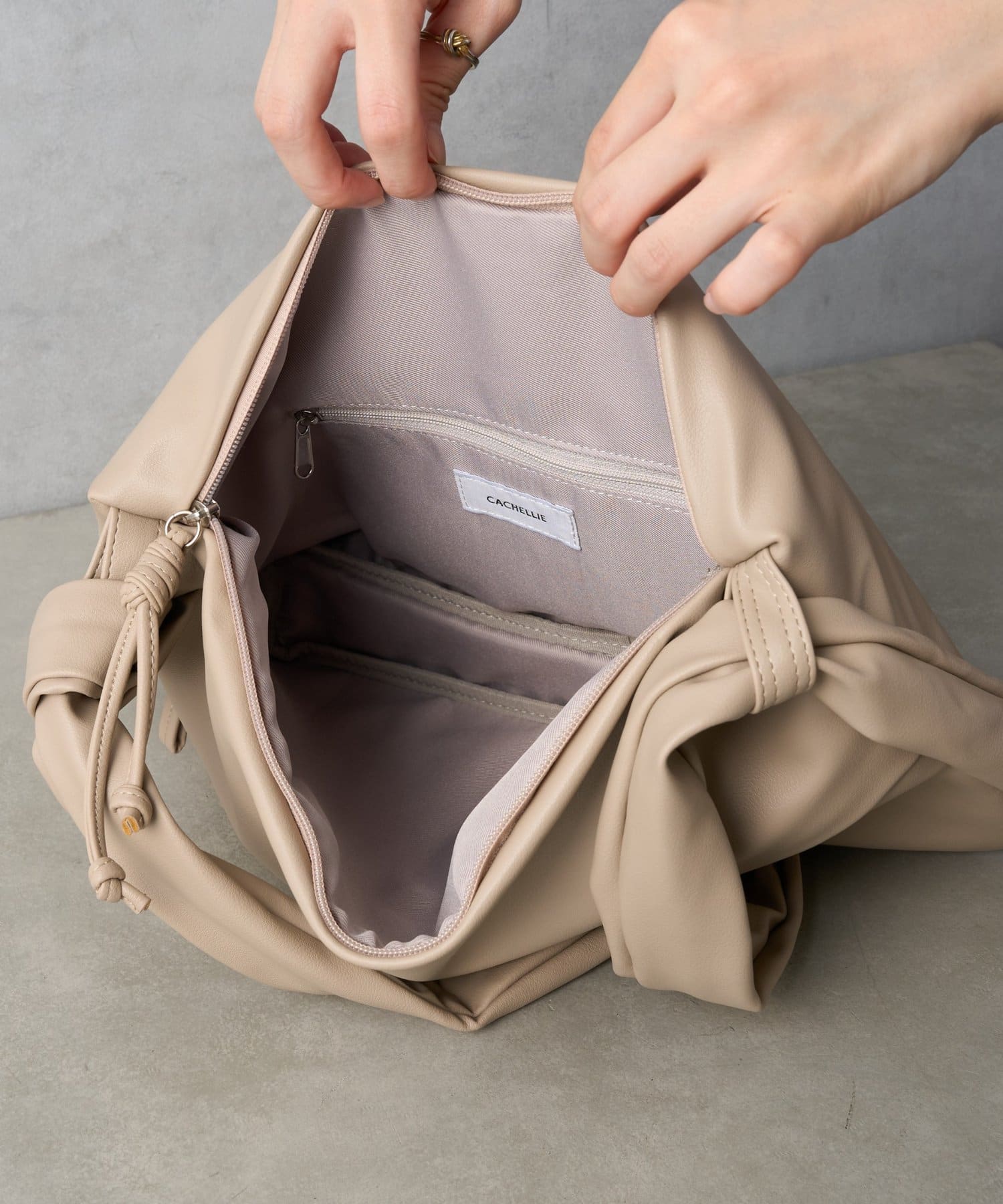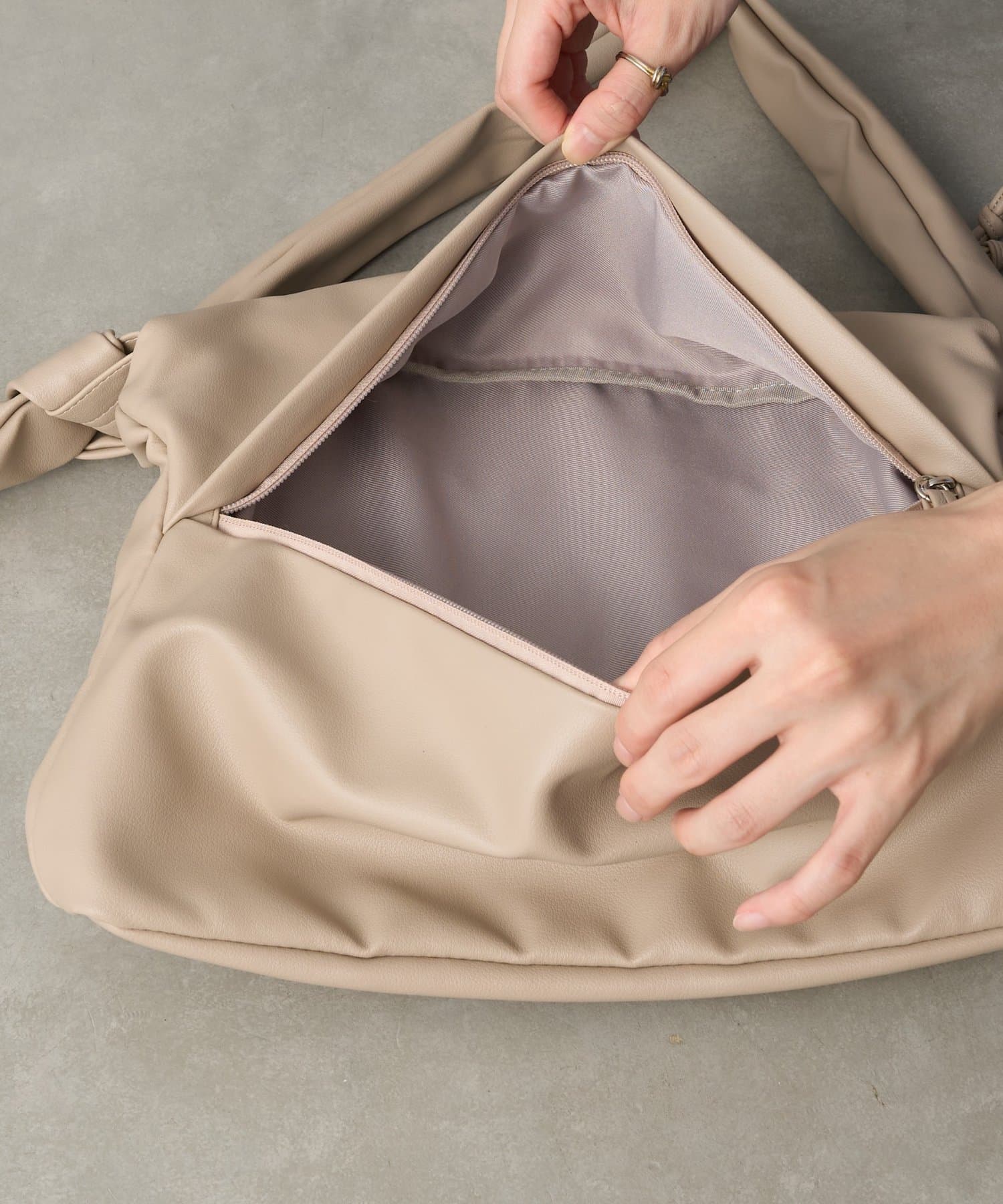 反対側のショルダーをしぼってバッグを縦向きにすると、トレンドの巾着型リュックのようなボンサック風にアレンジすることも可能◎