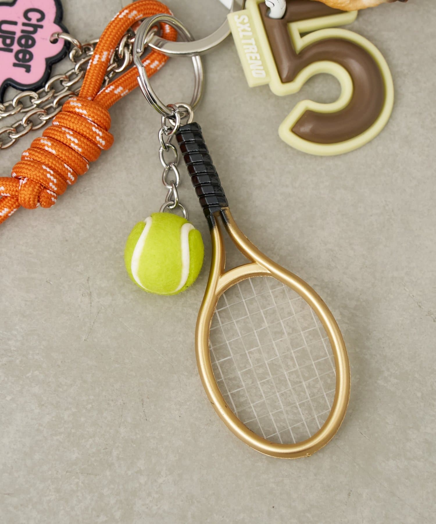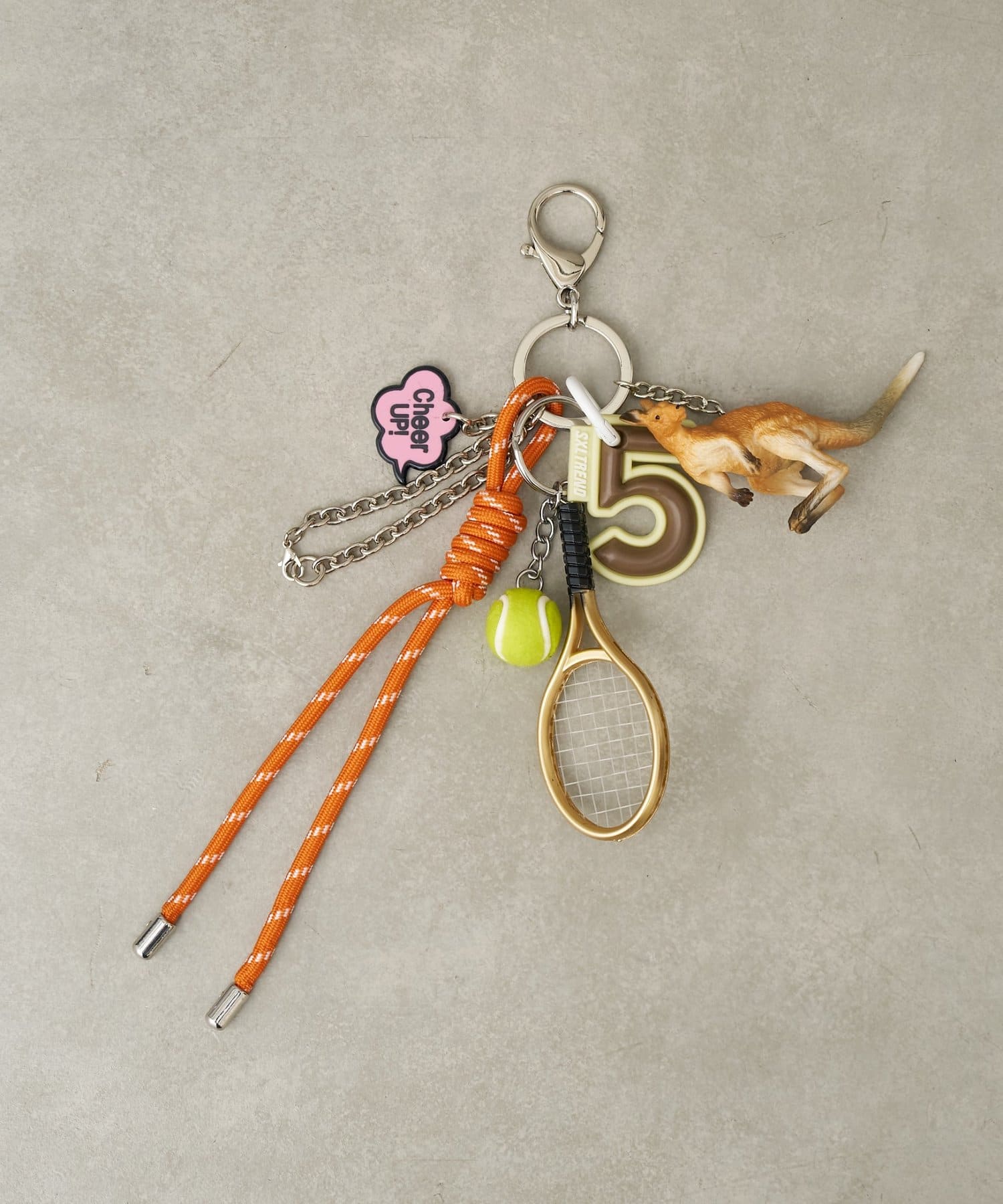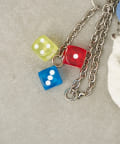 アニマル、ハート、サイコロ、テニスなどの楽しいパーツがたくさんついた、ジャラジャラとボリュームのあるチャーム。