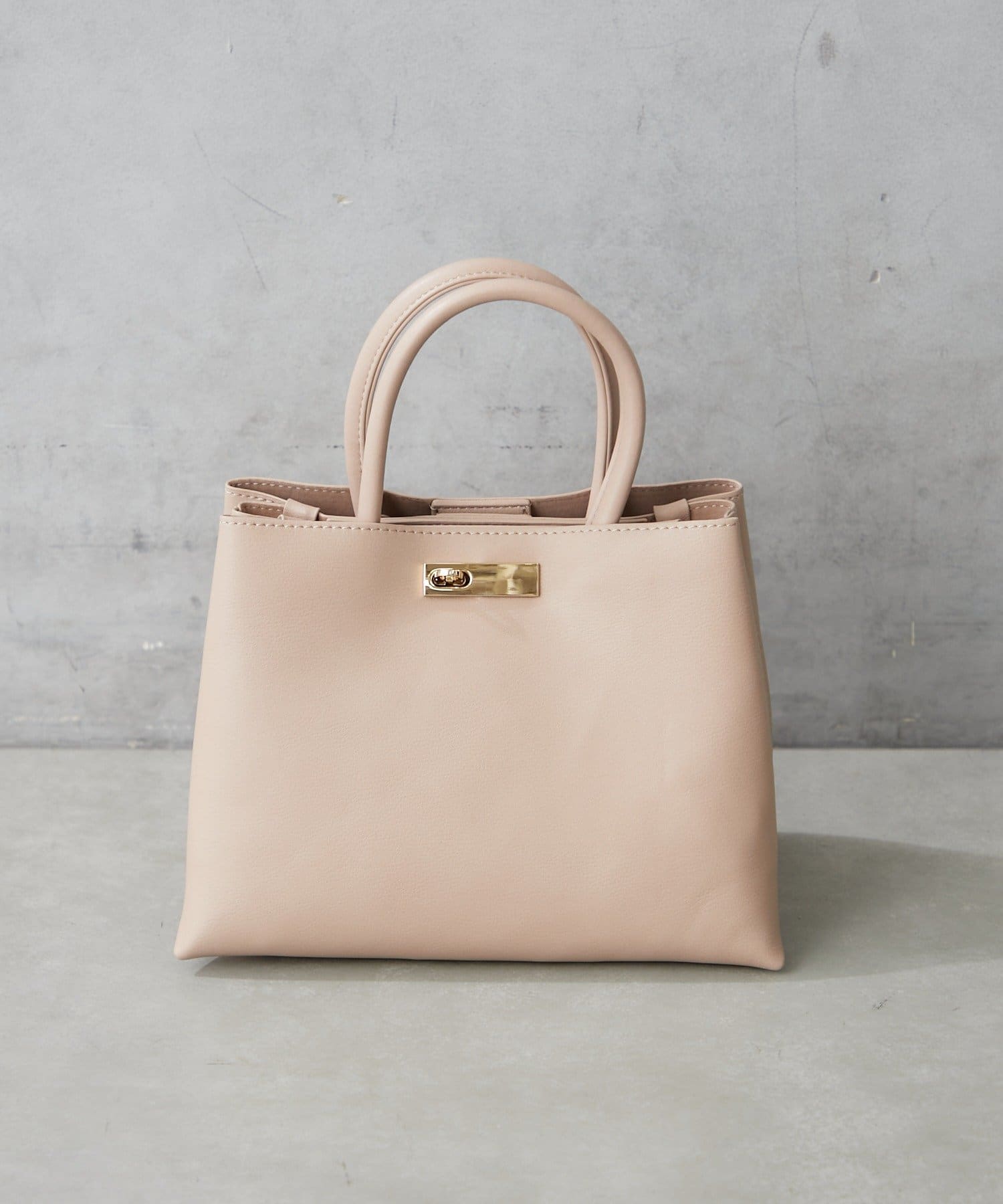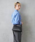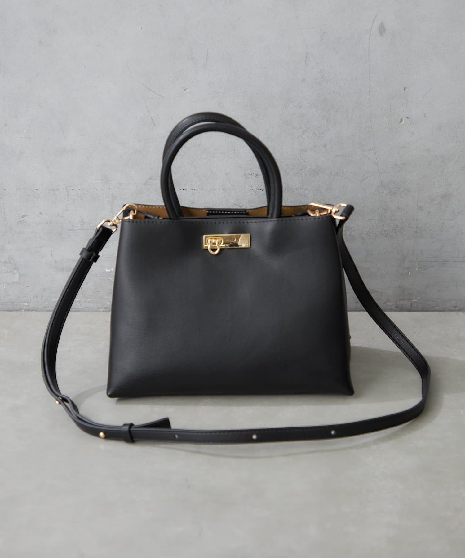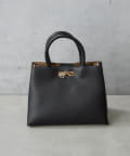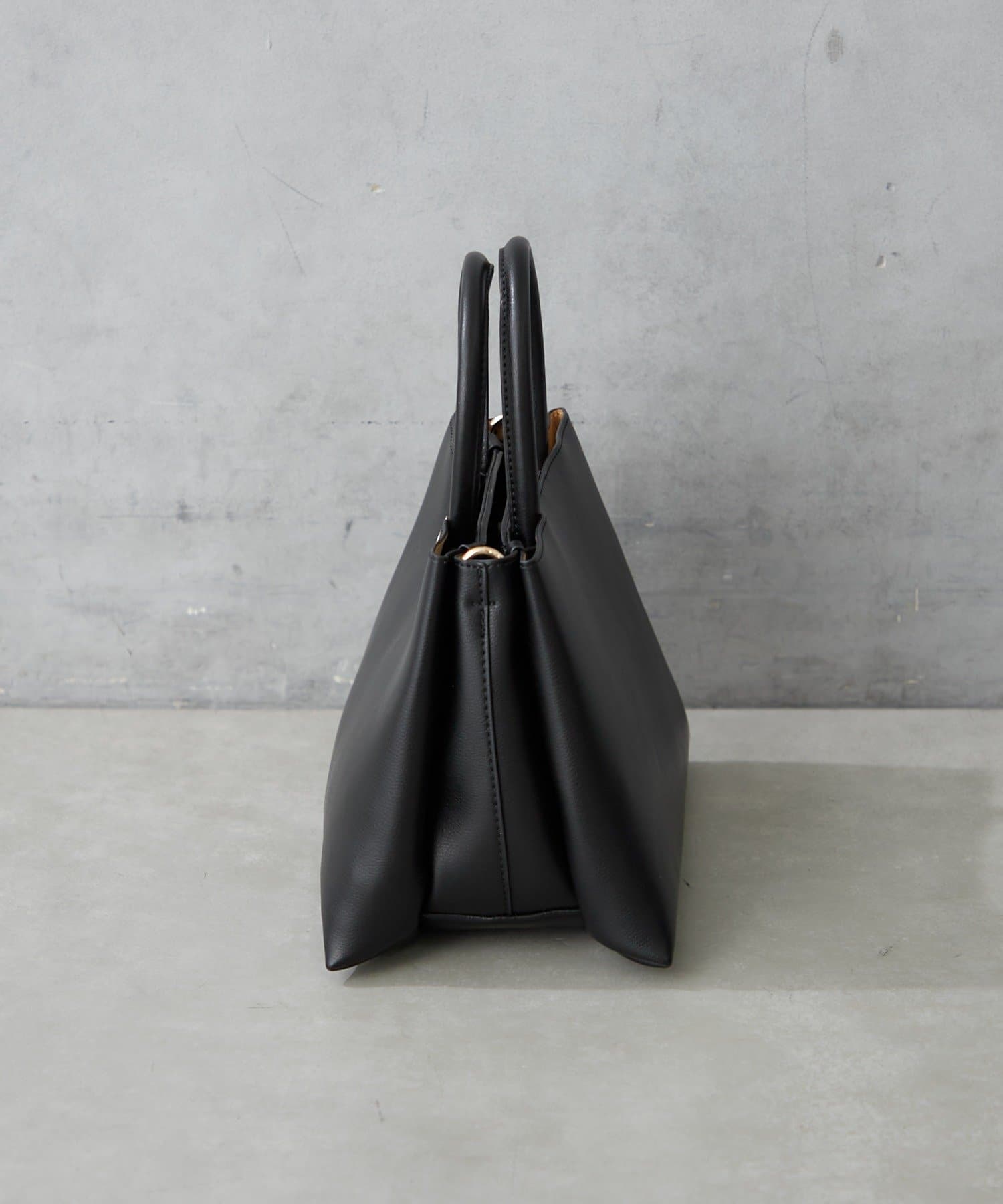 シンプルボディーに高級感のあるアシンメトリーなゴールド金具がワンポイントのハンドバッグ。