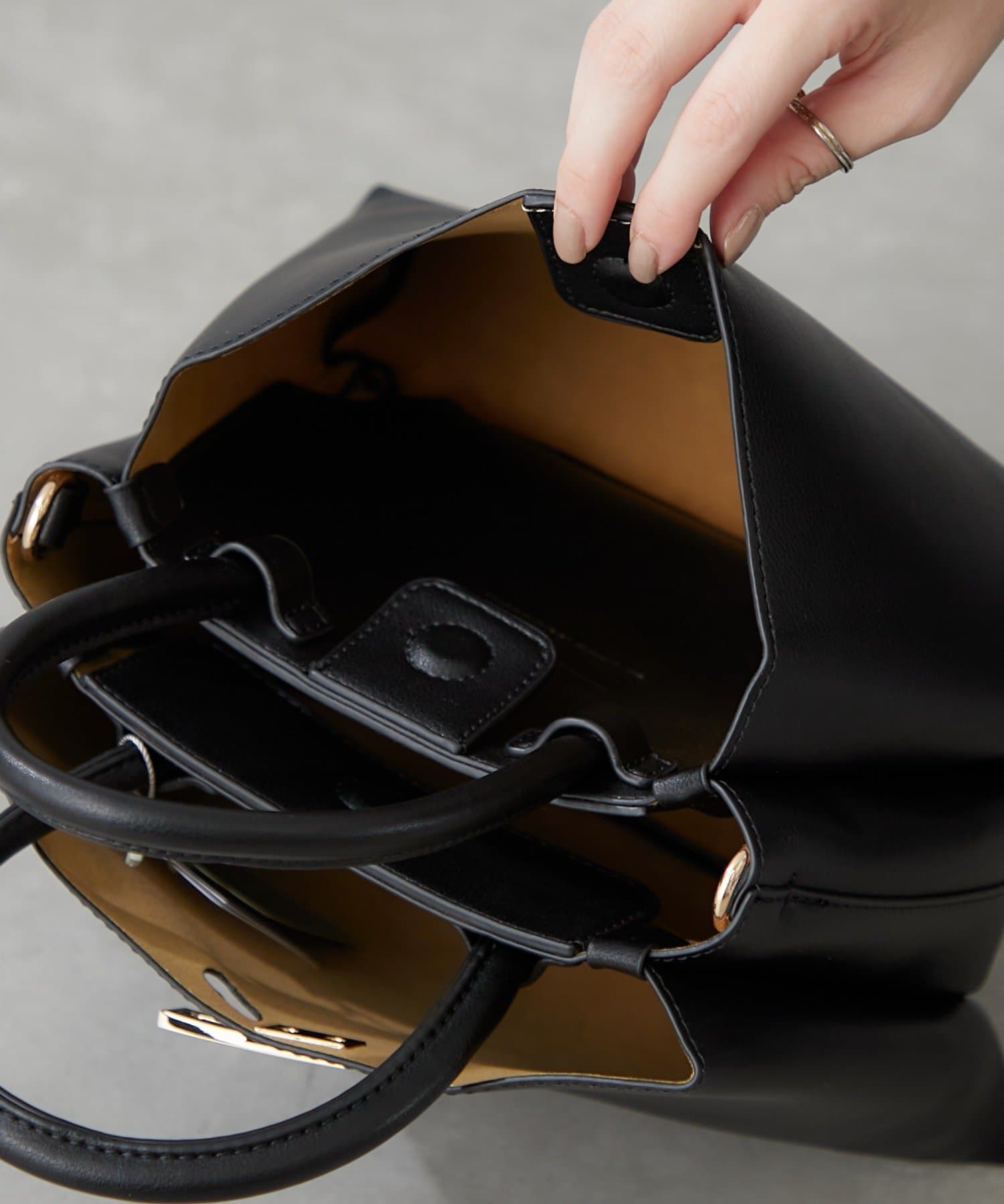 内側はバッグの中身をすっきり整理でき、取り出したいものがすぐに見える三層構造になっており、