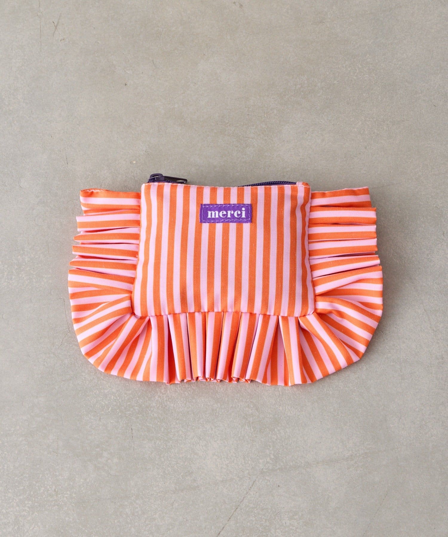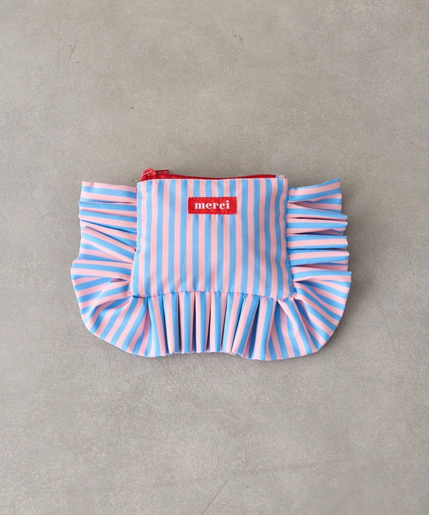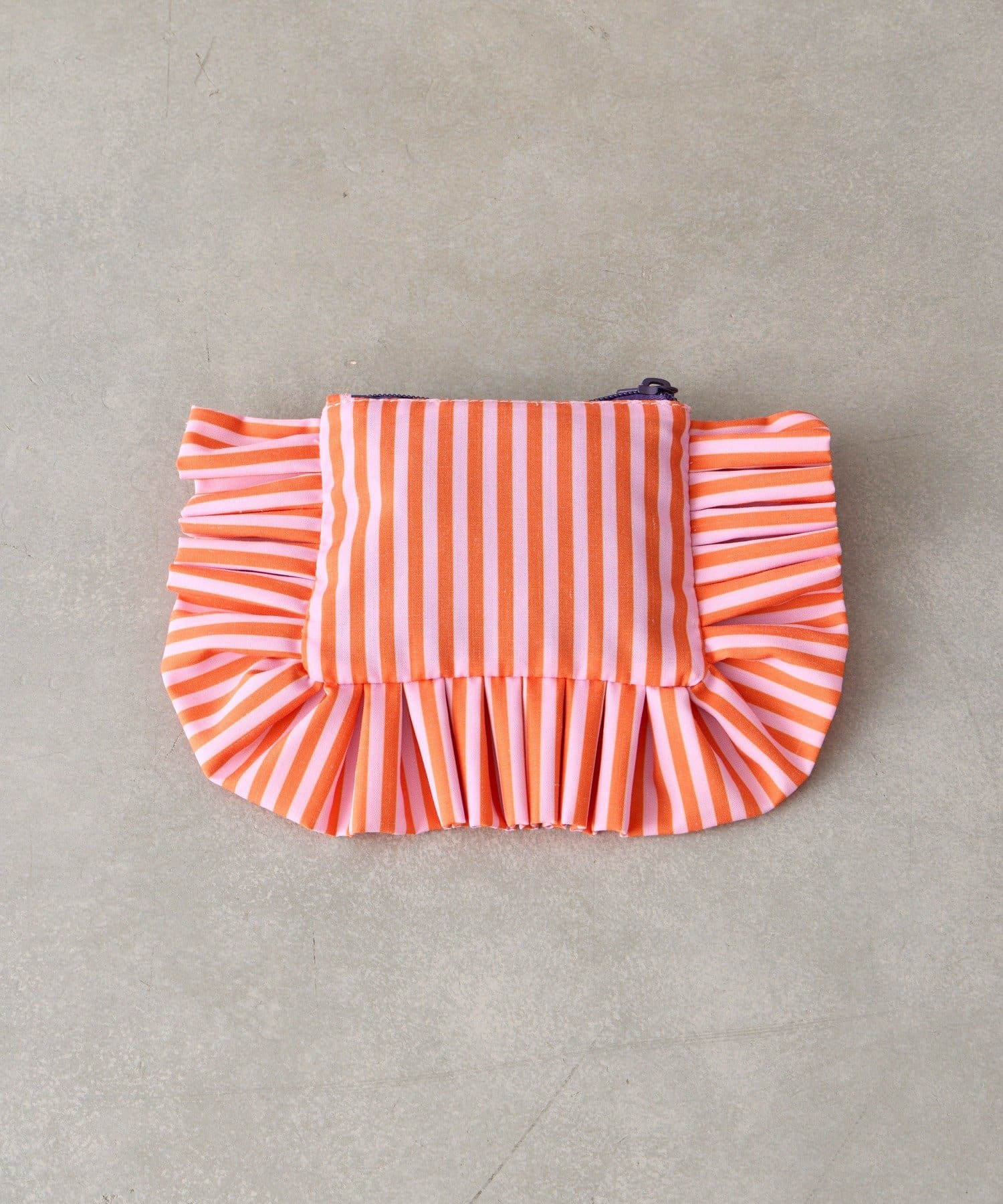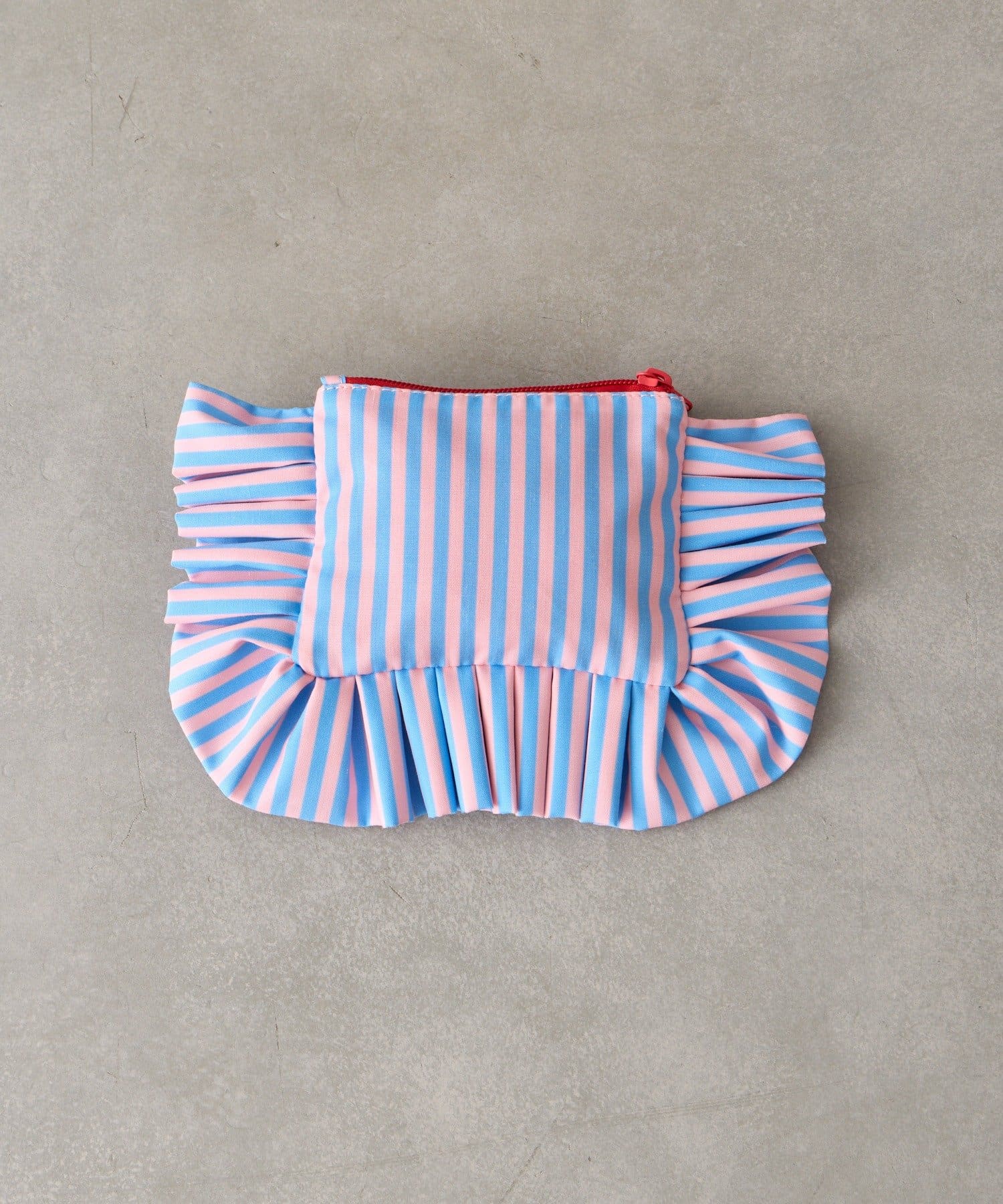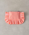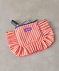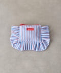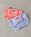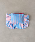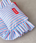 大きなフリルとカラフルなストライプ柄が乙女心くすぐるポーチ。