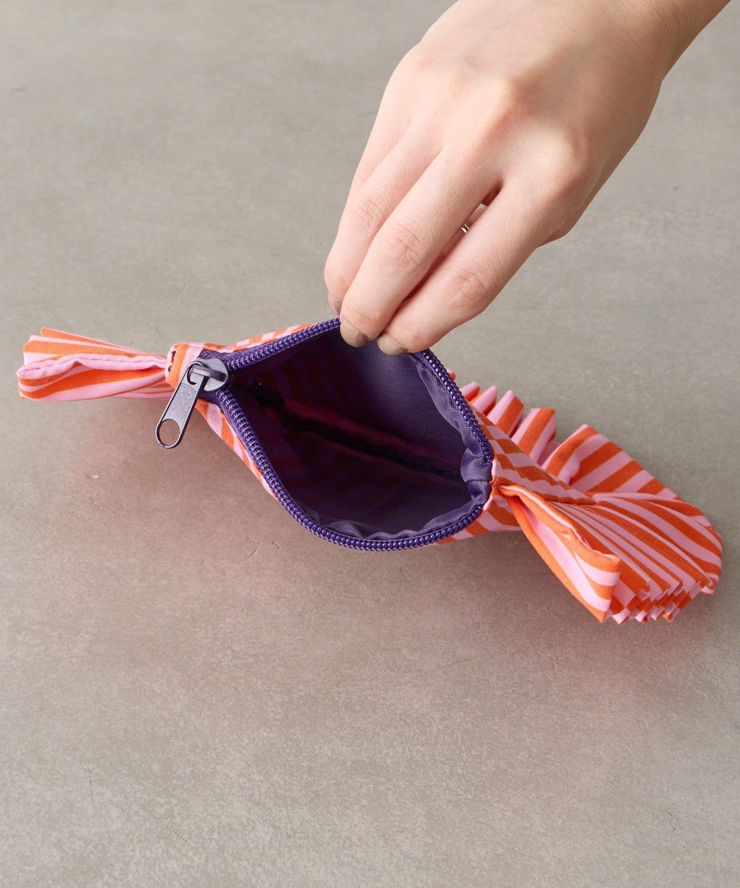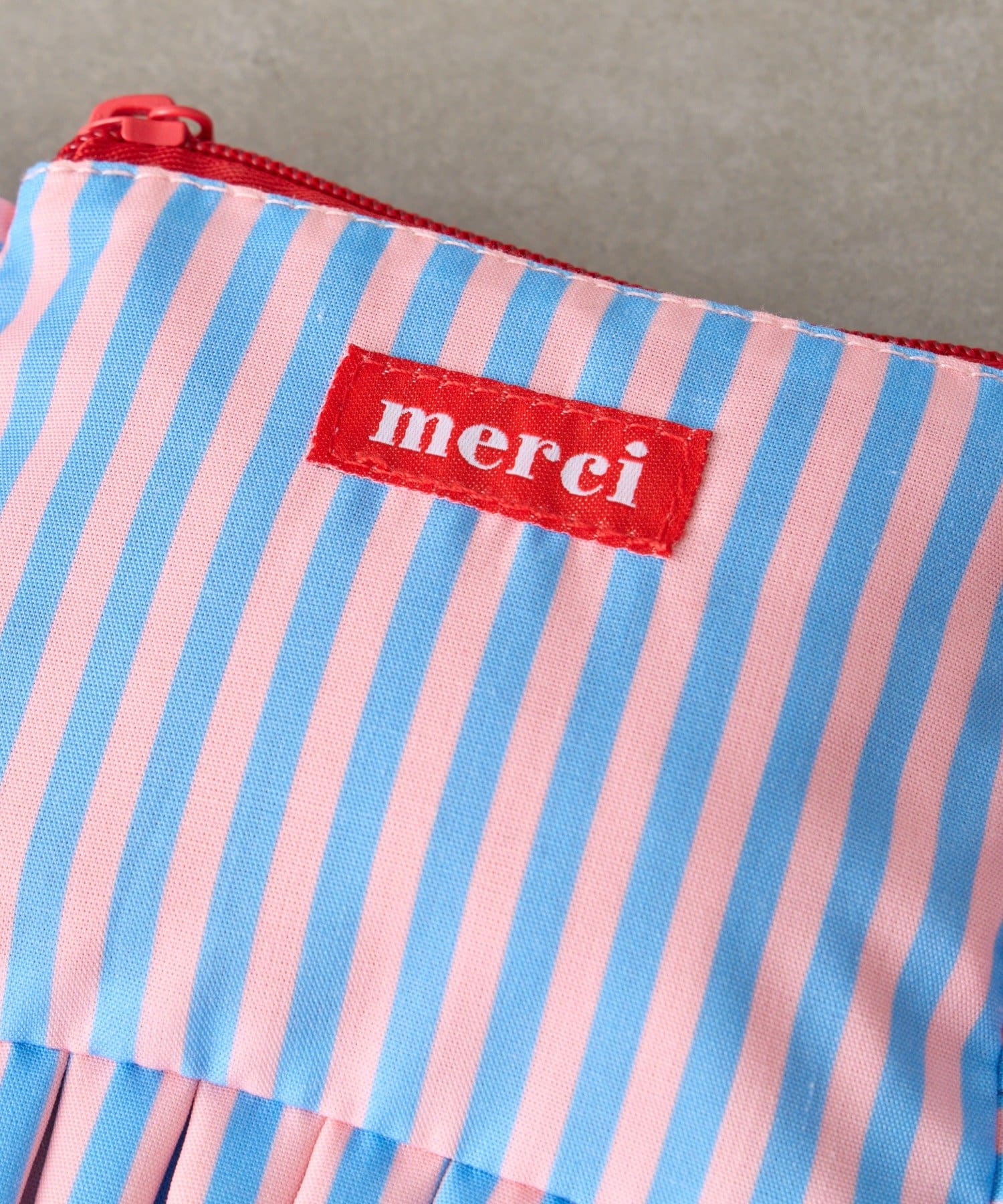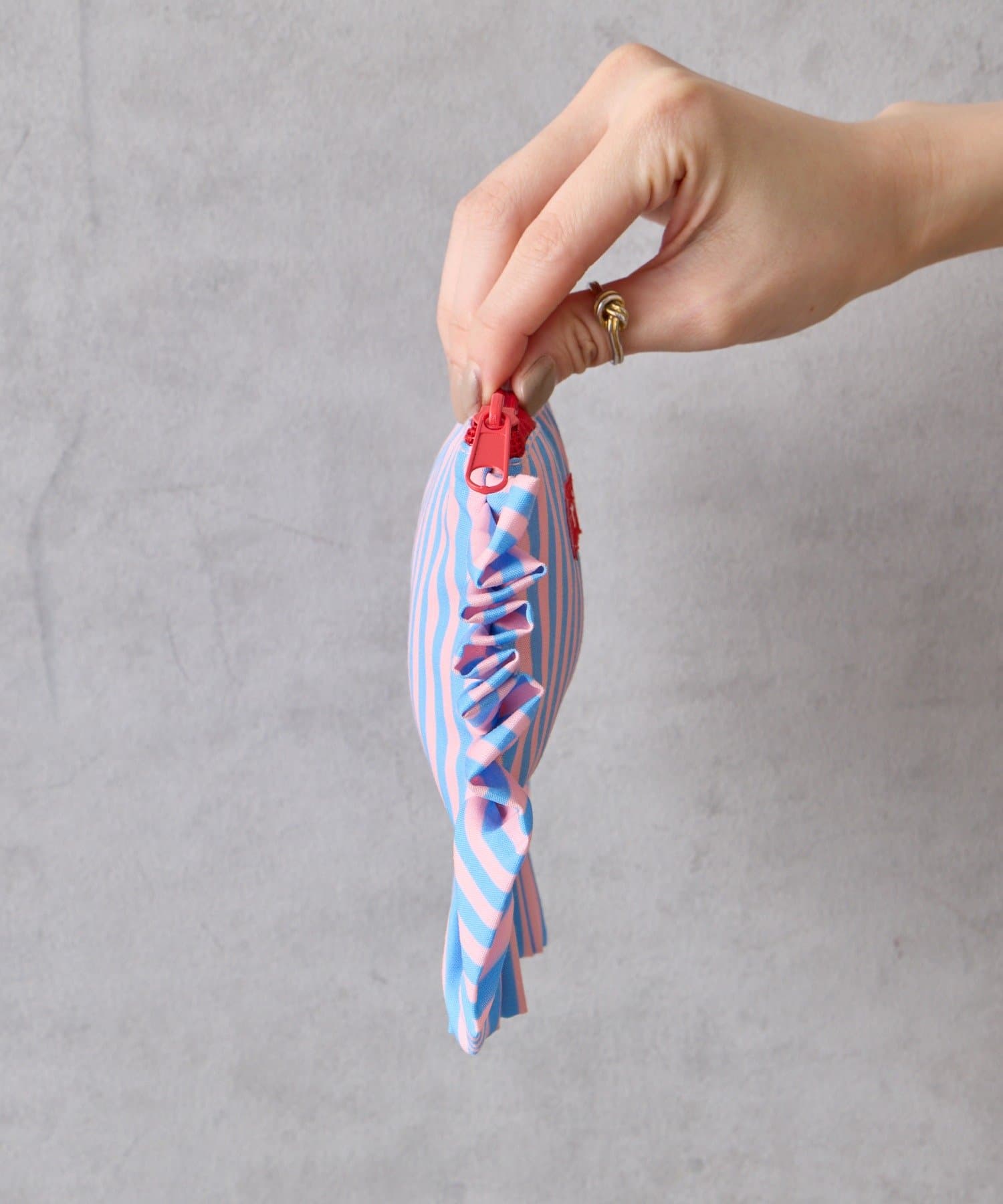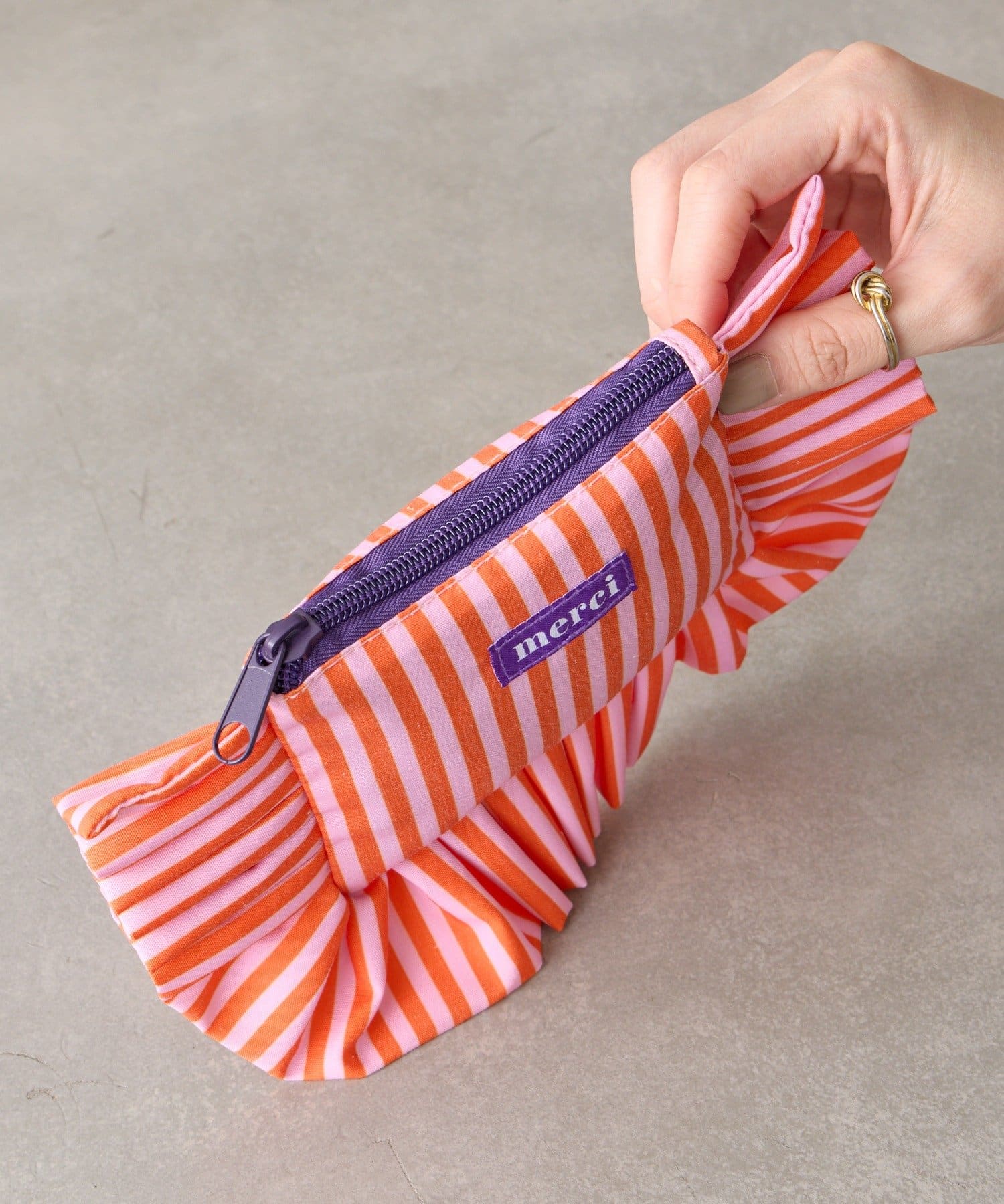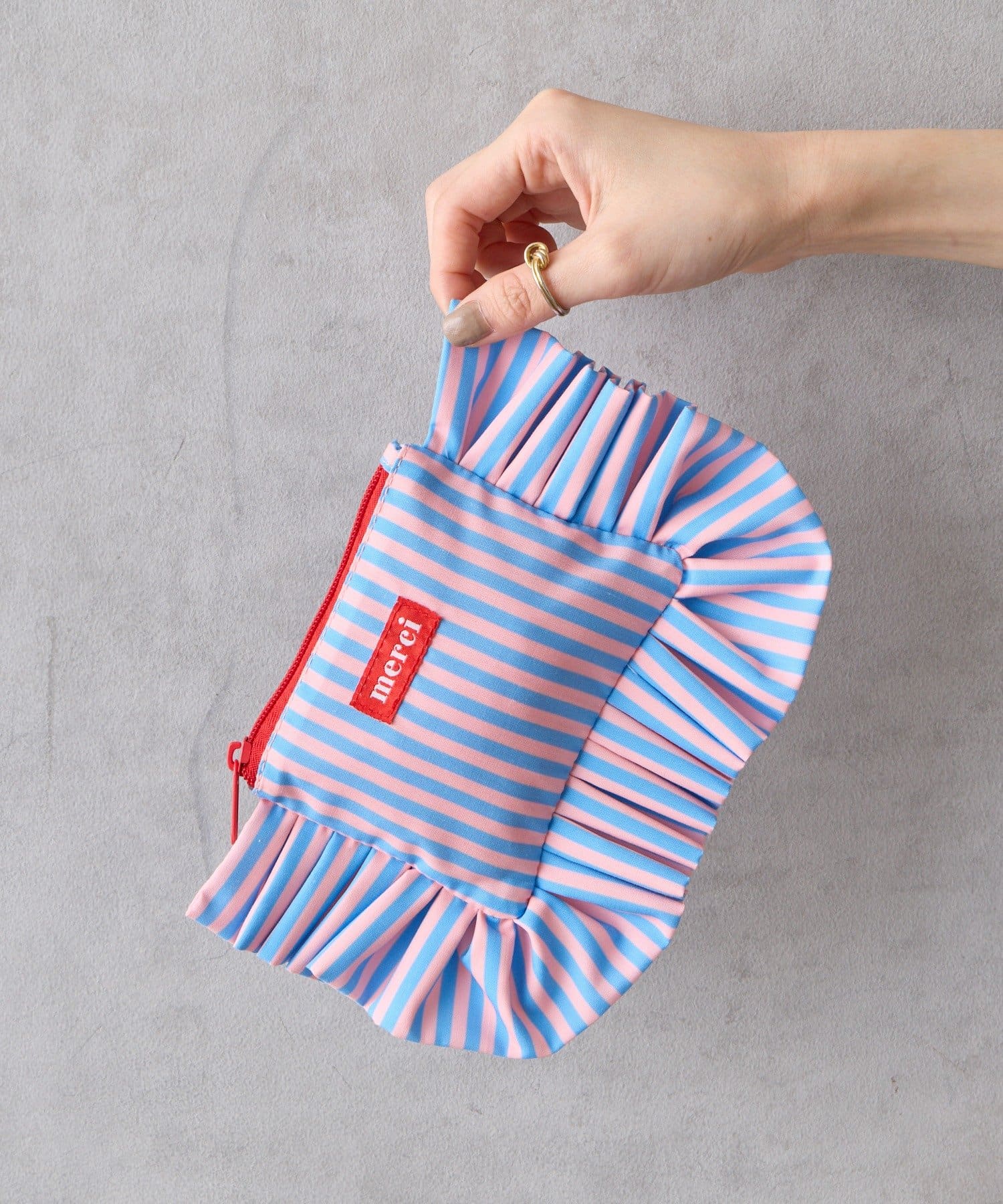 大きなフリルとカラフルなストライプ柄が乙女心くすぐるポーチ。