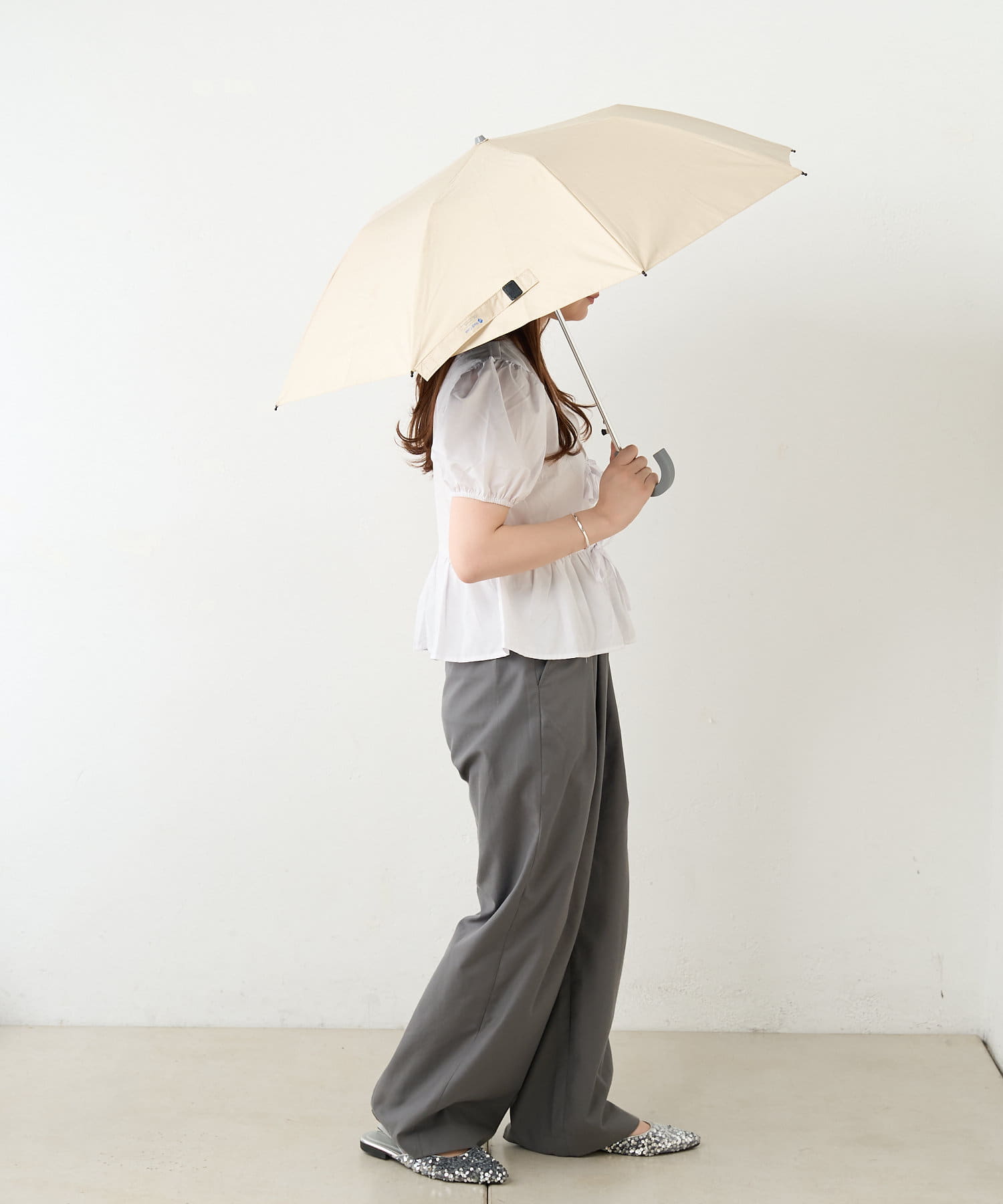 マットな質感の手元は、腕やバッグにかけられる曲がり形状でしっかり握れるため、ふらつきにくく安定して使っていただけます。