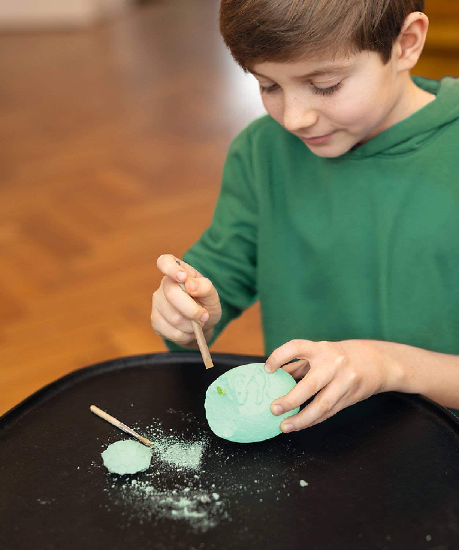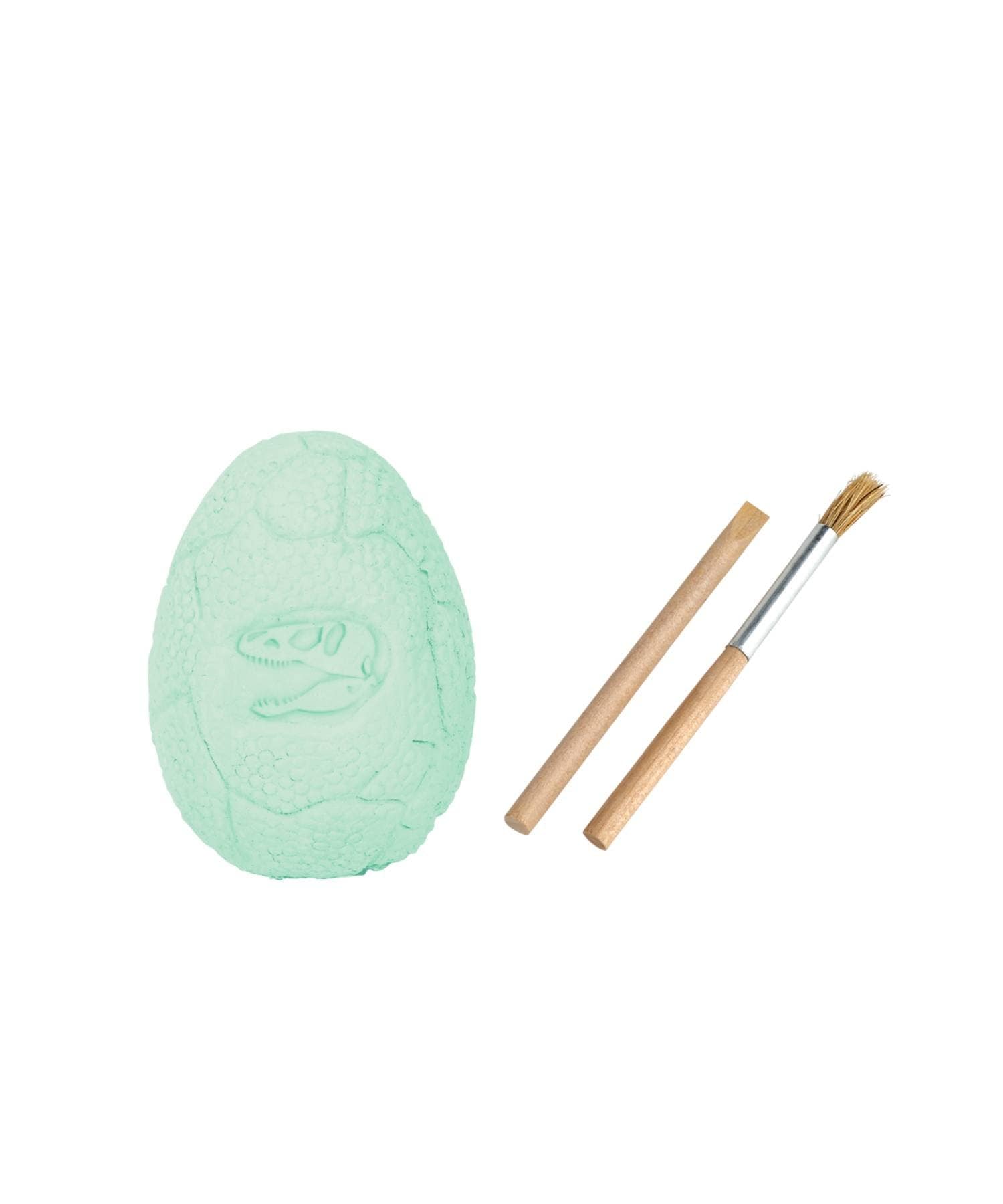 タマゴの形をした石膏を付属のツールで削り、中に埋まっている恐竜を発掘するおもちゃ。恐竜は蓄光なので暗闇で光ります。