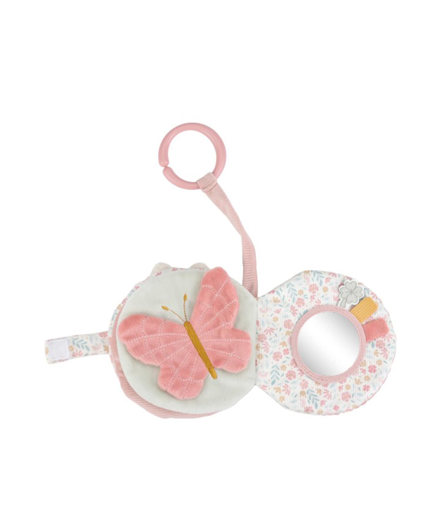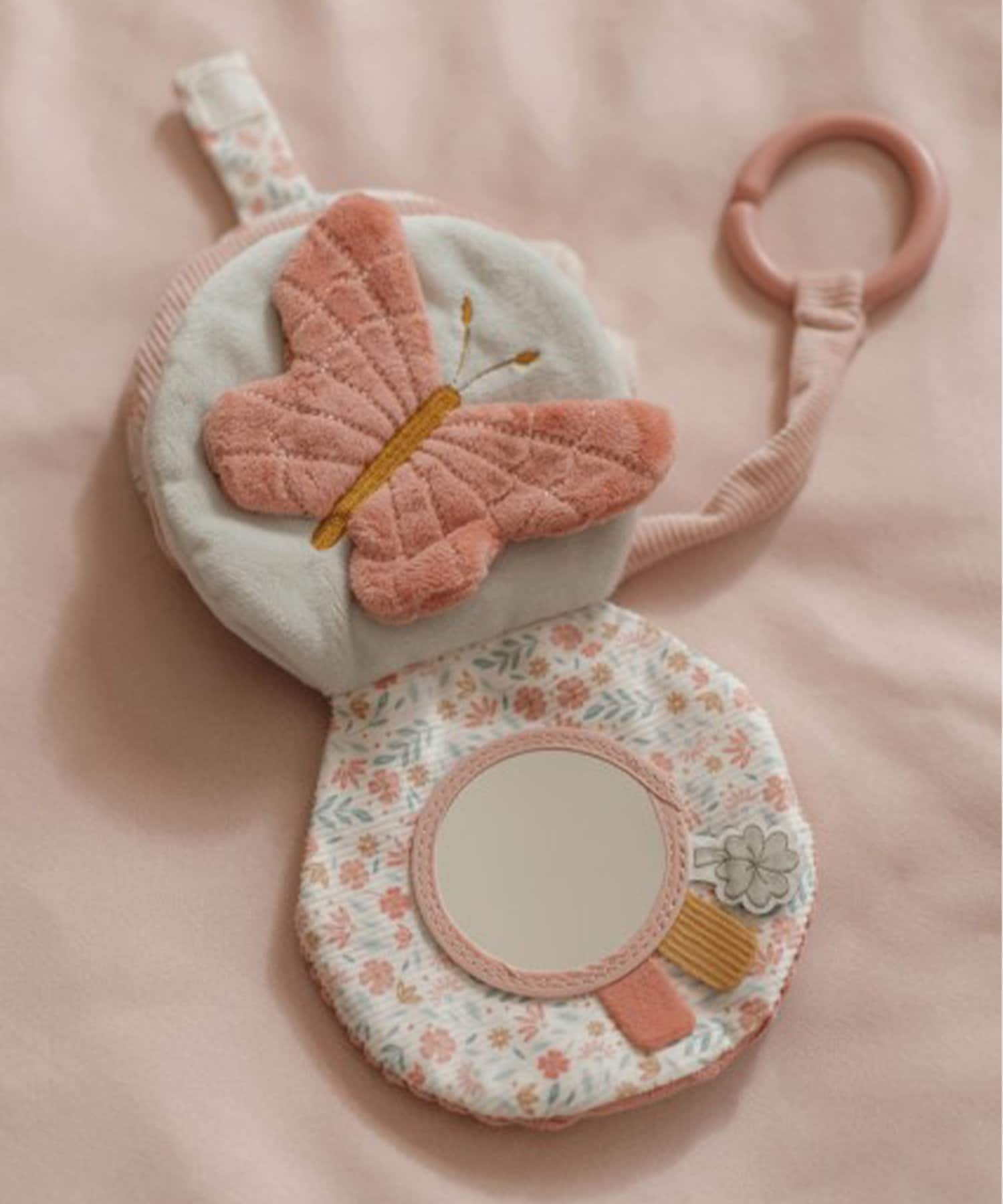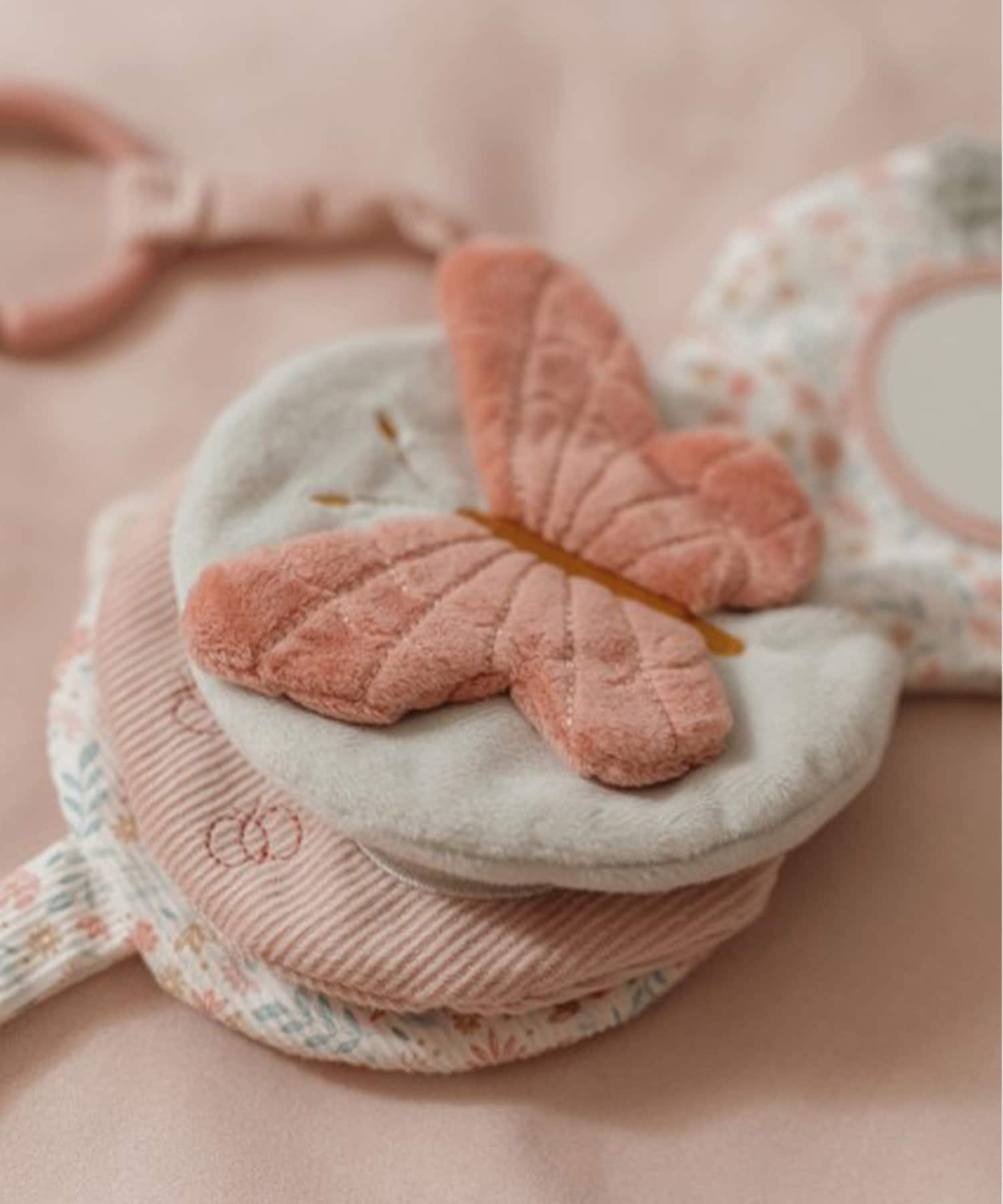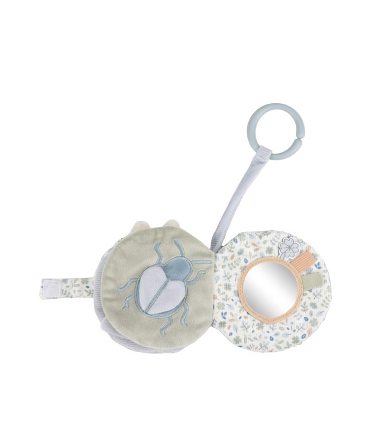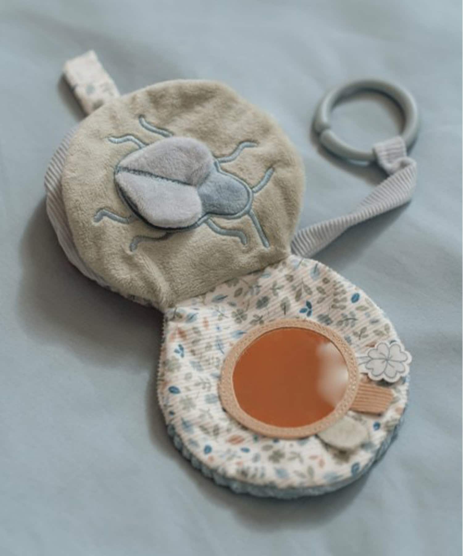 楽しいラベルやカシャカシャの手触り、音が特徴で、お子さまの感覚を刺激します。さらに自分探しができるミラーと、やわらかなミッフィー付き。