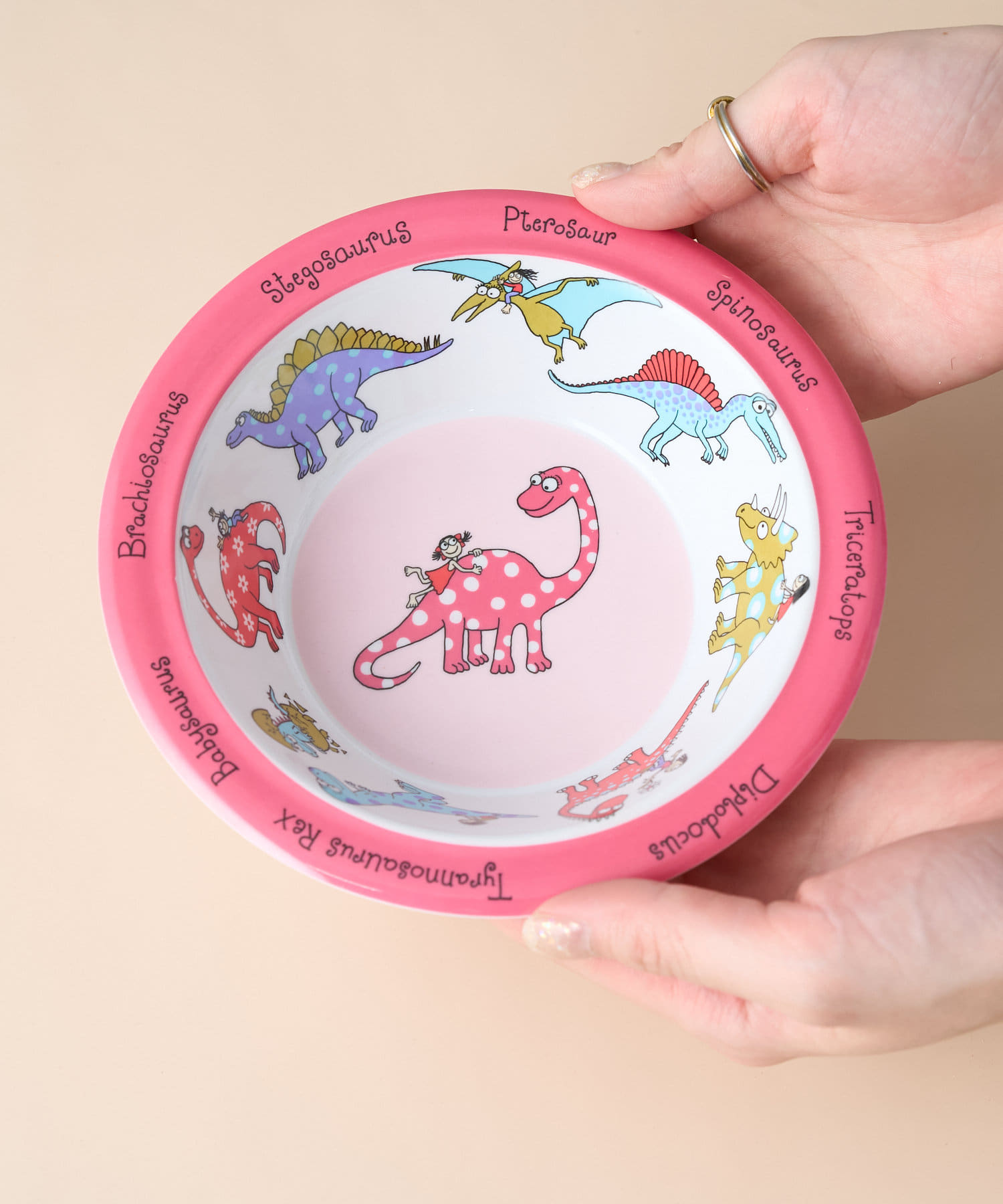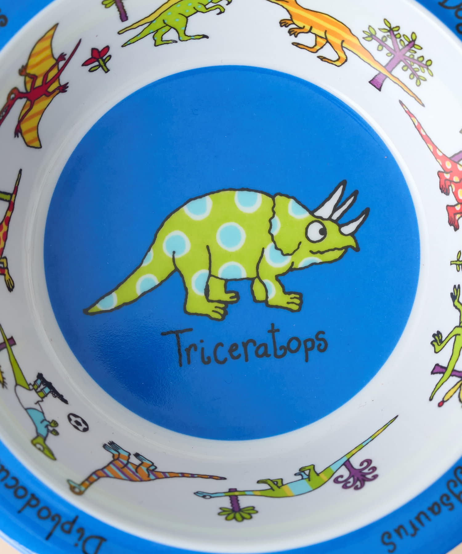 様々な恐竜が描かれた、ポップなカラーのボウル。