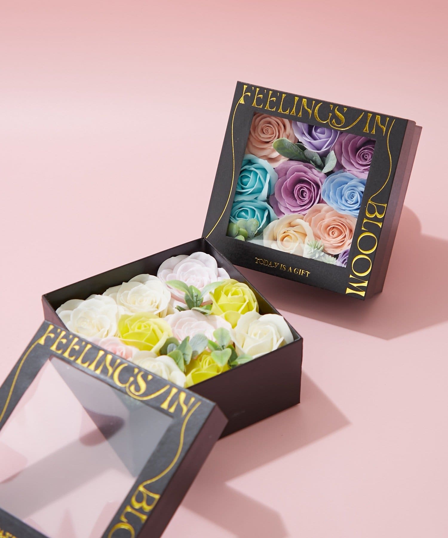 箱を開けた瞬間に広がる華やかさと優しい石けんの香りが、