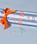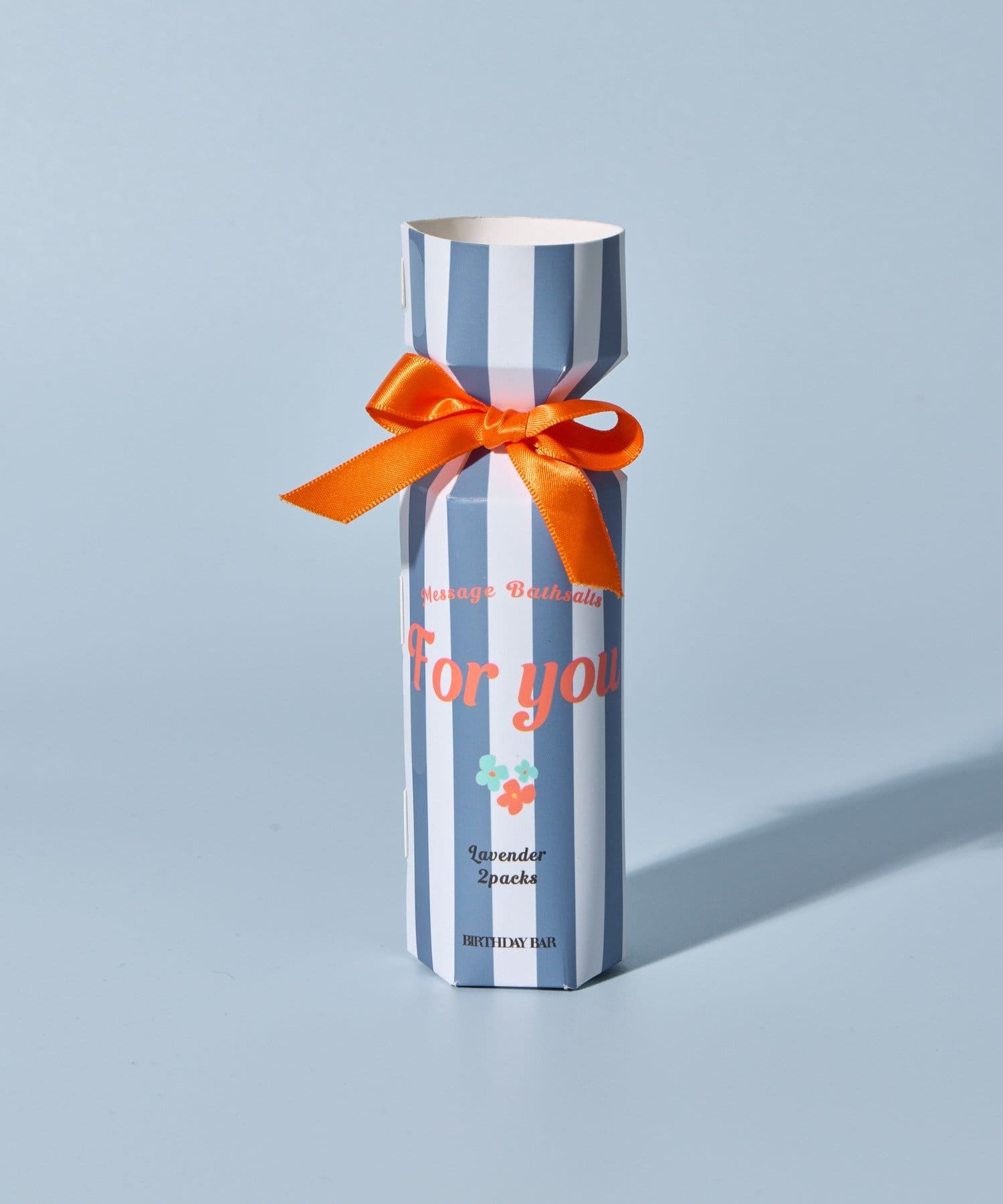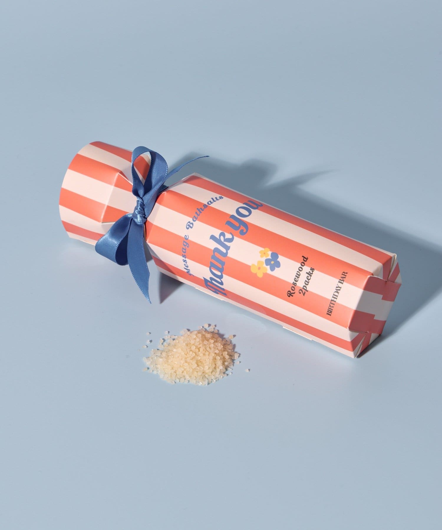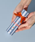 鮮やかなストライプデザインにリボンをあしらった、ギフトにぴったりのバスソルト。