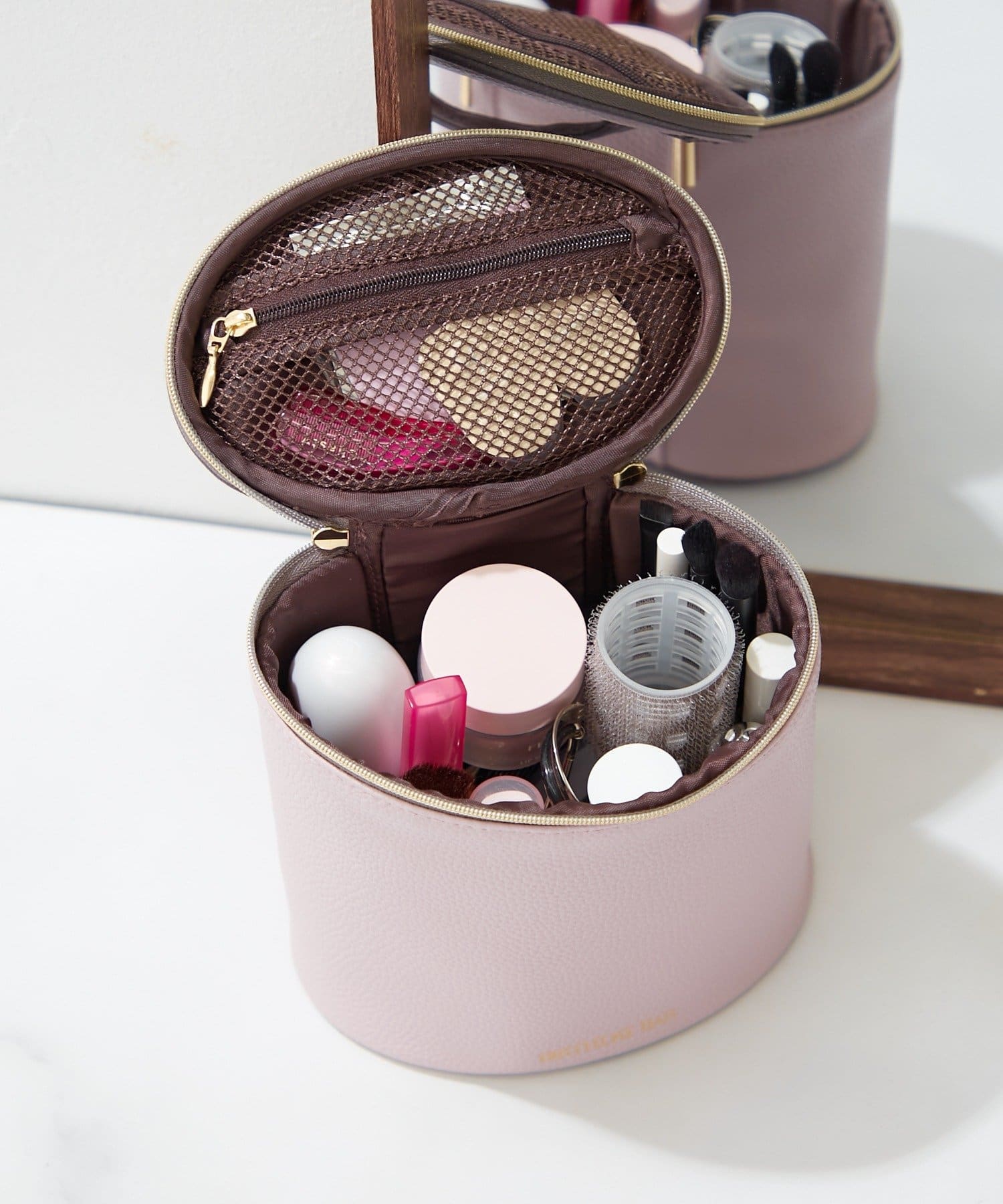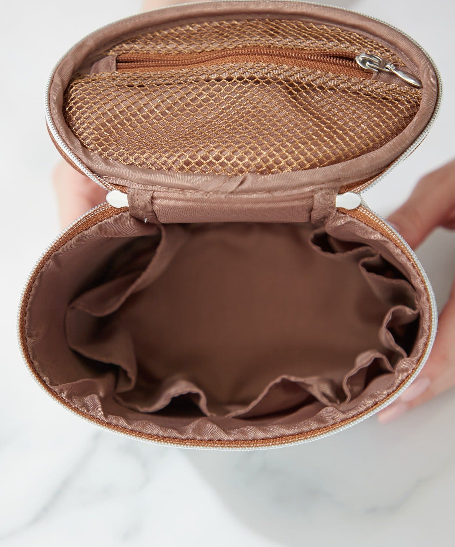 メインスペースの内側にはブラシやスキンケアボトルなどを入れられる、幅の異なるポケットが8つ付いており、