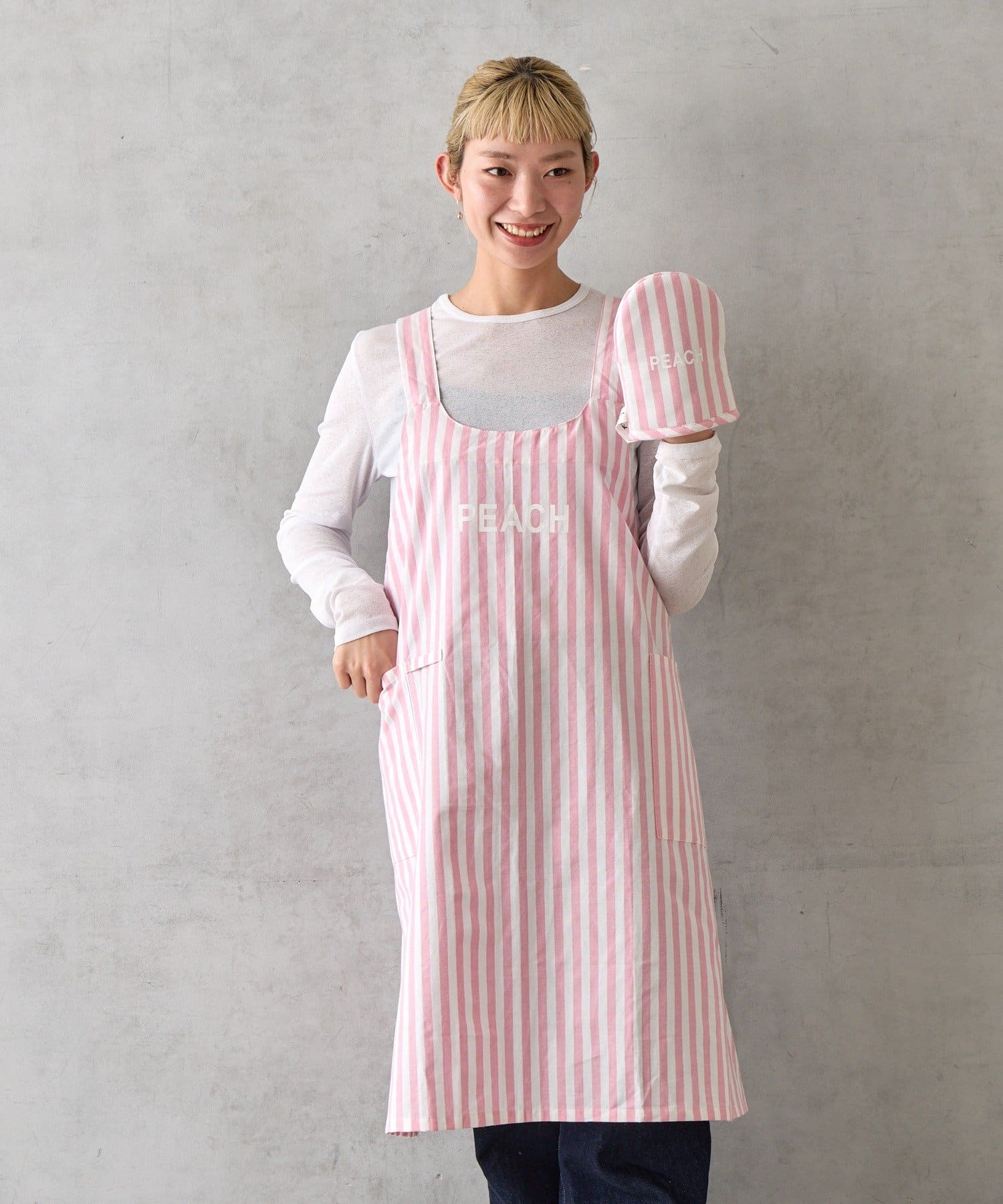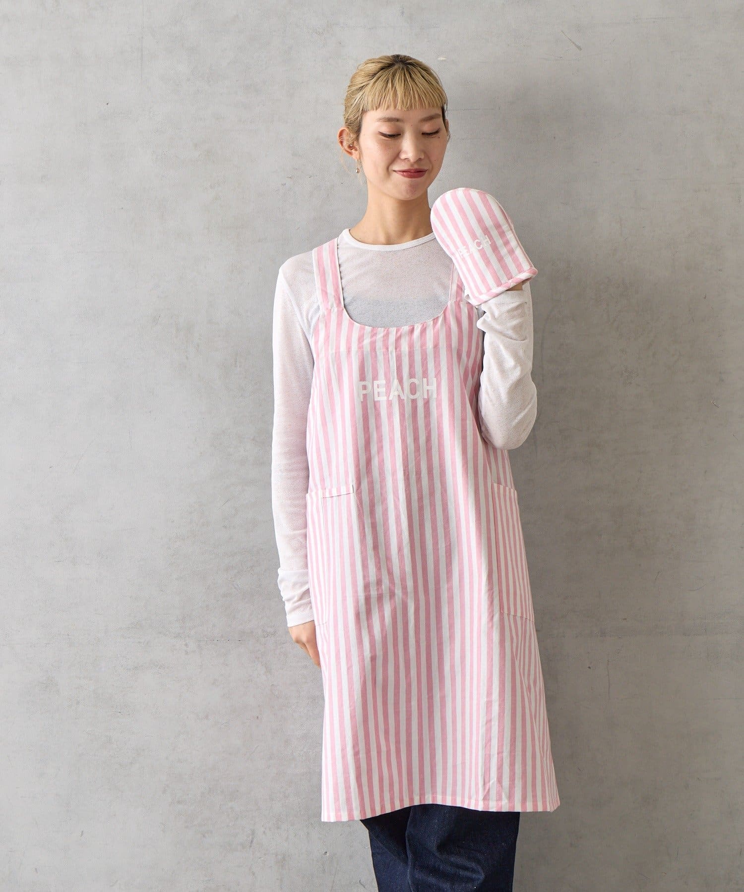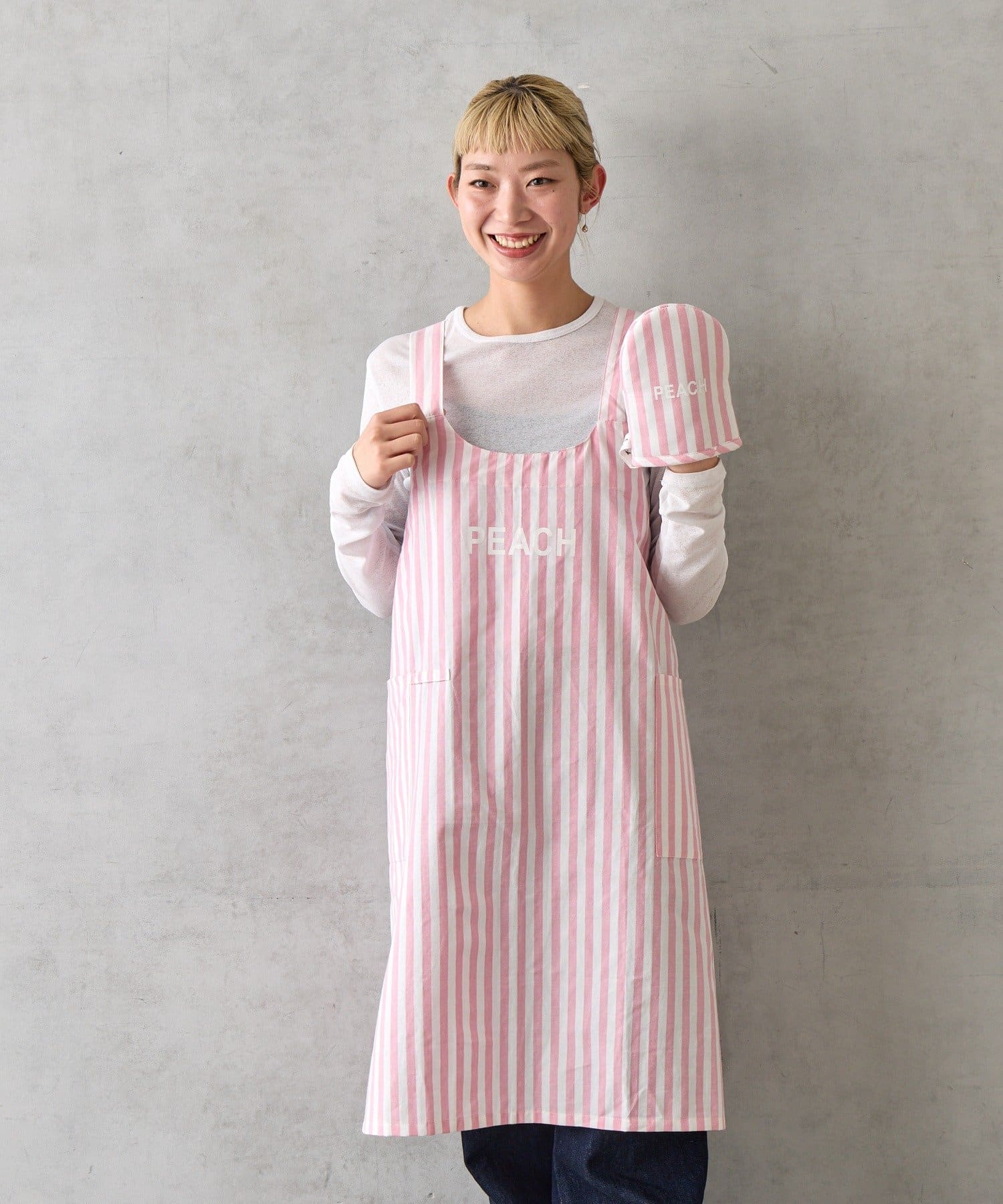 エプロンとミトンには、カラーごとに異なる単語がプリントされています。