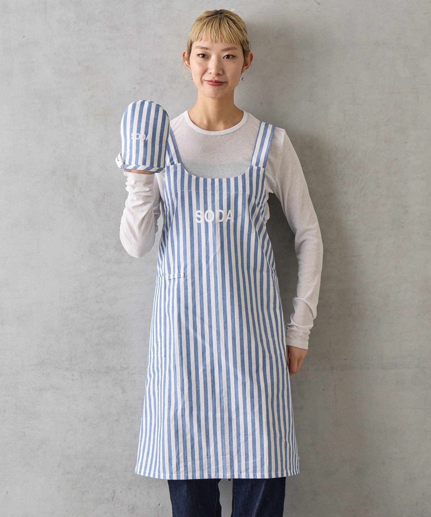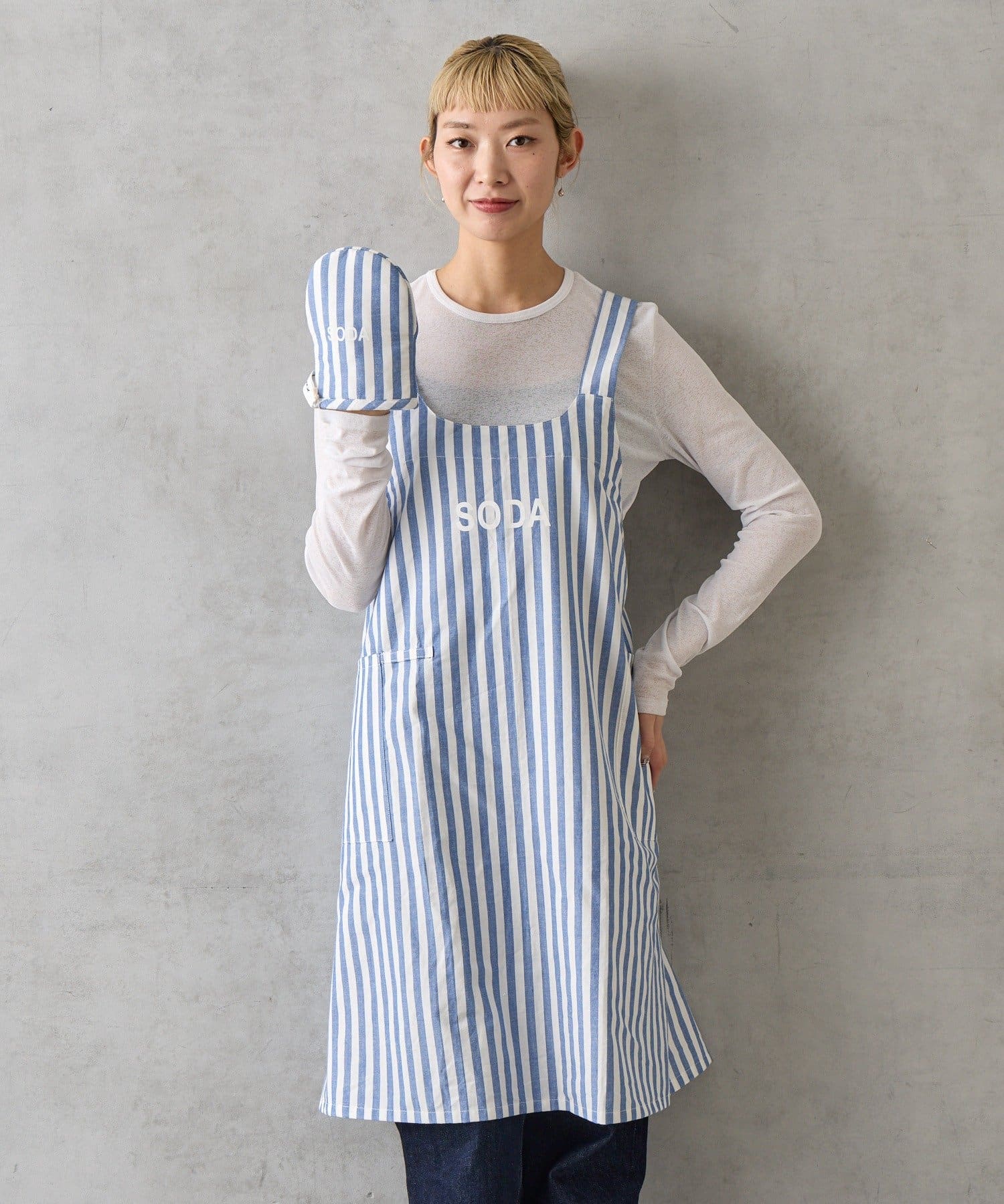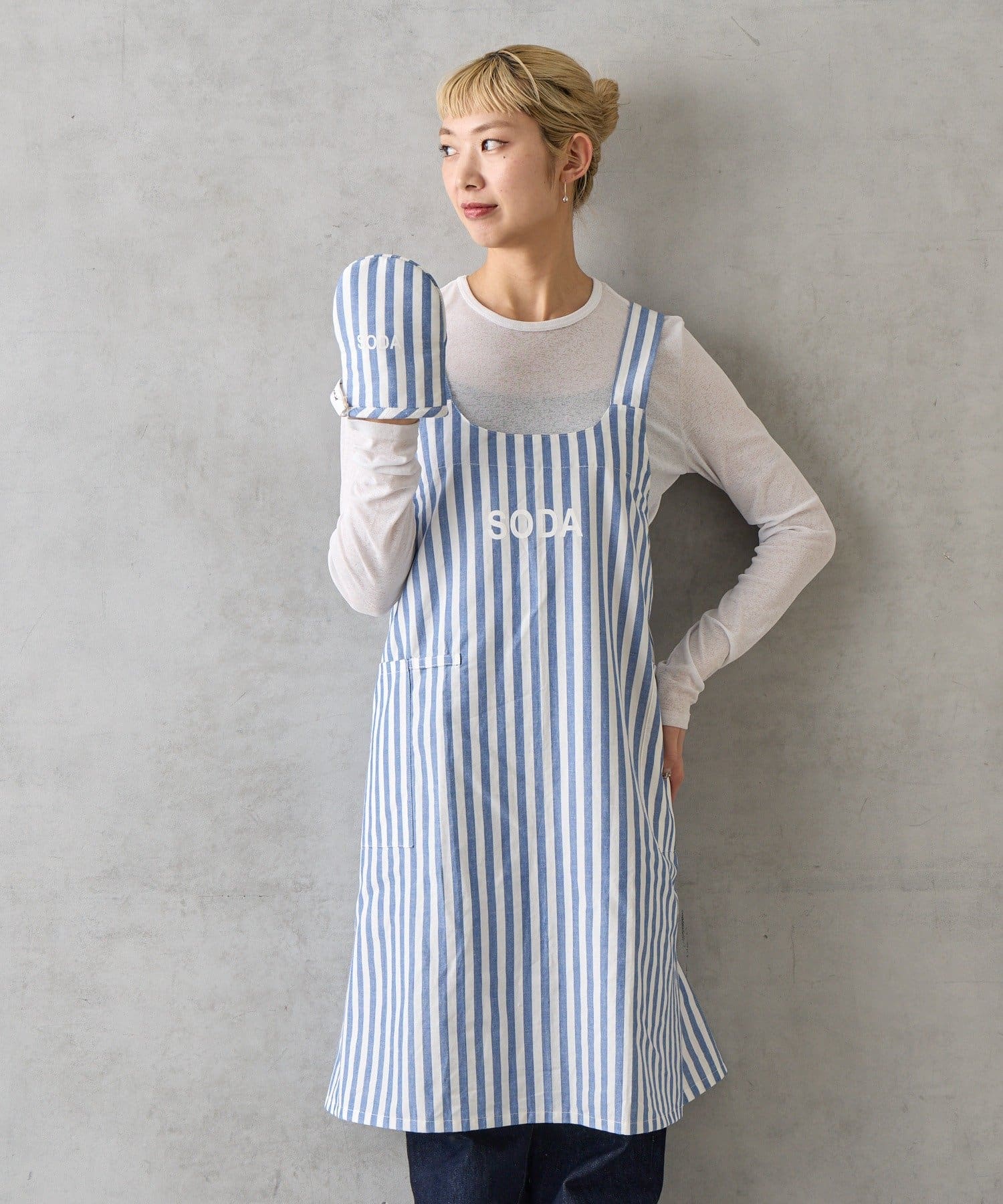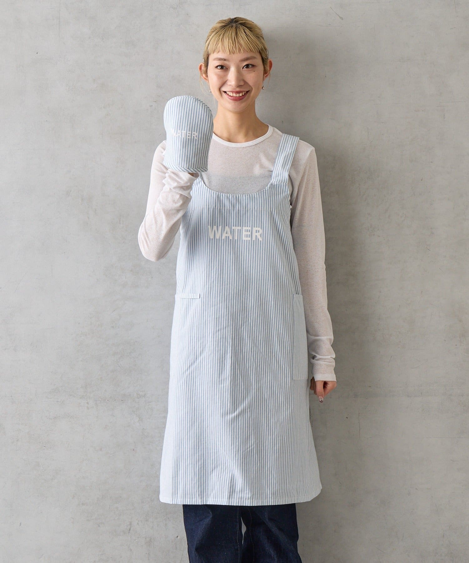 エプロンとミトンには、カラーごとに異なる単語がプリントされています。