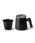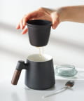 木目の美しい取っ手に、マットな質感の陶器が重厚感を感じさせるマグカップ