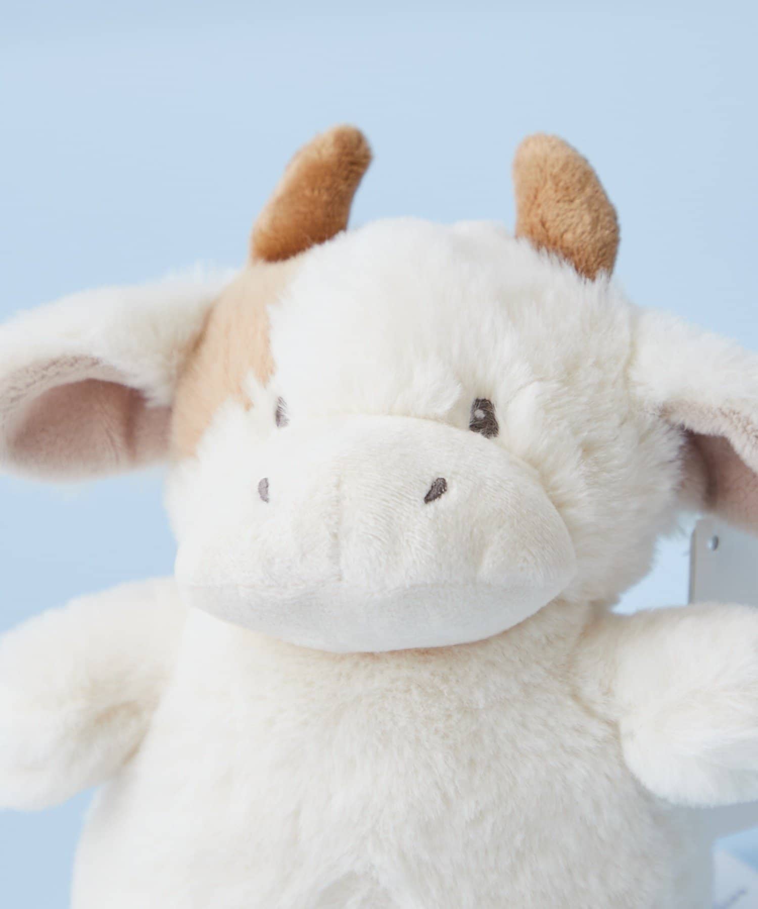 真っ白とモカの優しい色合いの子牛。ちょこんと小さい角、つぶらな瞳と愛らしい座った姿が特徴です。