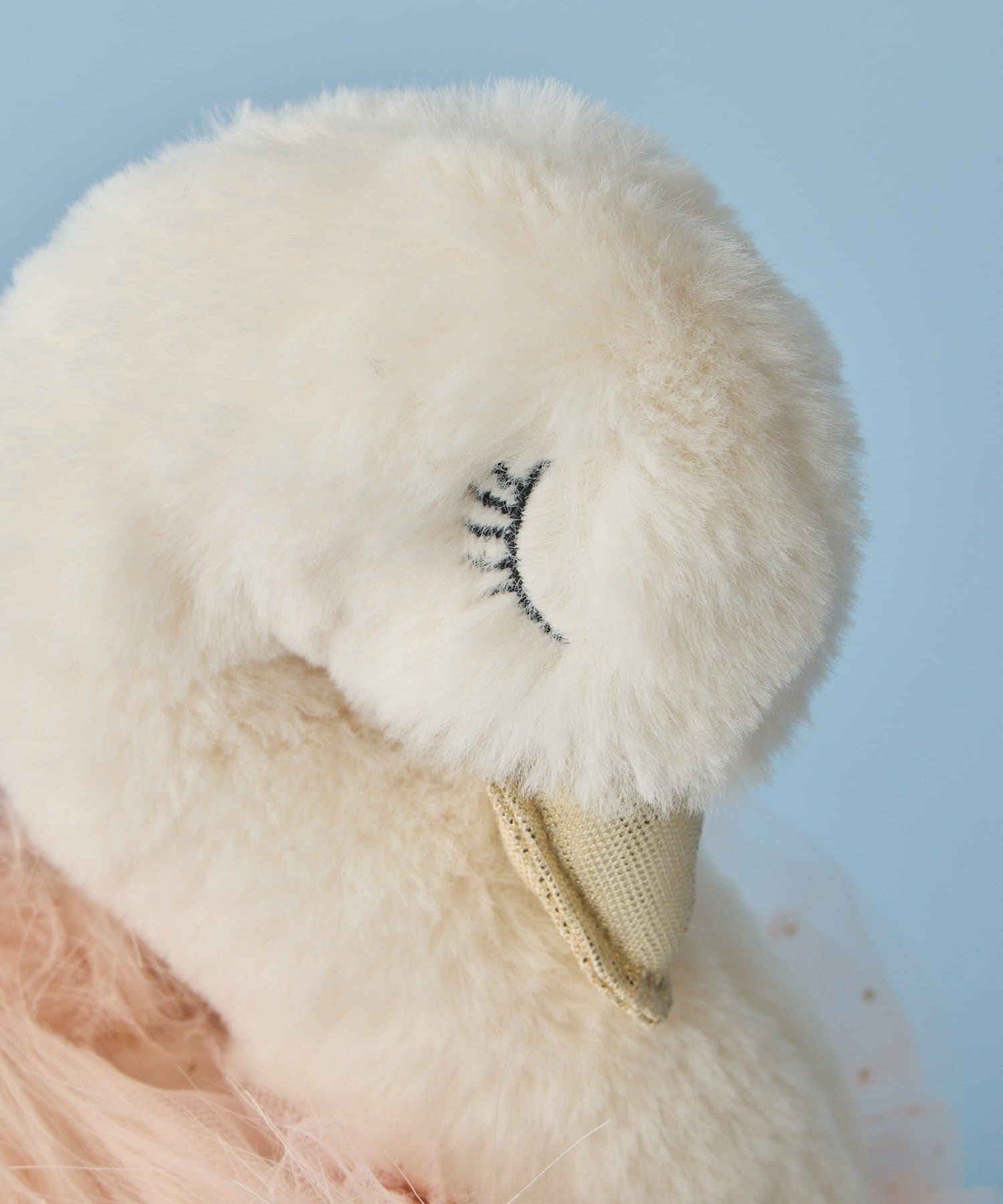 眠そうな刺繍の目と金色のくちばしは、まるで夢の国からそのまま飛び出してきたかのよう。