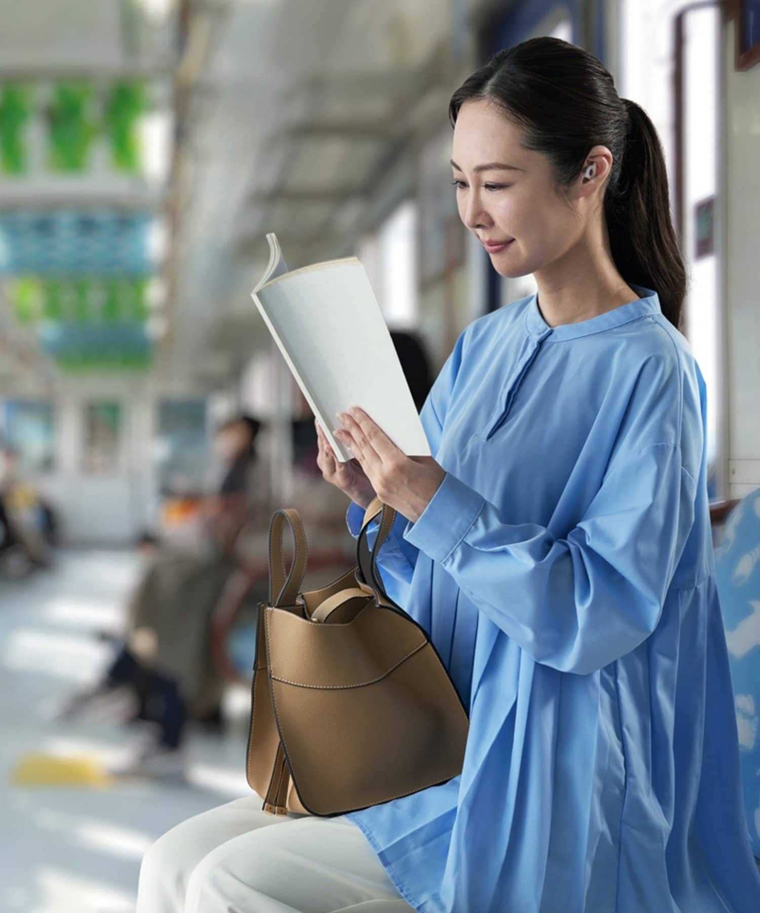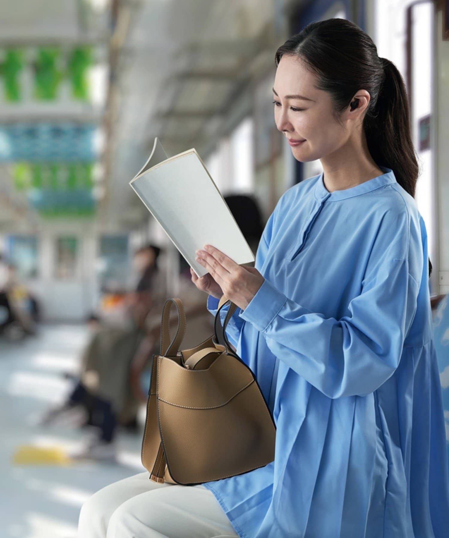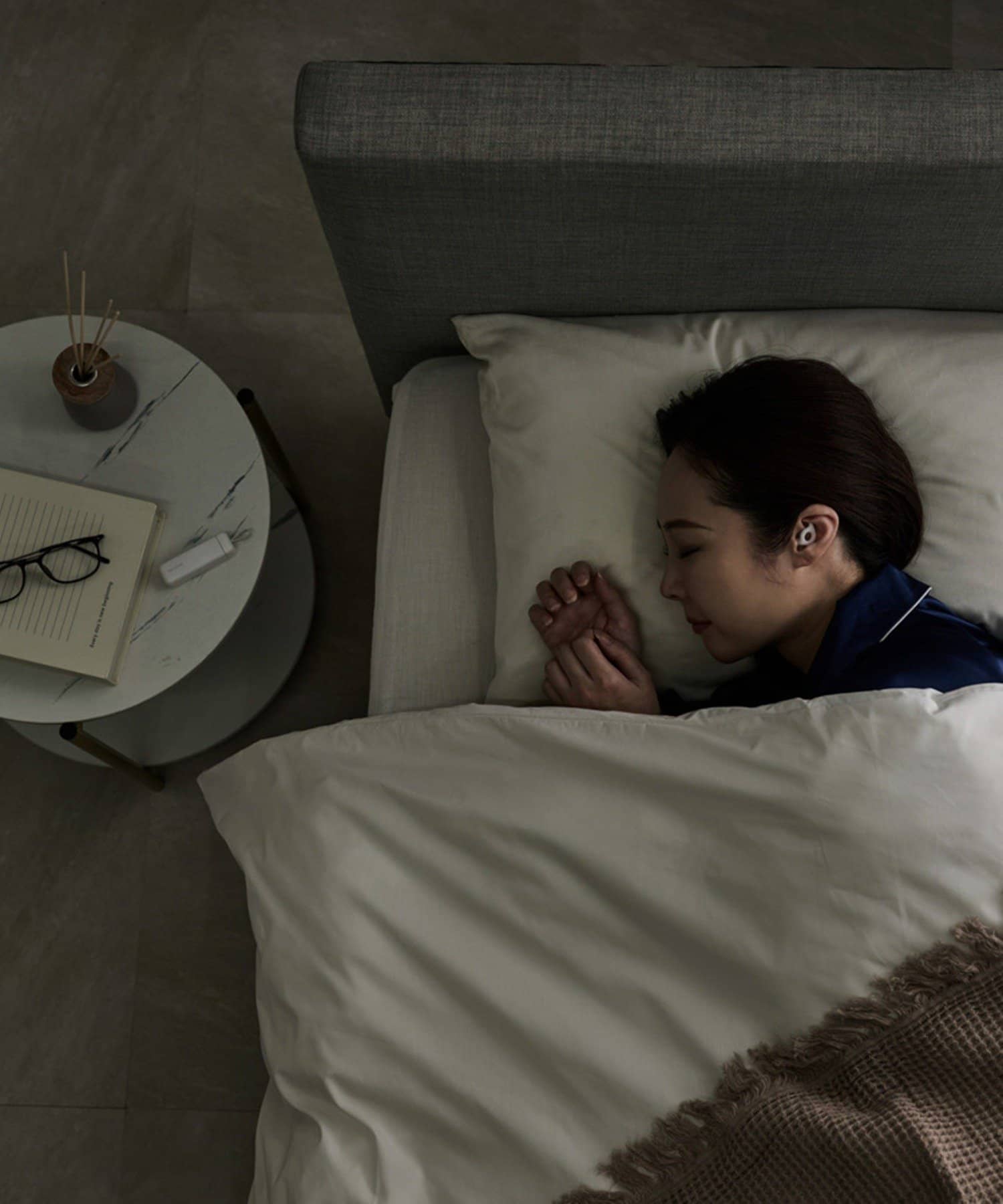 耳穴に収まる薄型設計。横向きで寝ても気にならず、自然なつけ心地。