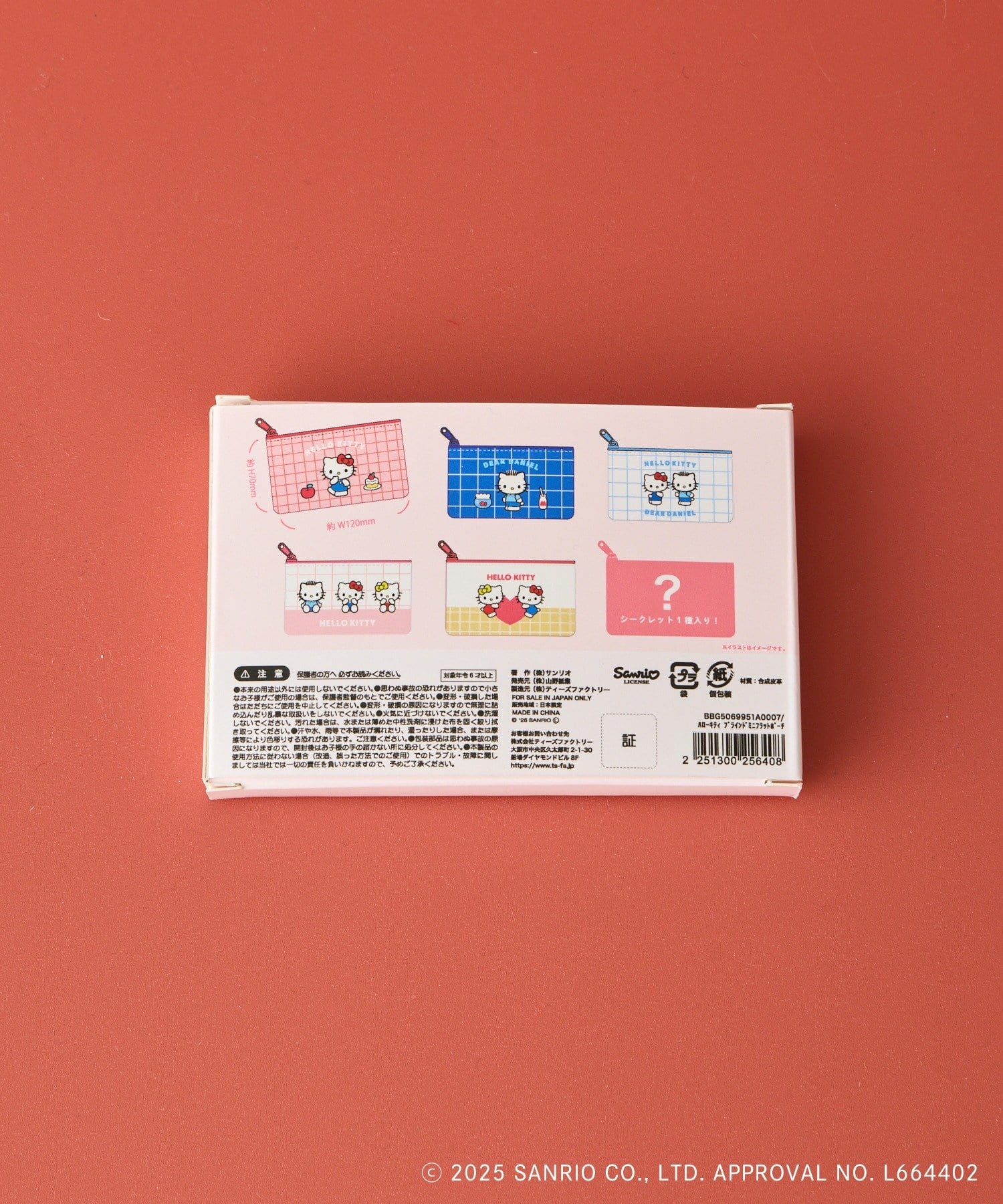 名刺サイズのミニポーチ。ハローキティ、ミミィホワイト、ディアダニエルの3人が仲良く集まった世界観のデザインです。