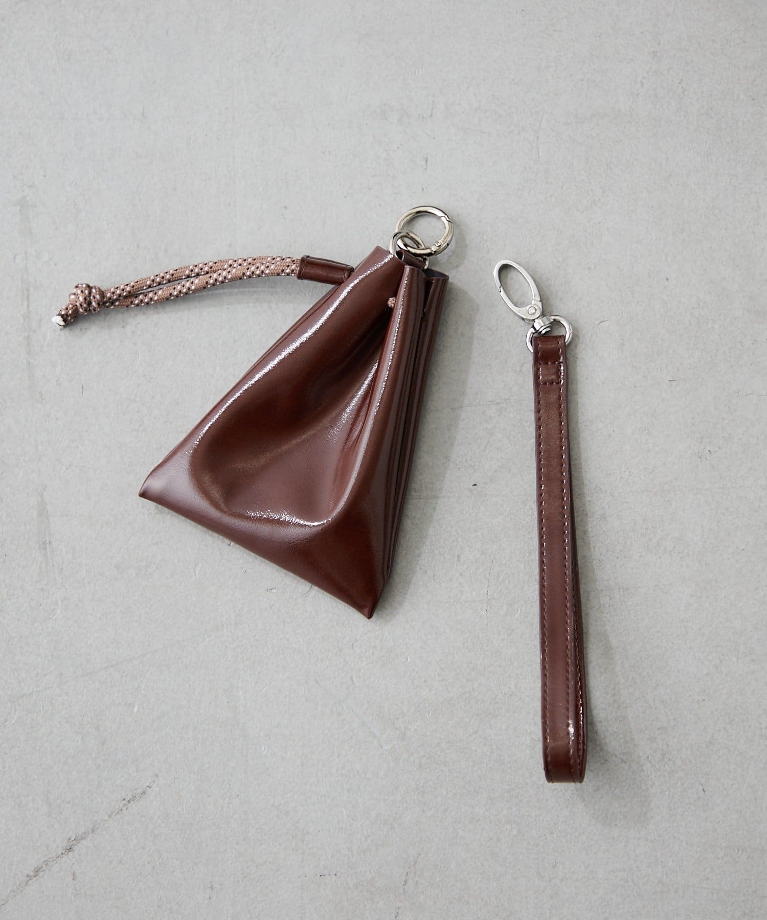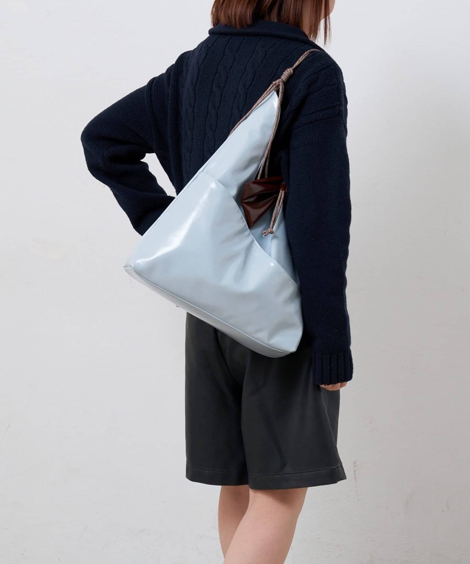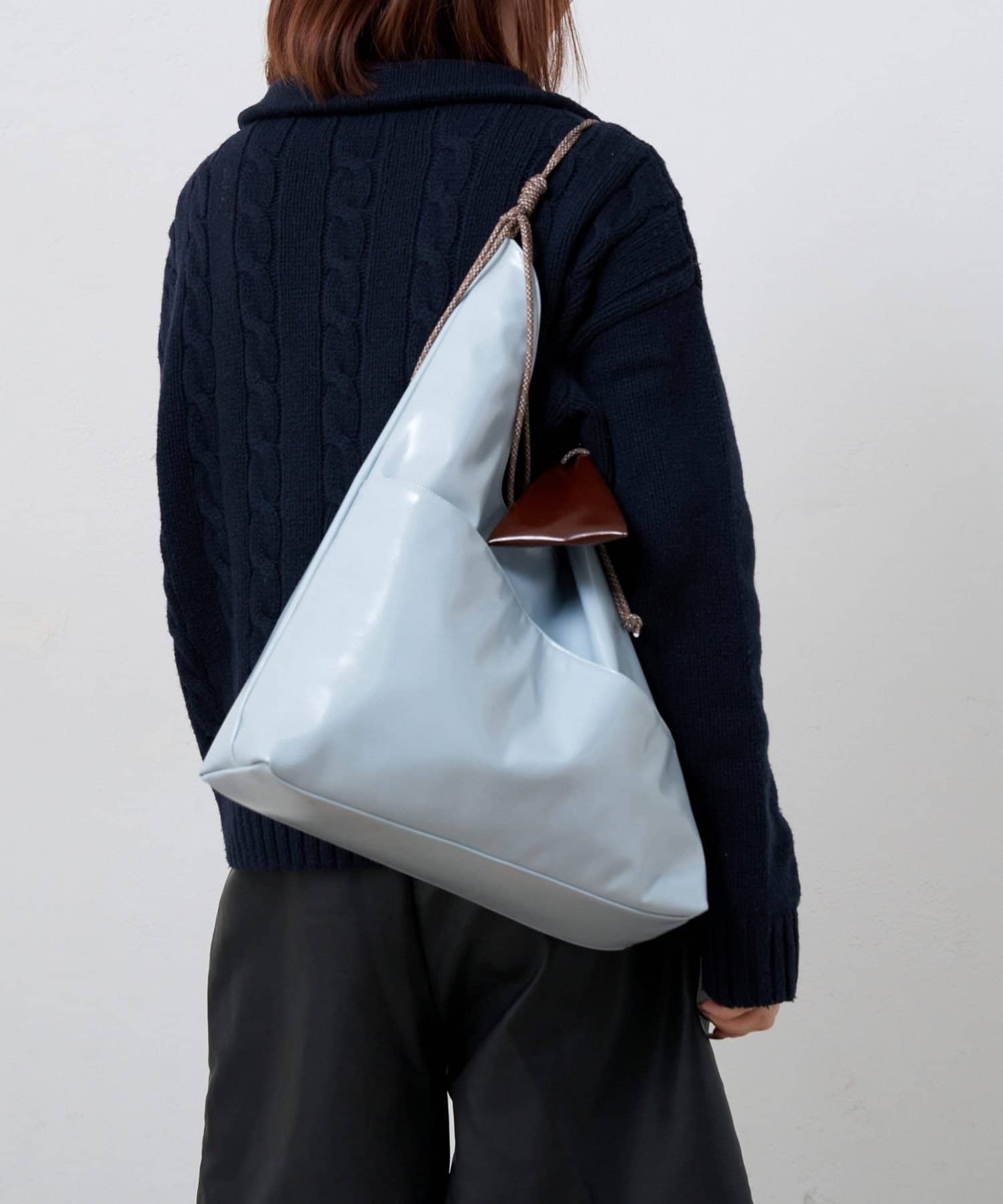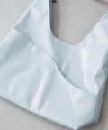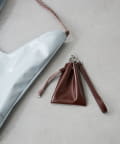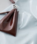 上品な光沢のあるフェイクレザーを使った、すっきりとしたトライアングルシルエットバッグ。