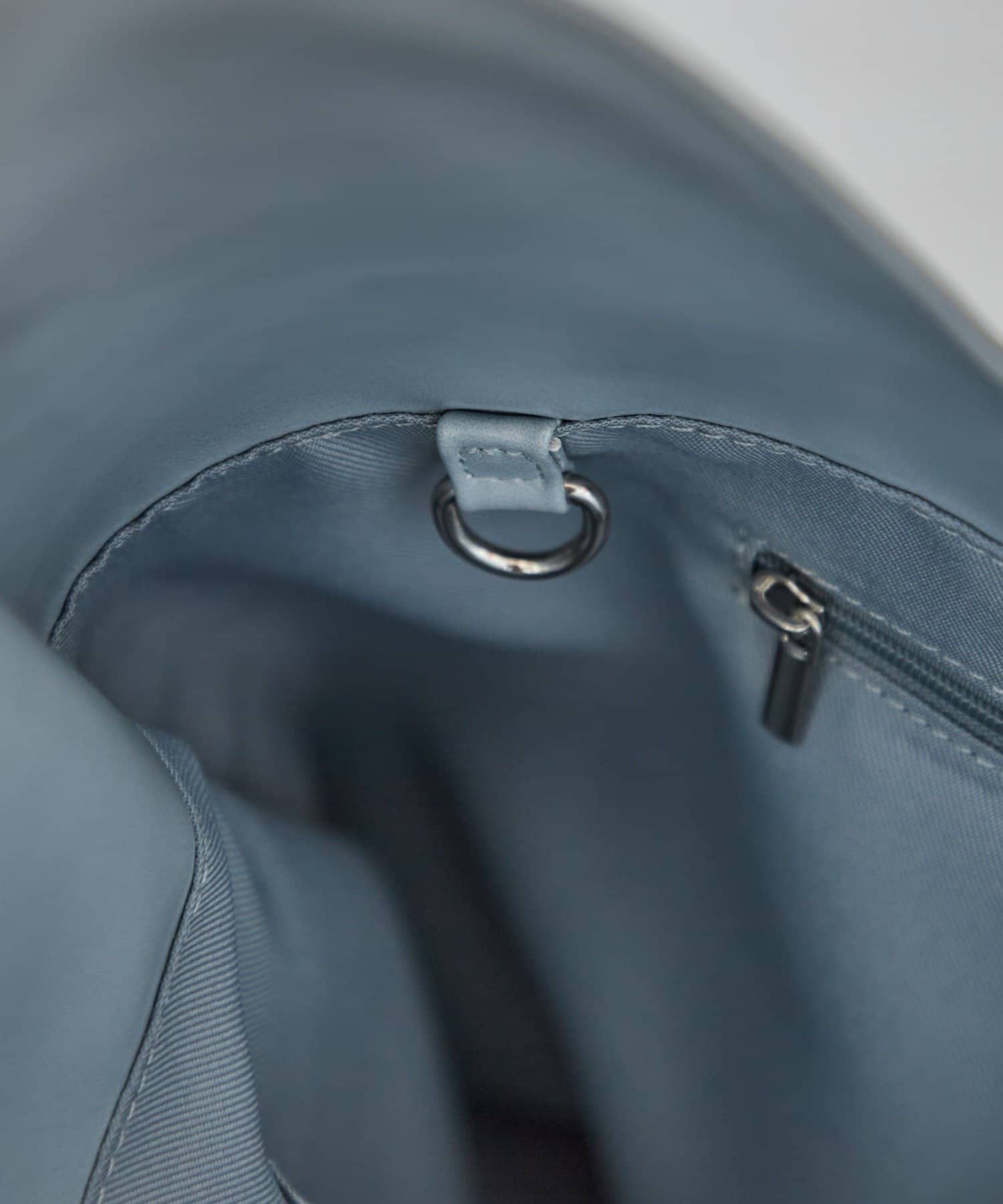 反対側のチャック付きのポケットの横にはDカンがついており、パスケースや鍵などを付けることができます。
