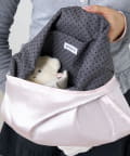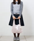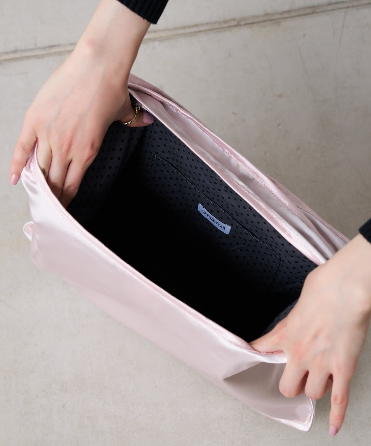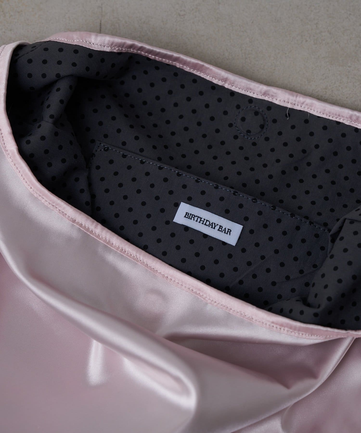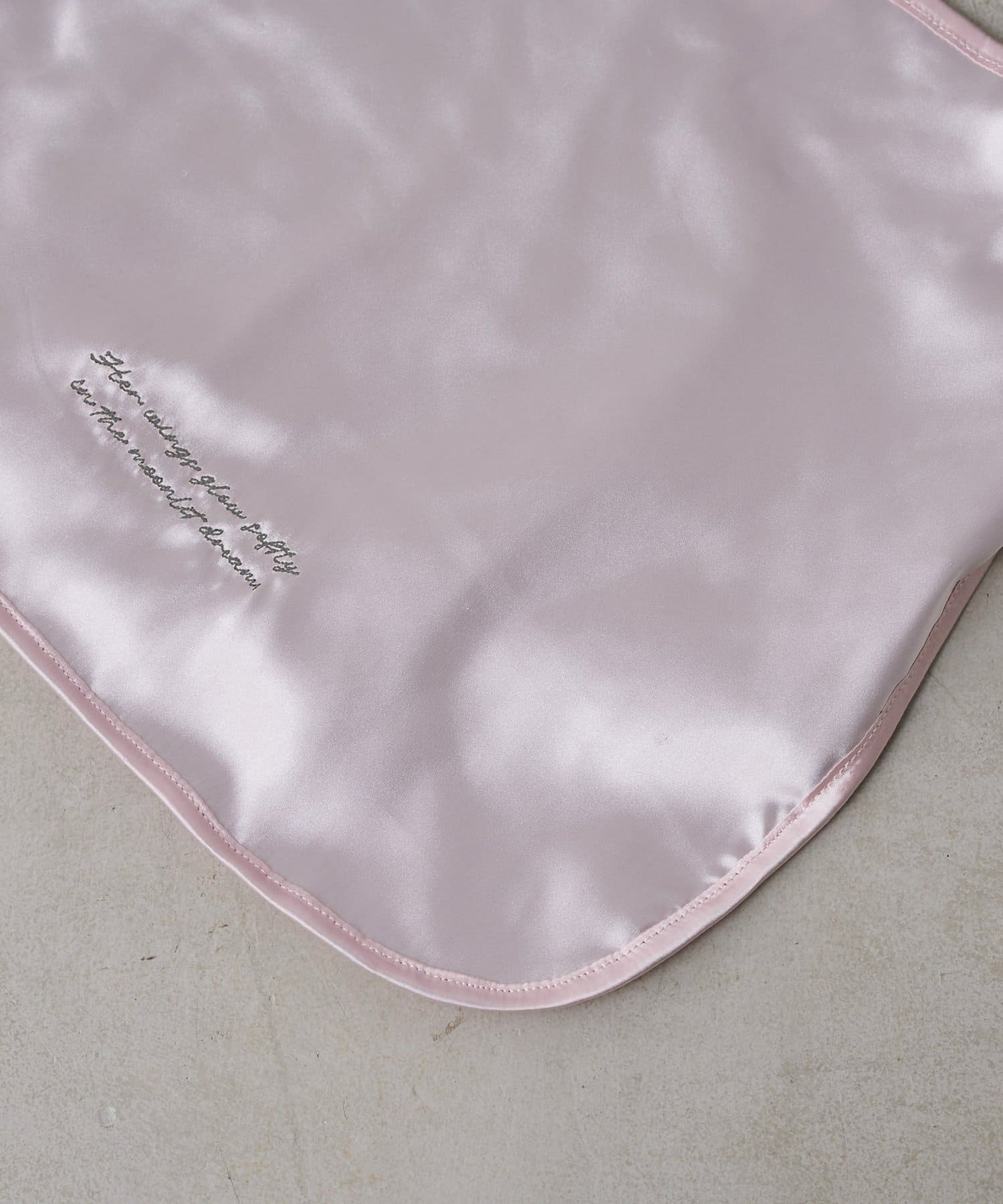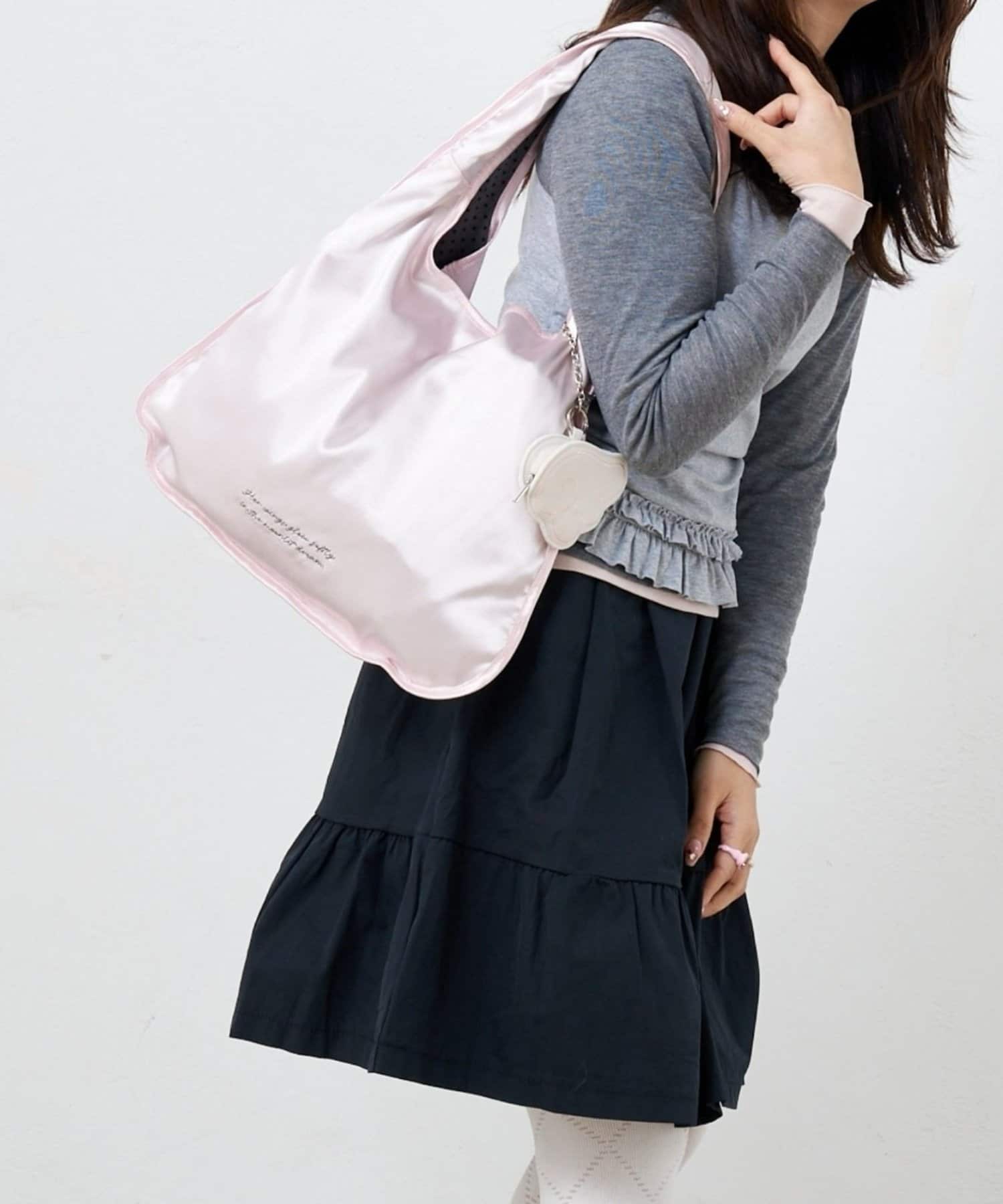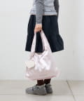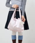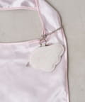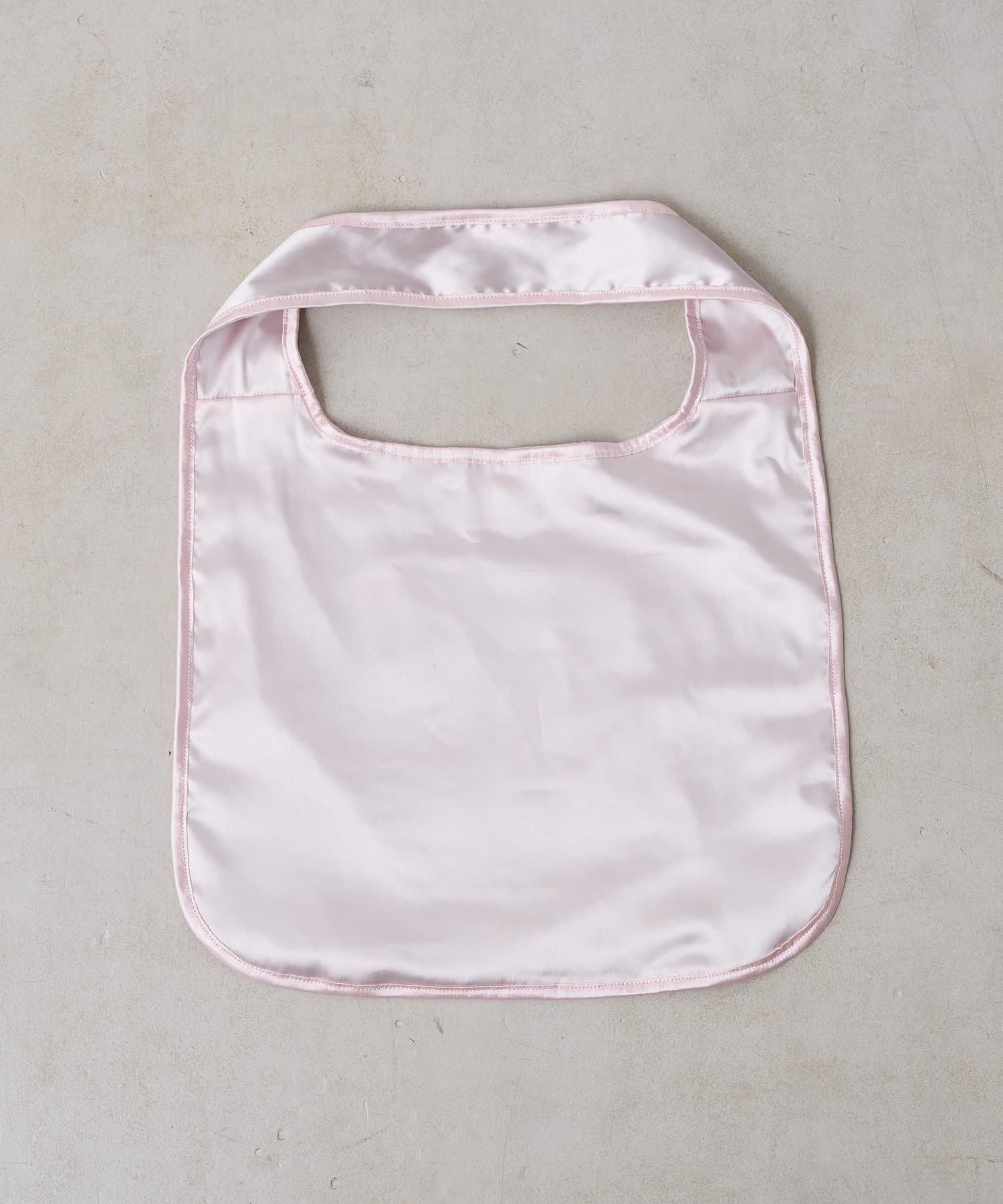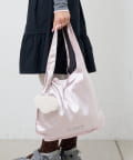 とろけるような光沢のあるサテン素材の、甘すぎない上品なペールピンクが乙女心をくすぐるマルシェバッグ。