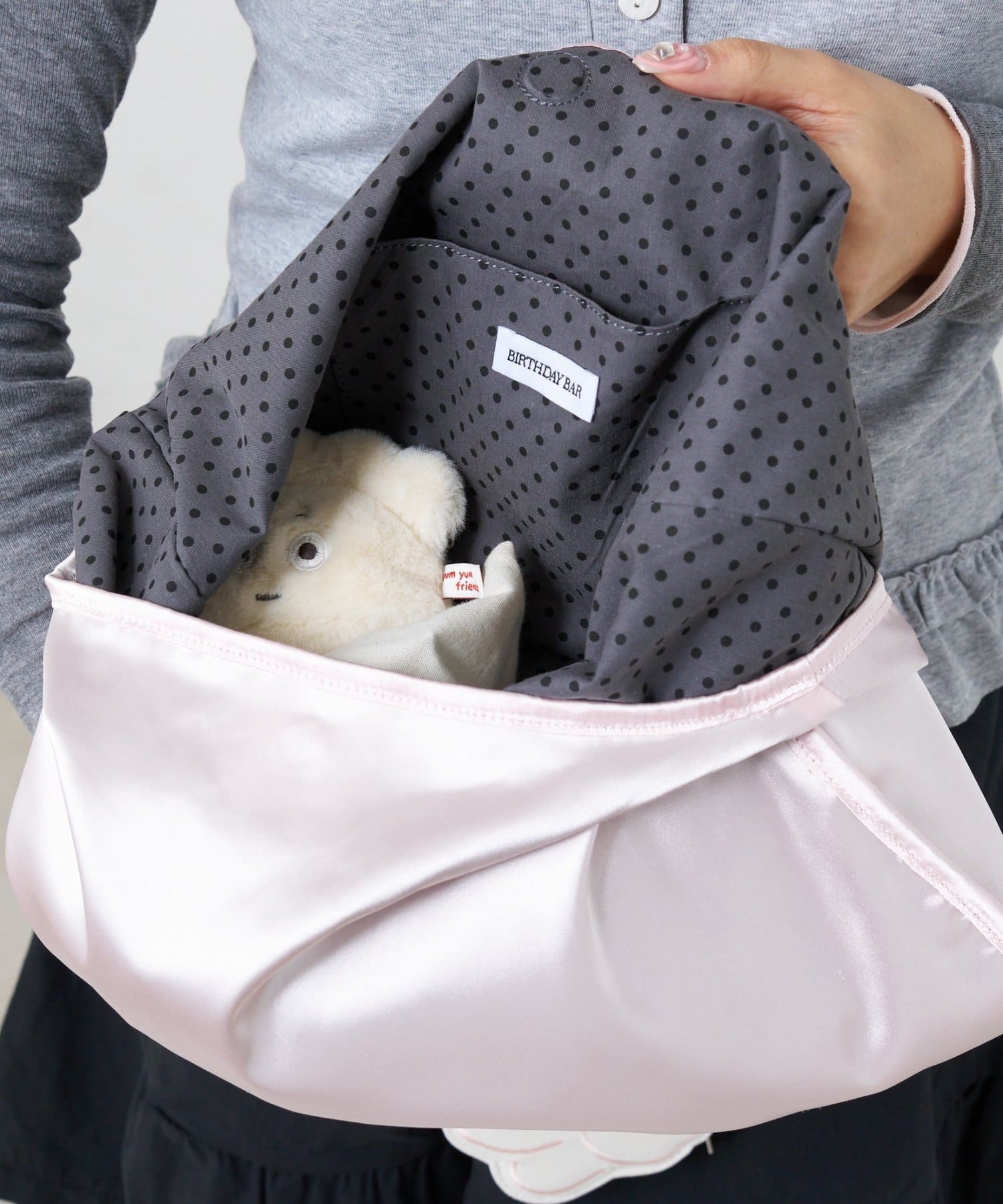 ちらっと見えるグレードットの裏地はバッグを開けた瞬間まできゅんとする、隠れたおしゃれポイント。