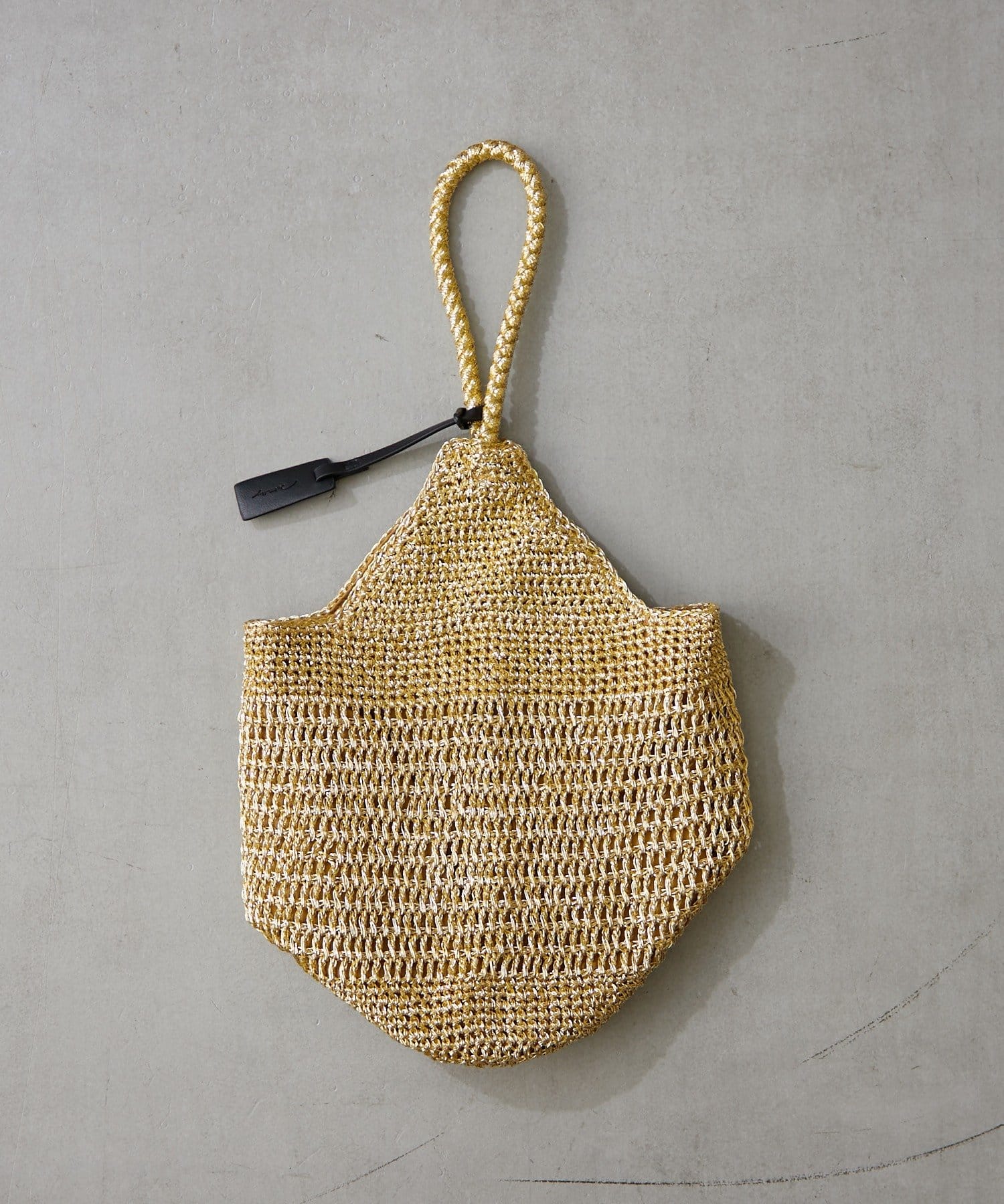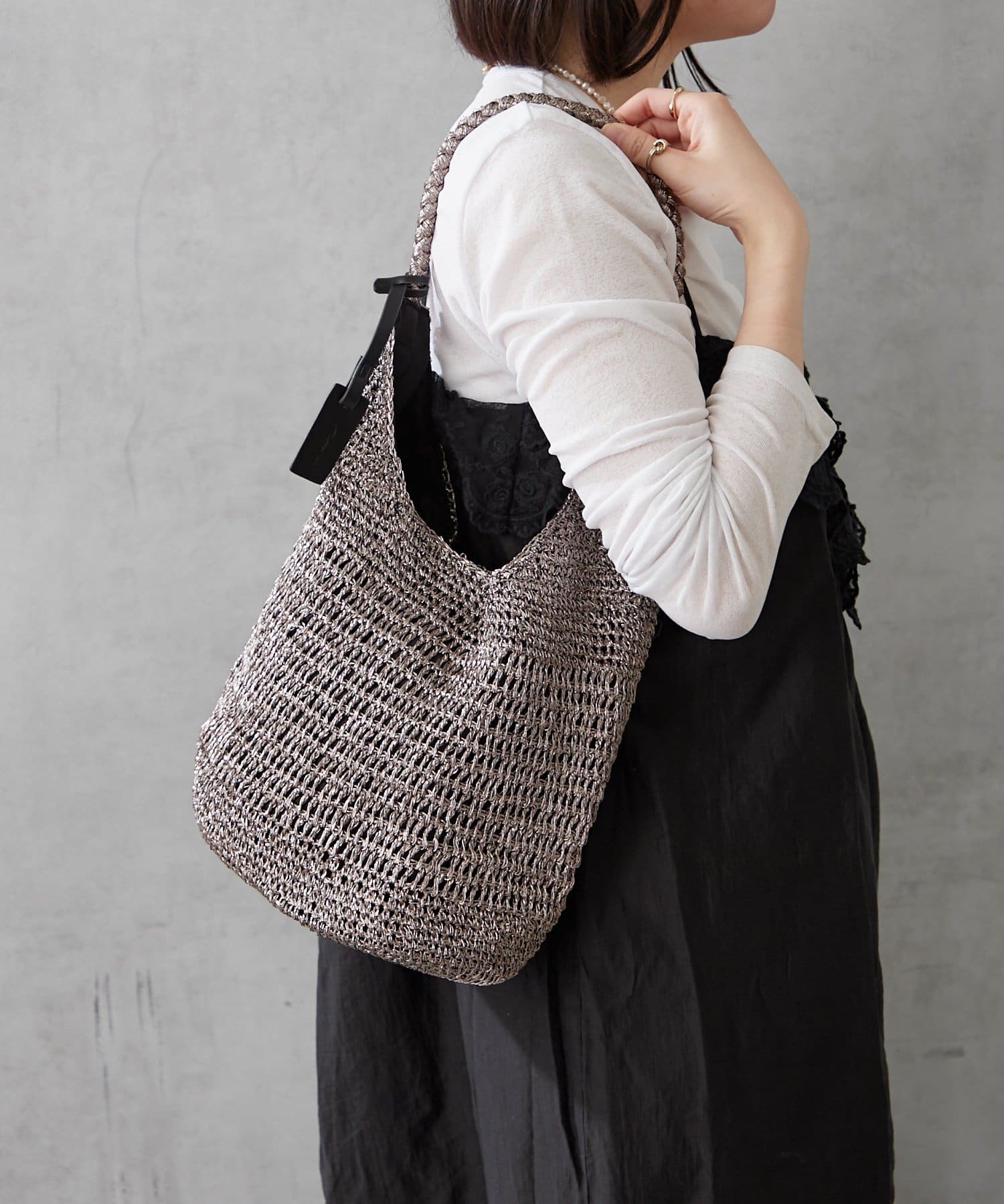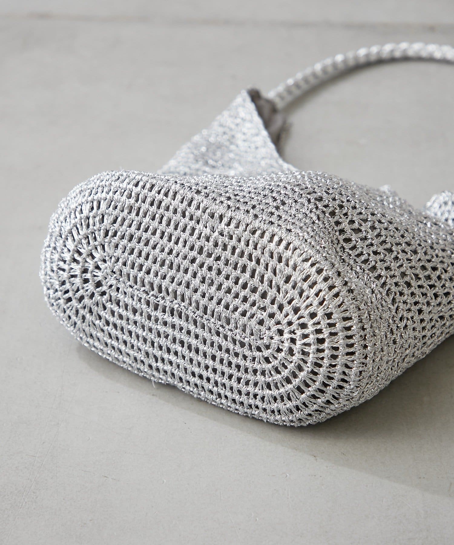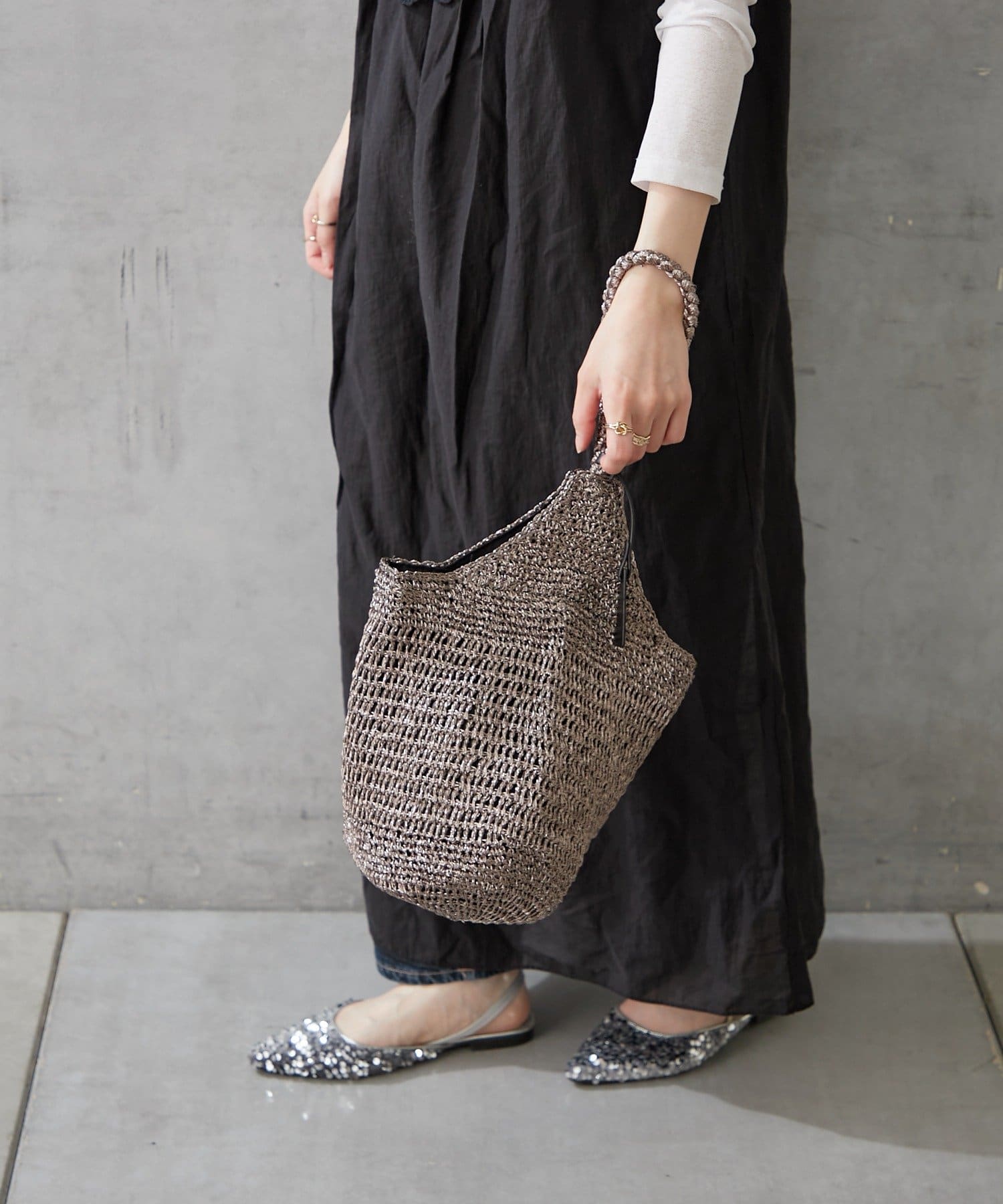 手編みならではの温かみのある風合いと、メタリック素材が持つモダンな雰囲気が絶妙に融合し、他にはないユニークな存在感を放ちます。