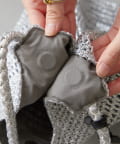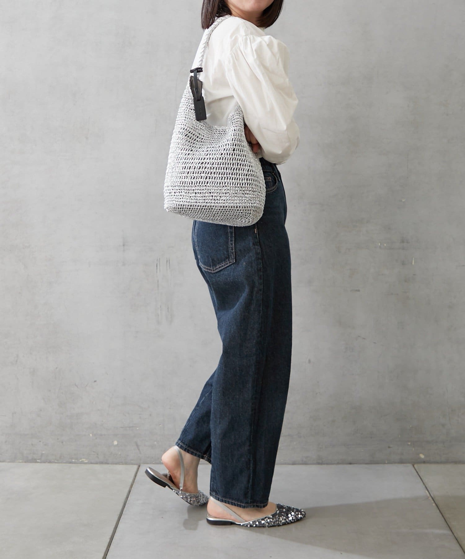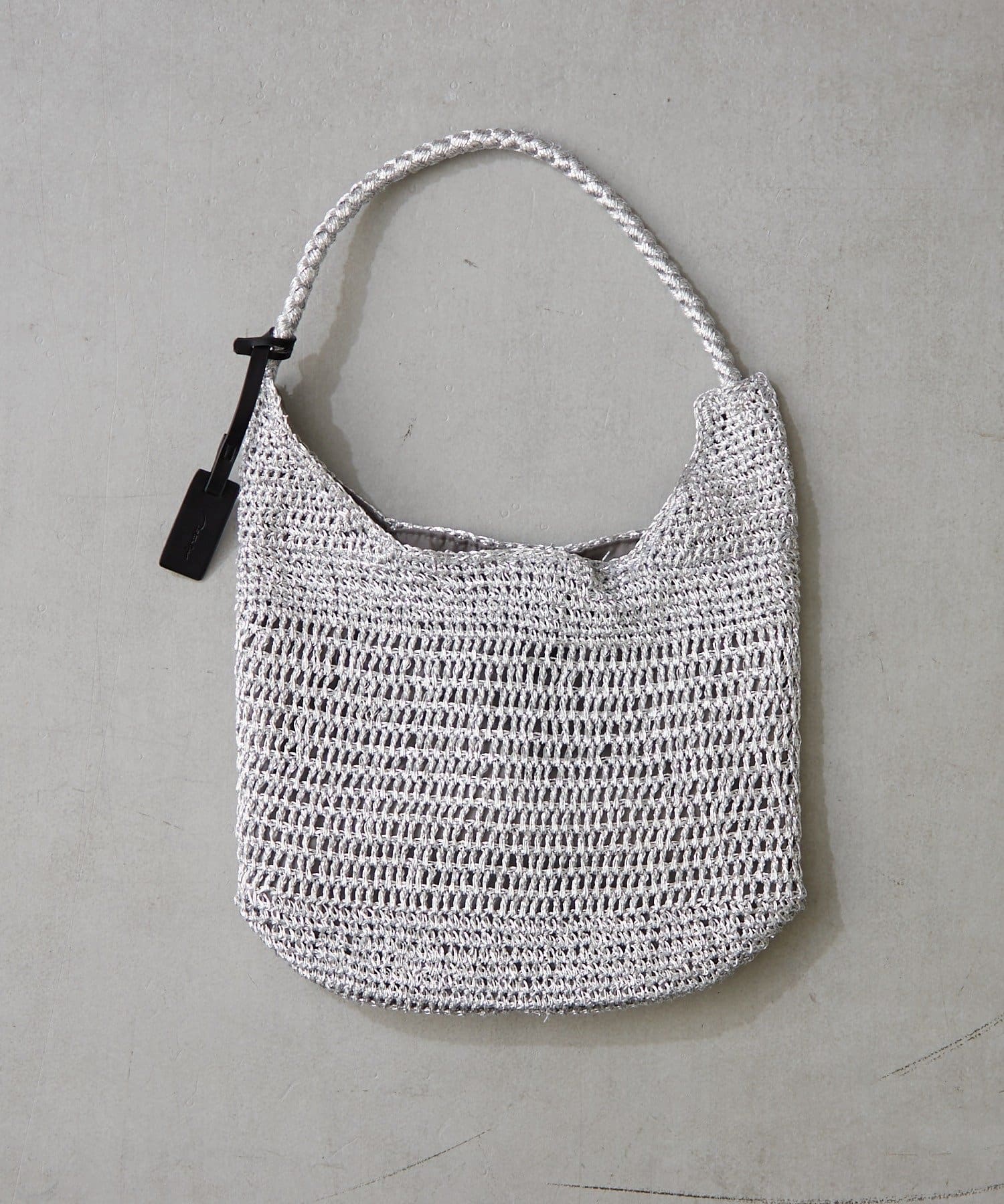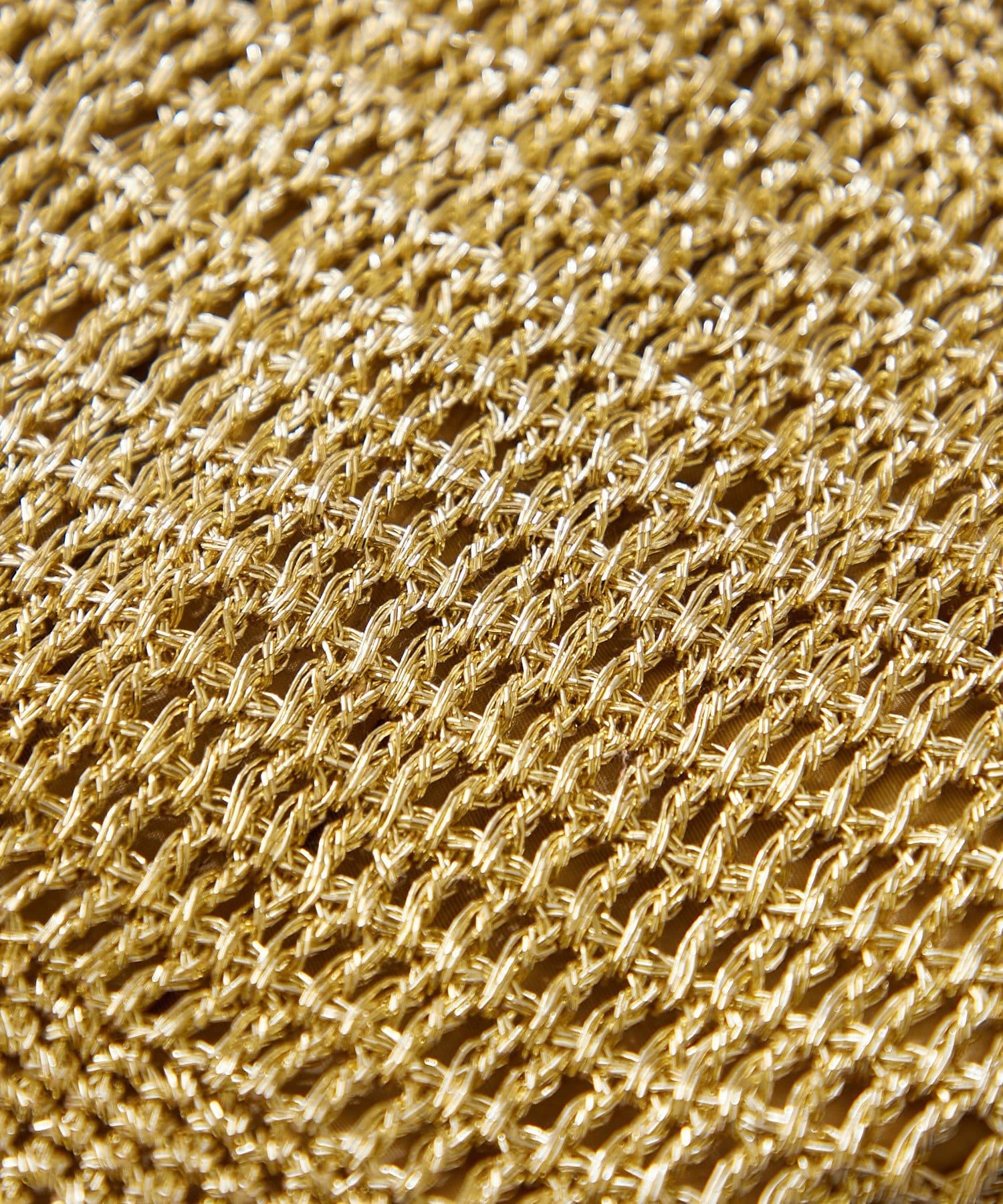 手編みならではの温かみのある風合いと、メタリック素材が持つモダンな雰囲気が絶妙に融合し、他にはないユニークな存在感を放ちます。