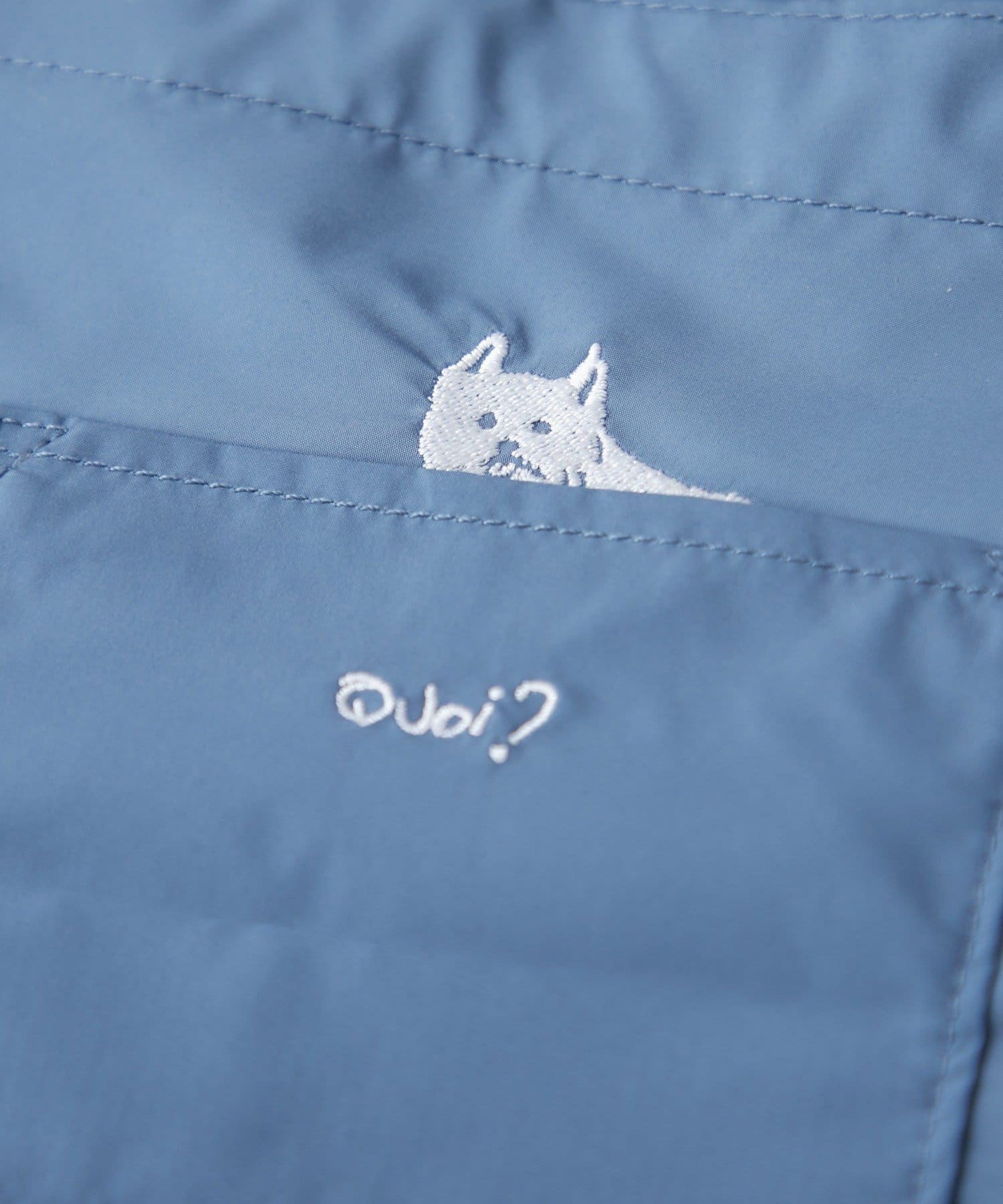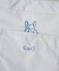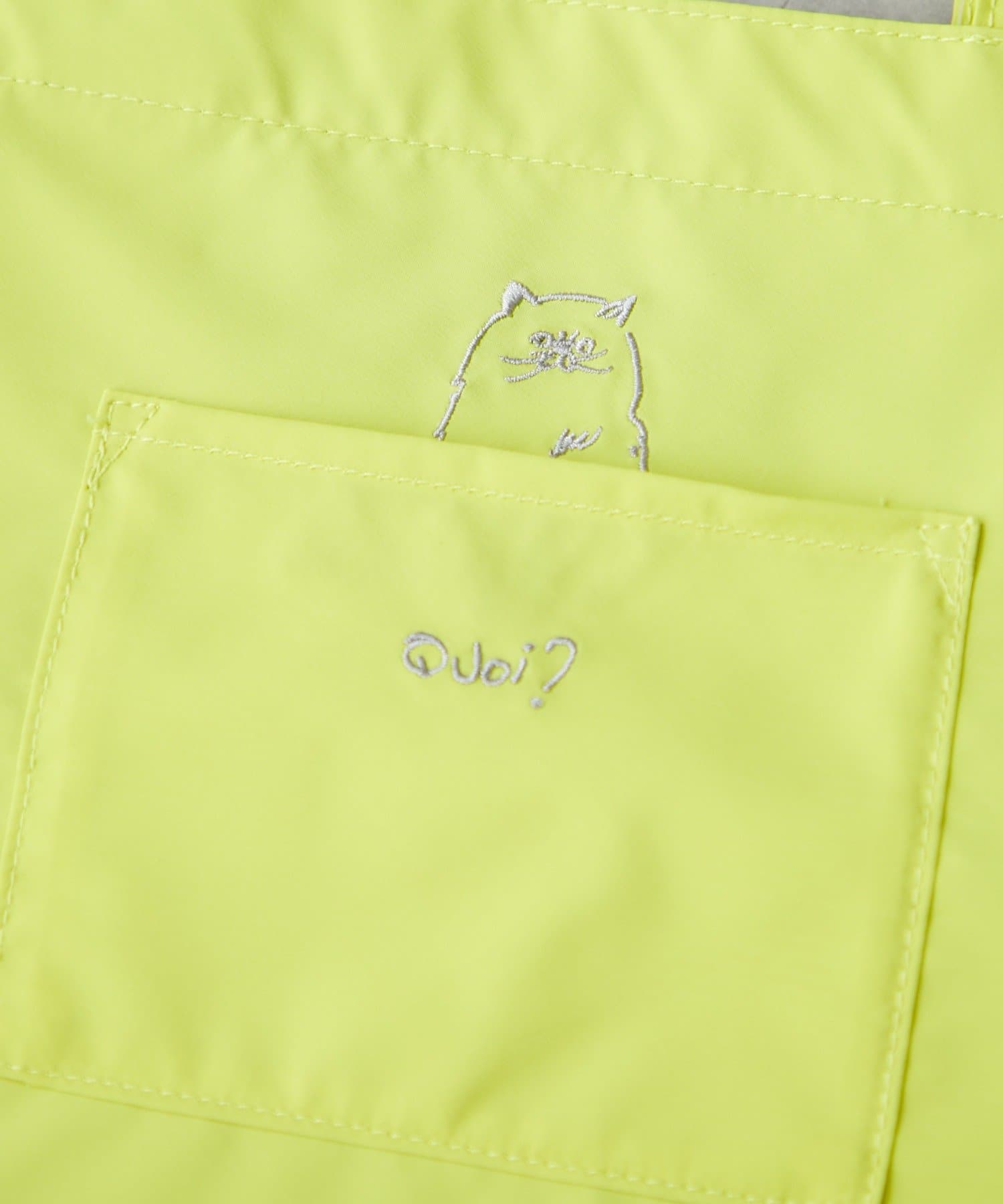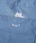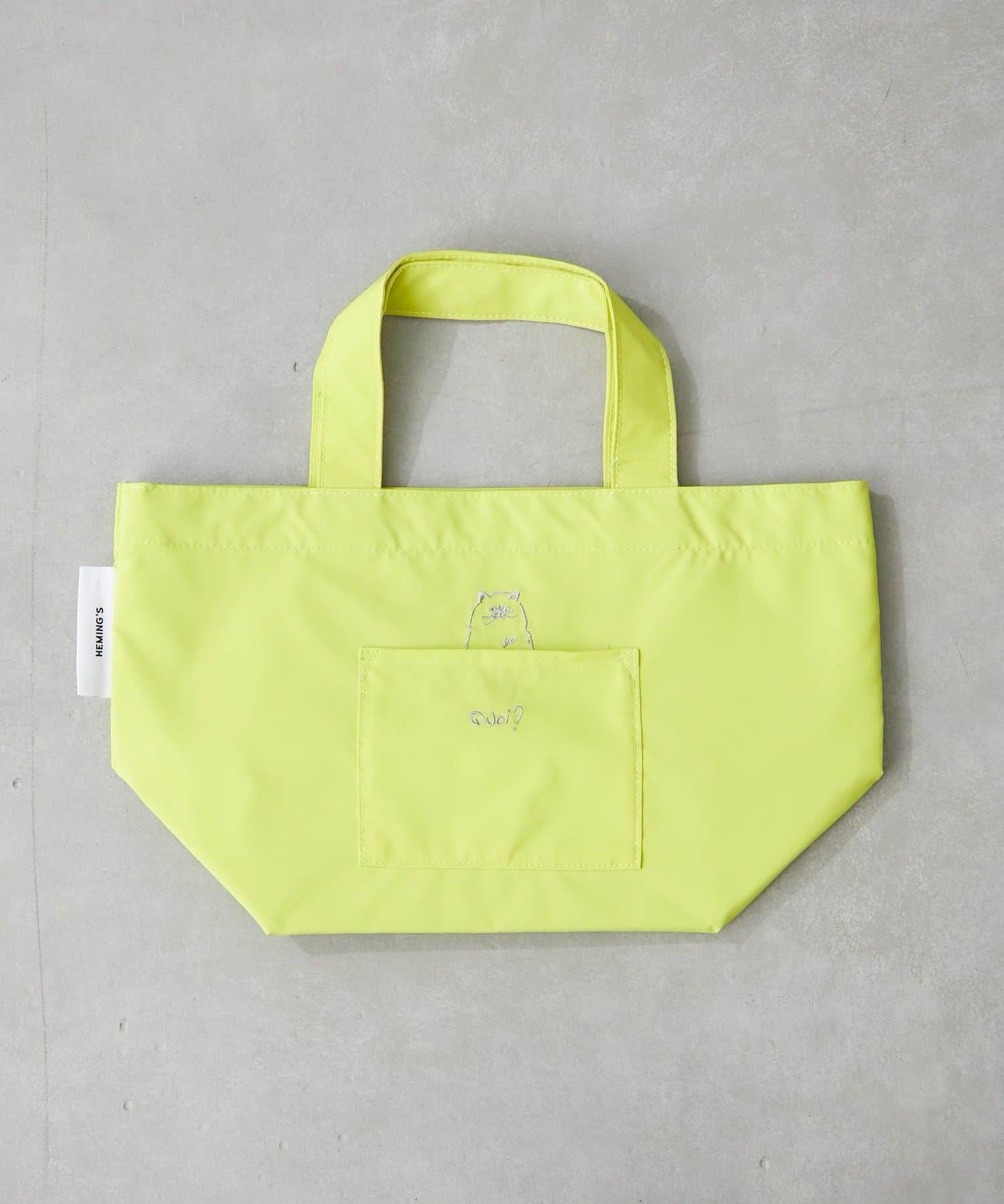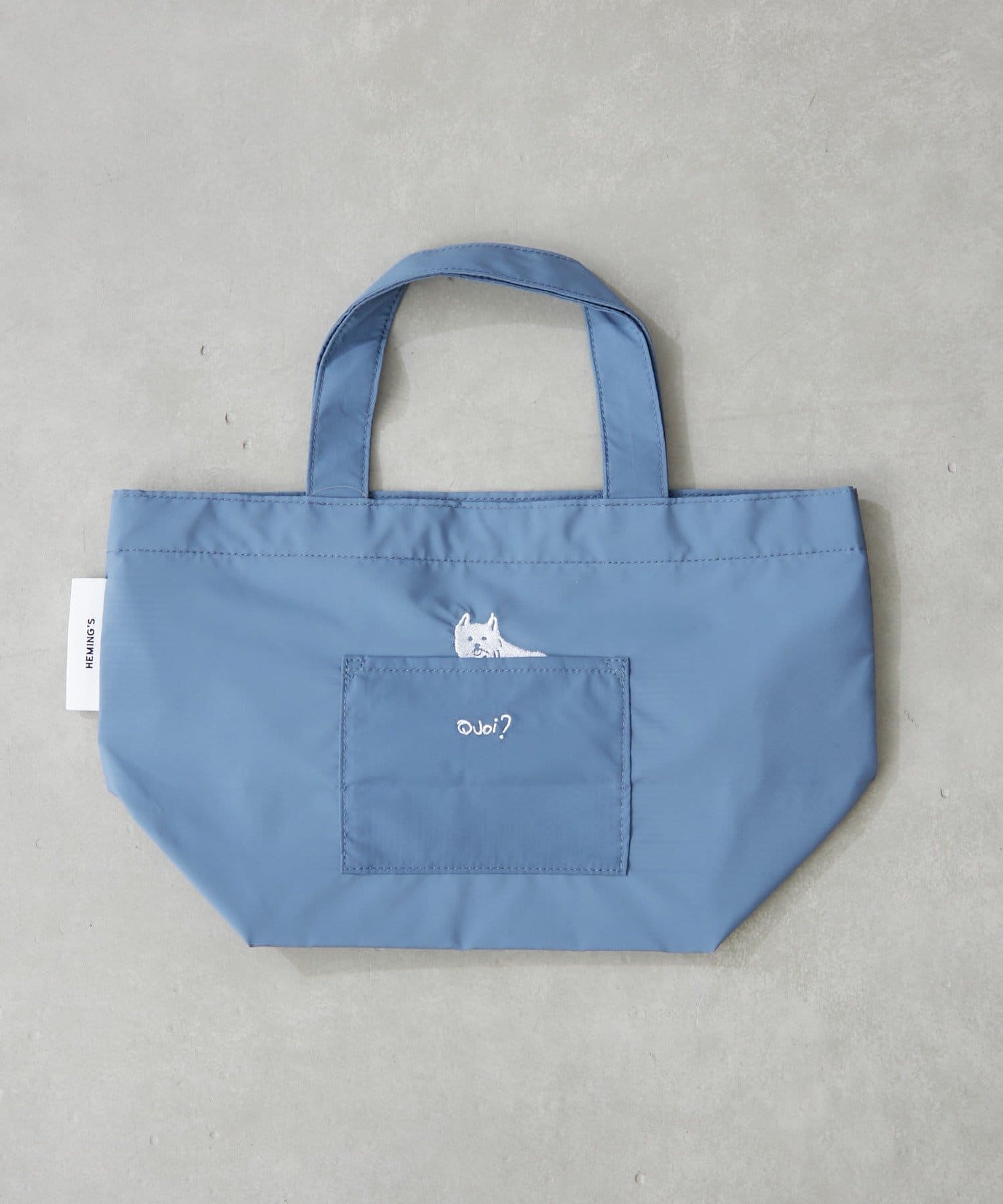 表側の「隠れていないで出ておいで」という呼びかけに、背面で「何?」とポケットから猫&犬が顔を覗かせるユニークなデザインのバッグ。