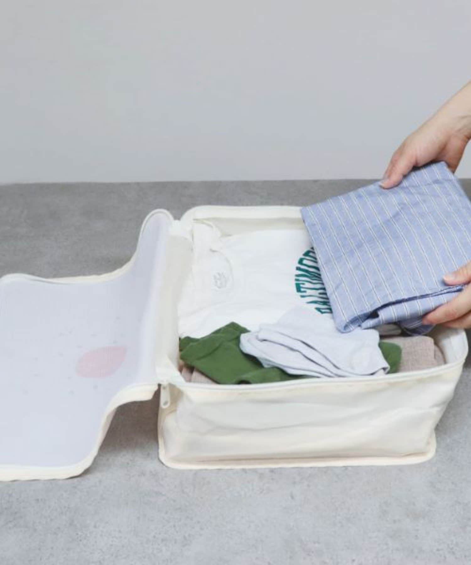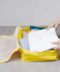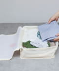 Lサイズのポーチには最大Tシャツ4枚、ジーンズ3枚が収納できる大容量サイズ。