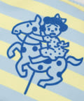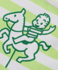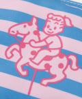 鮮やかなストライプ柄に、メリーゴーランドに乗ったキャラクターのアートが目を惹くデザイン。
