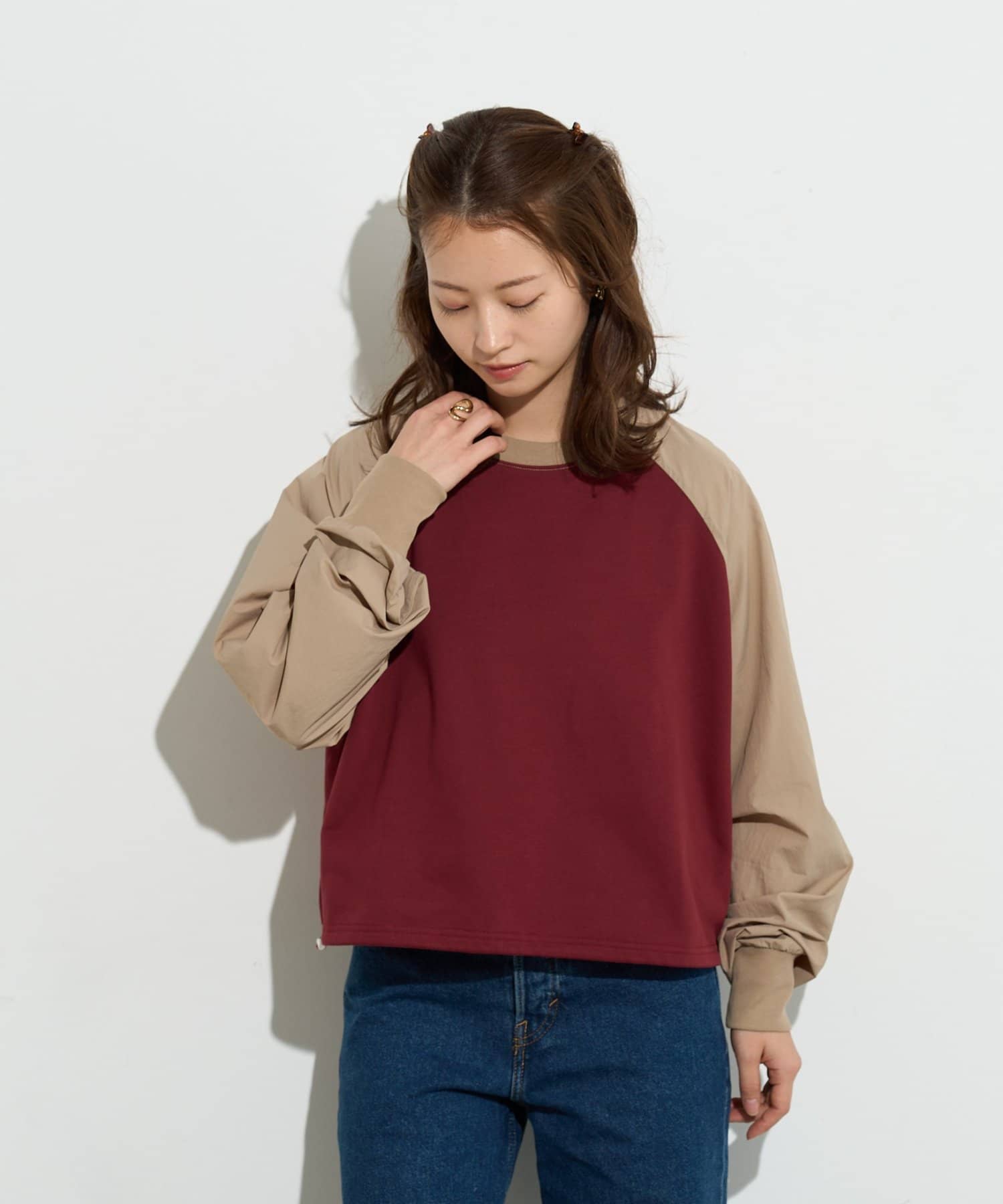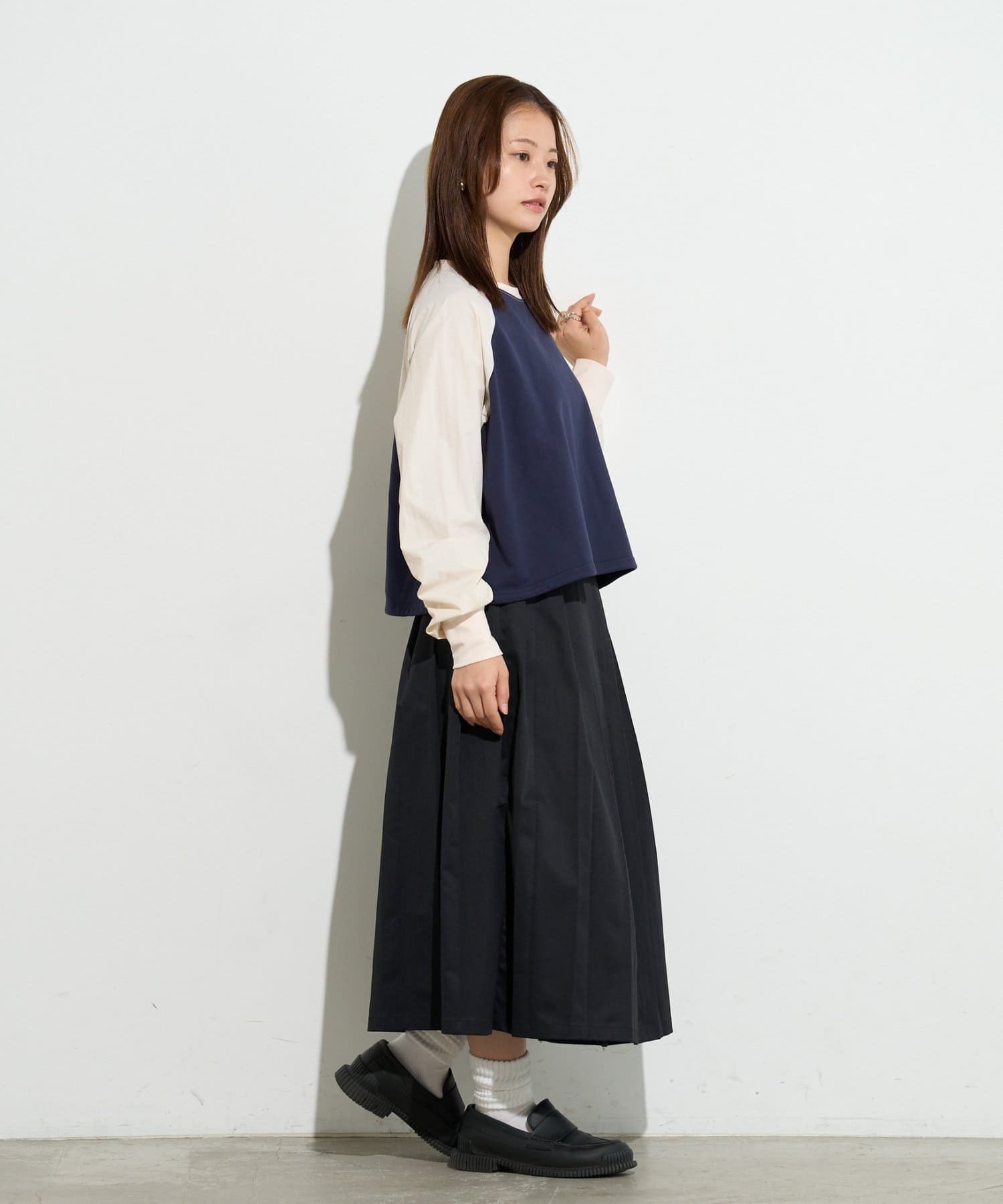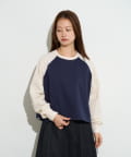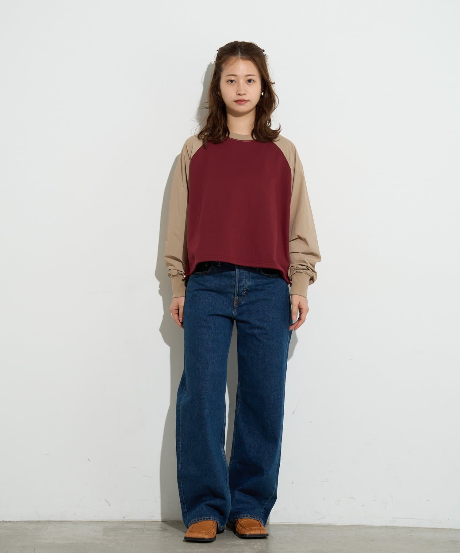 一見カジュアルなラグランスリーブのトップスを、洗練された配色とシルエットで大人っぽくアップデート。