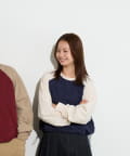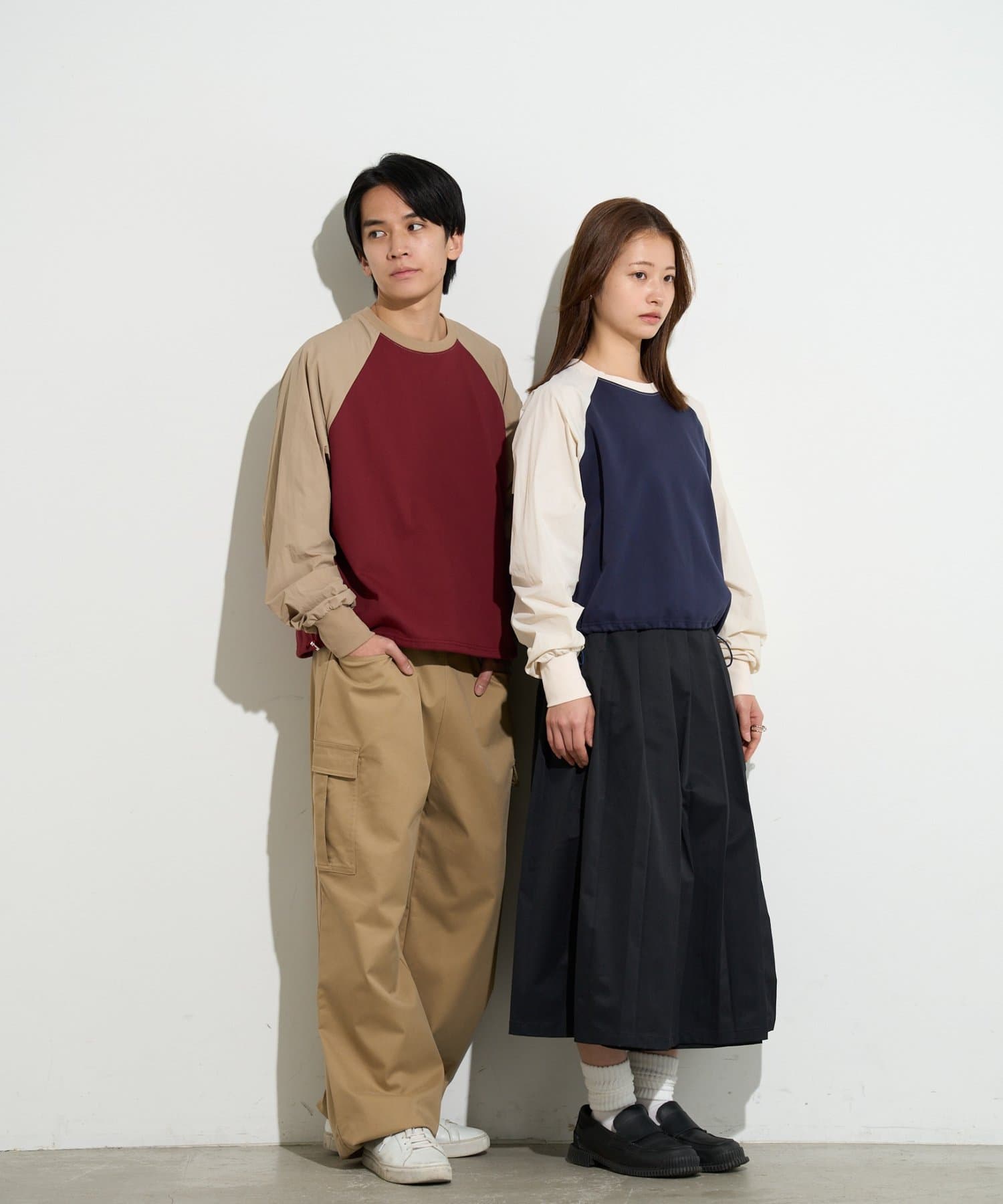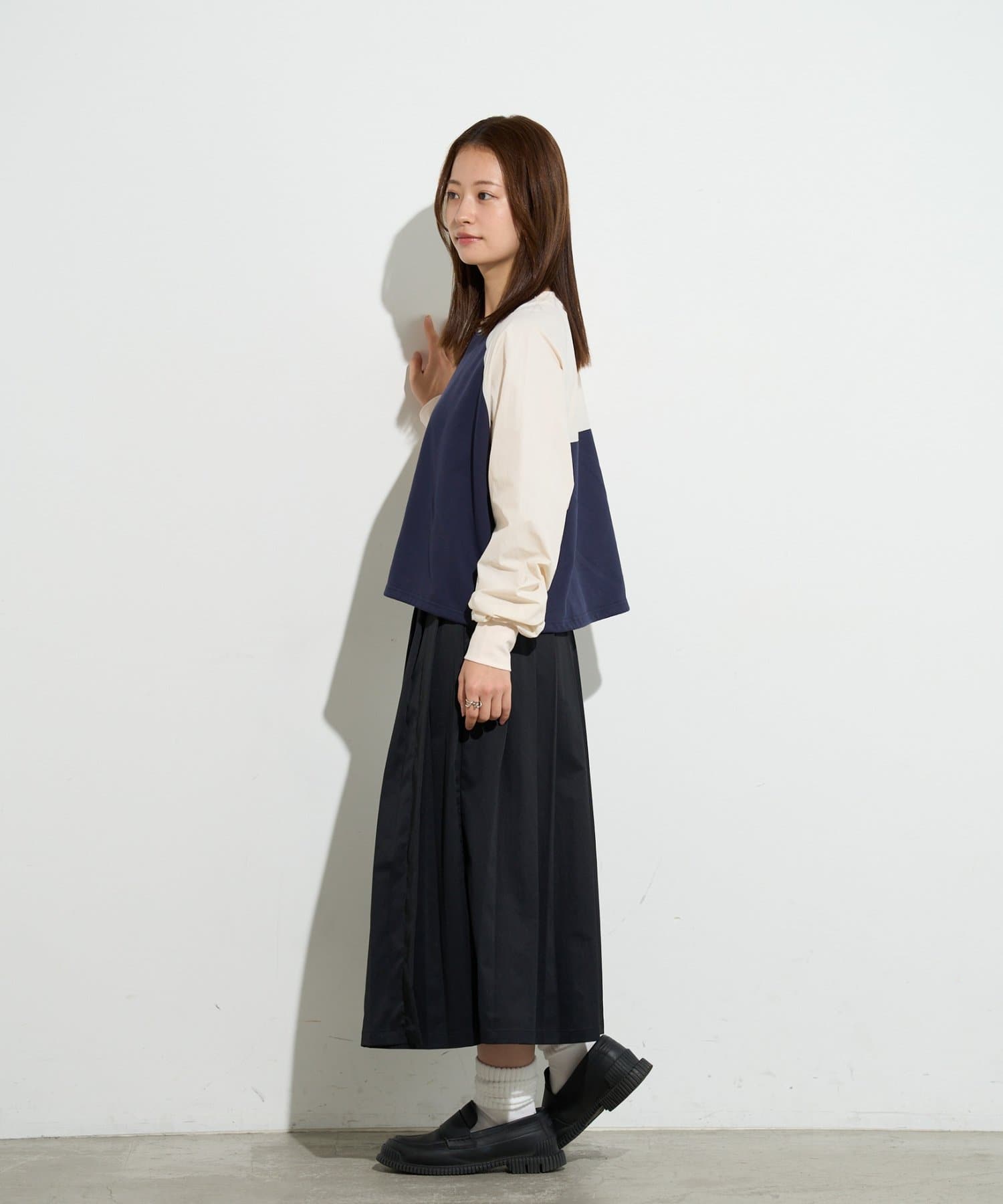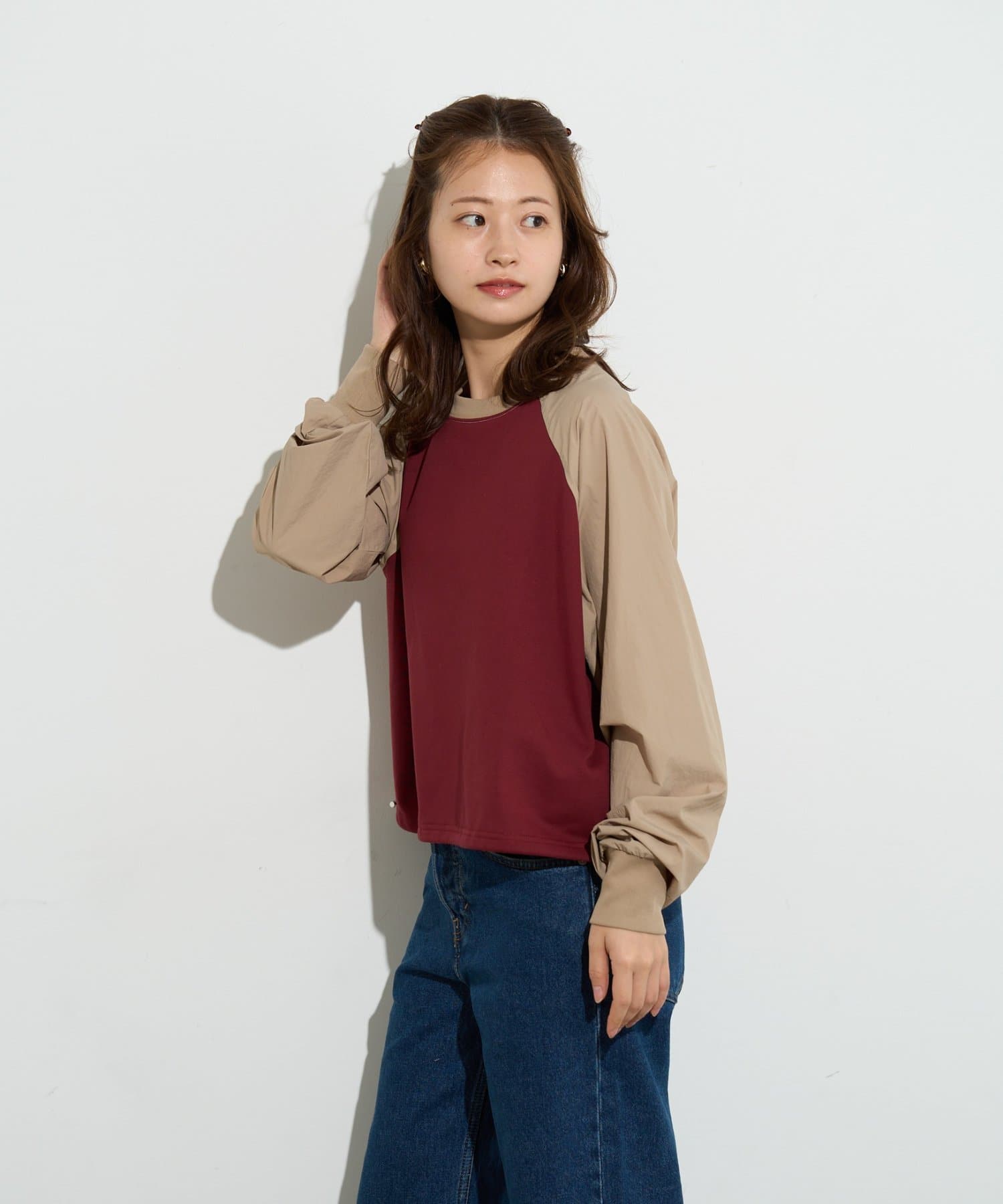 一見カジュアルなラグランスリーブのトップスを、洗練された配色とシルエットで大人っぽくアップデート。