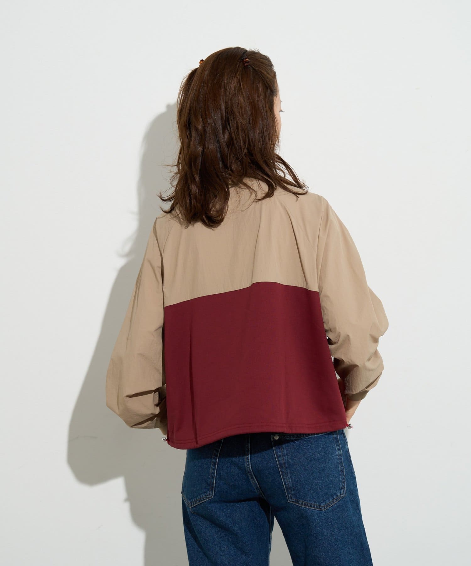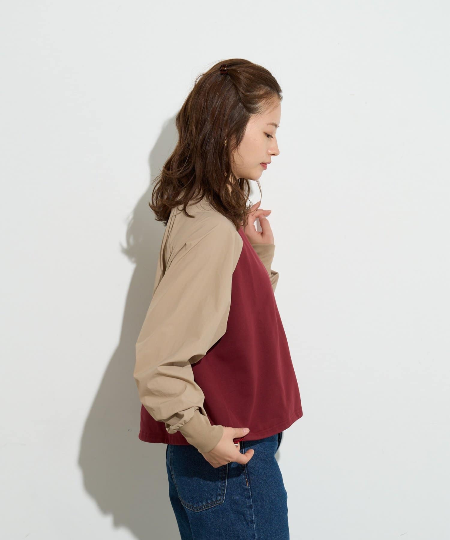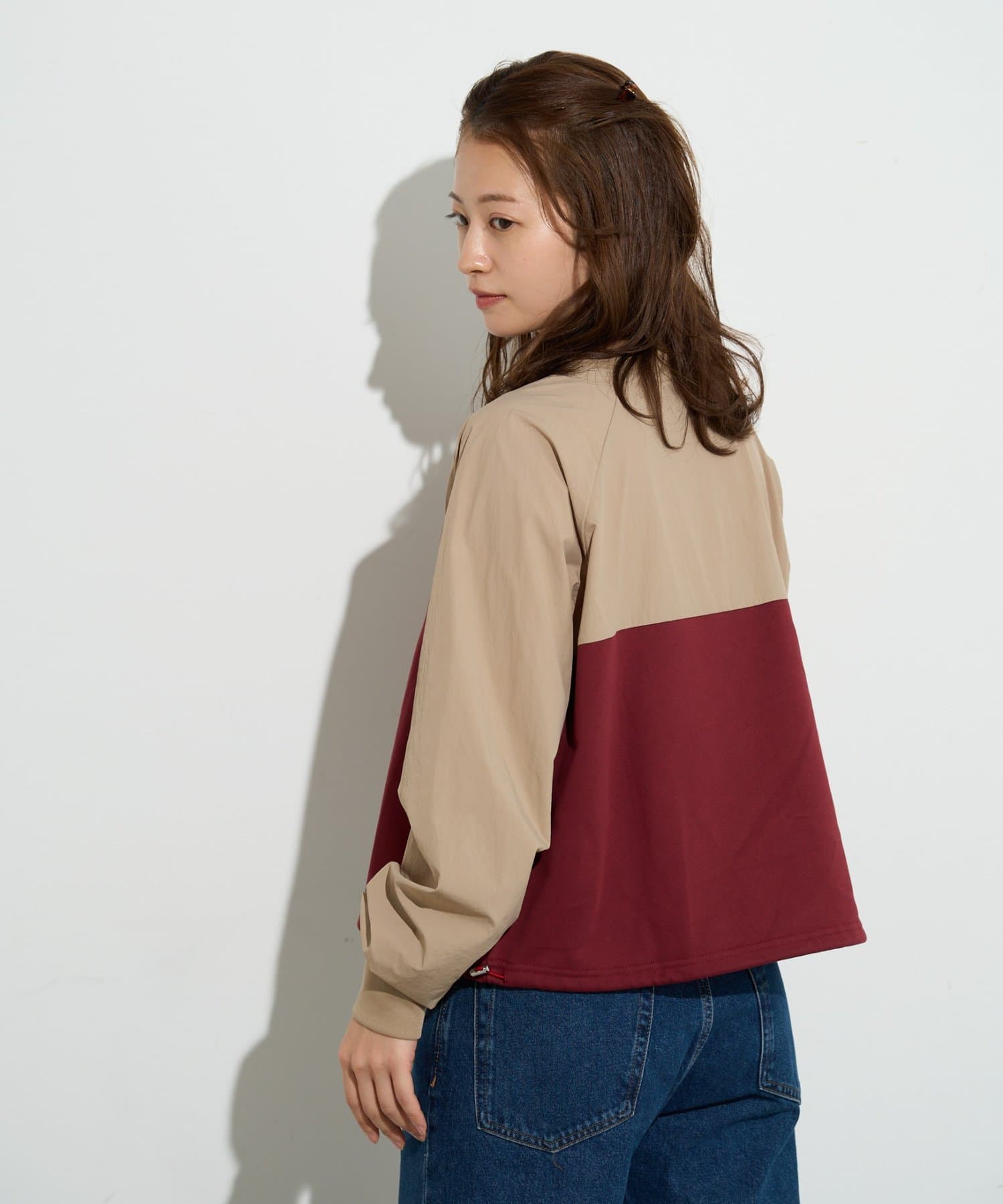袖を微配色しているので、合わせると1枚のアウターのように見せることができます。