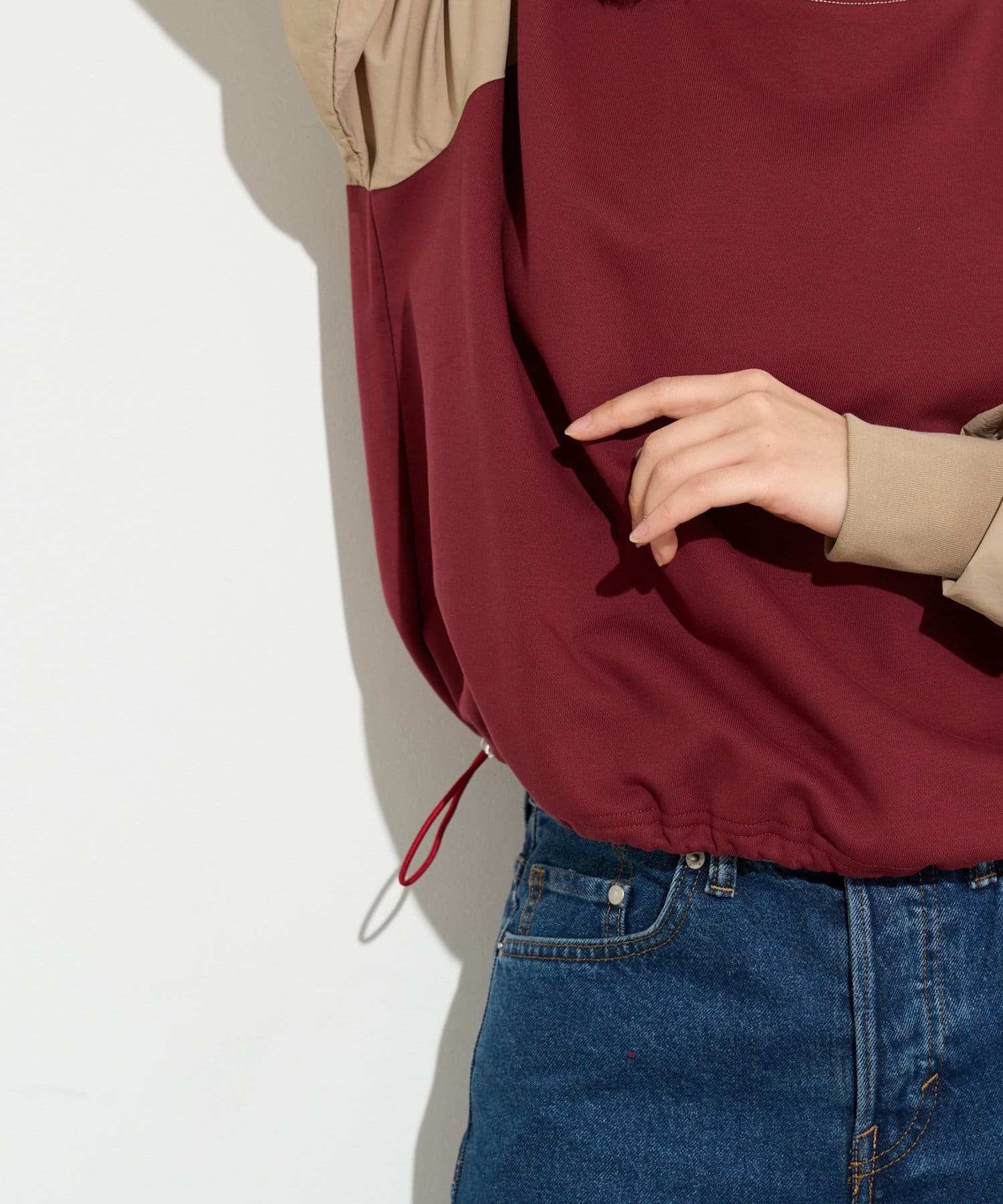 裾部分にドローコードをぐるりと入れているので、スカートなどと着用したときにバランスも取りやすくなっています。