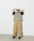 フード付きベストとセットアップが可能なカーゴパンツ。