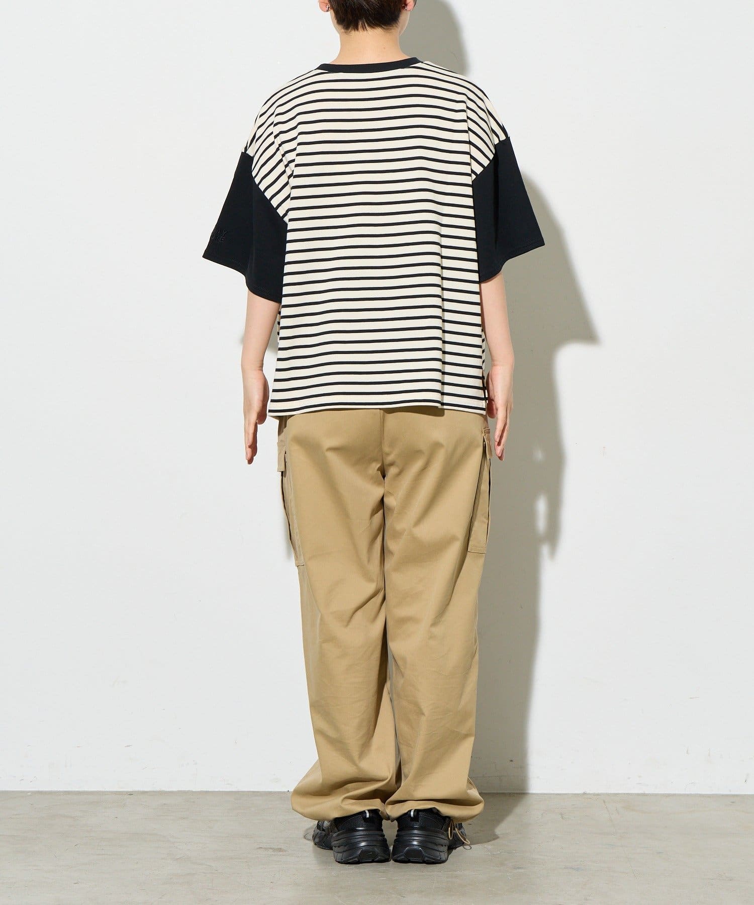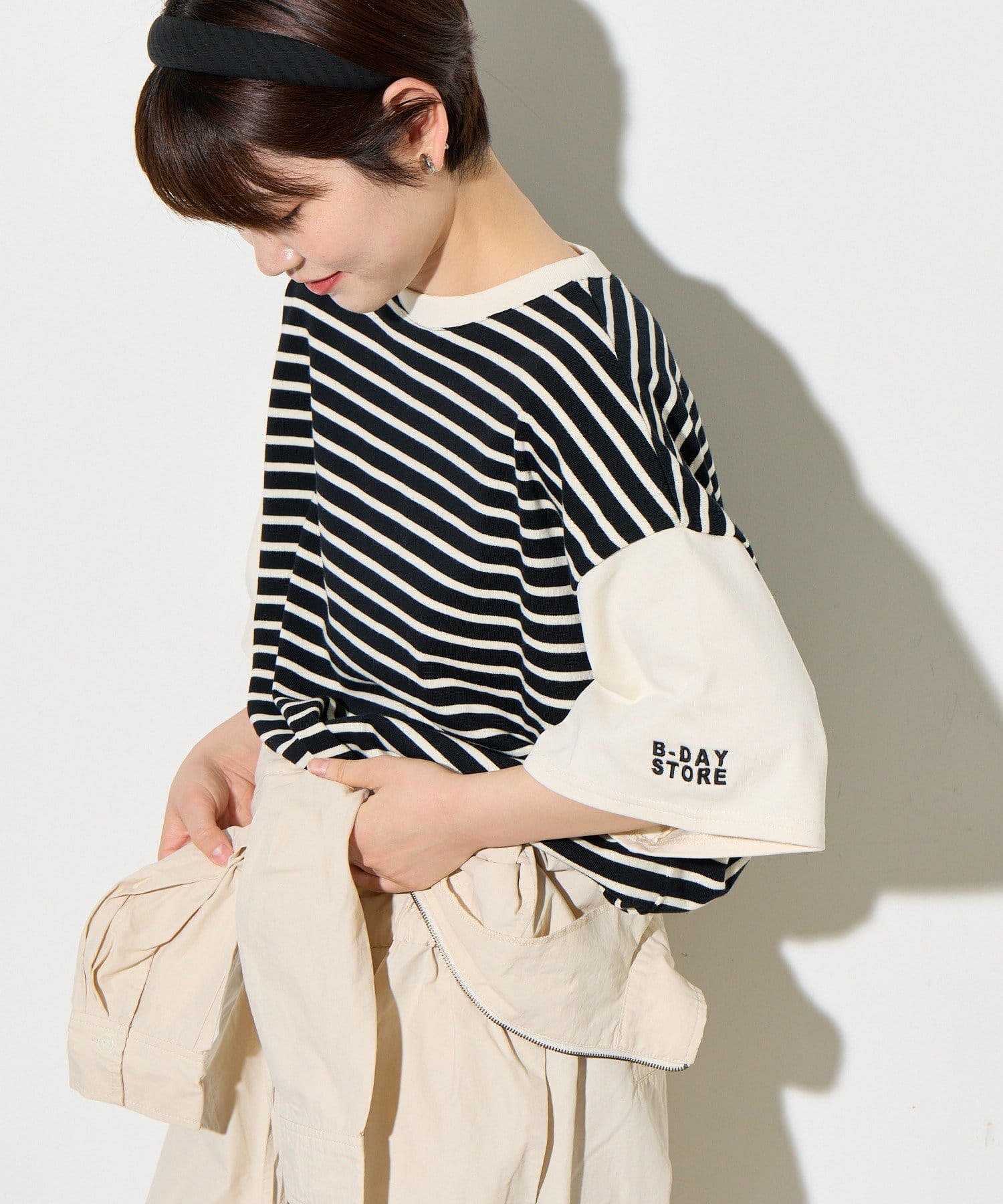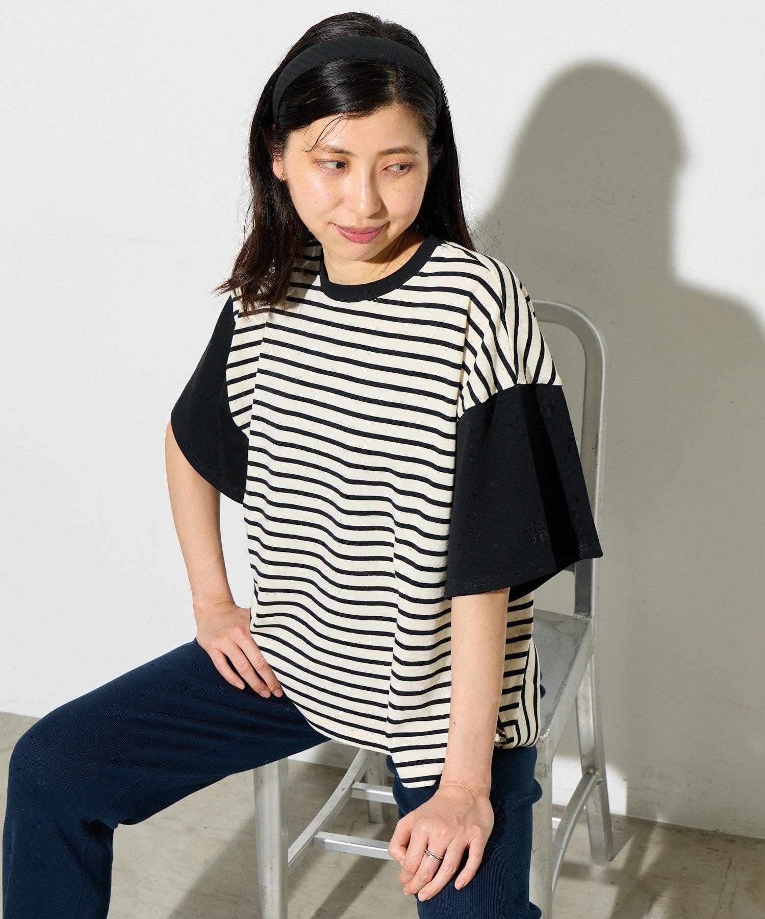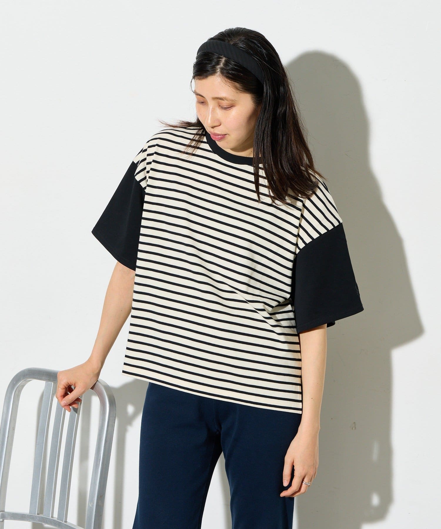 袖部分を大胆に切り替えたスリーブデザインがポイントのボーダー配色のカットソー