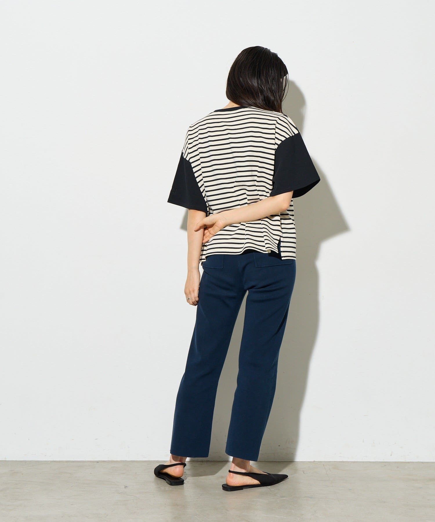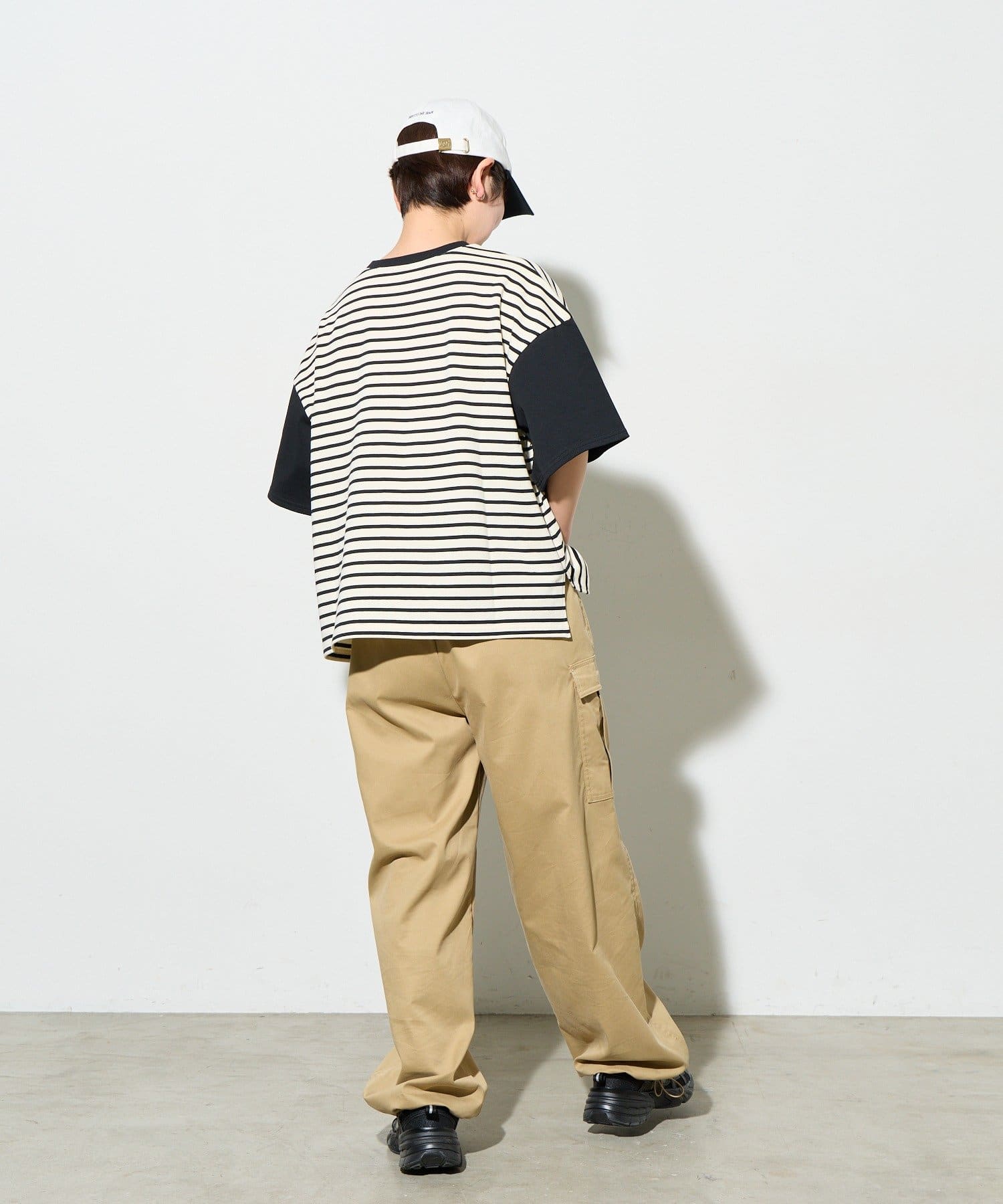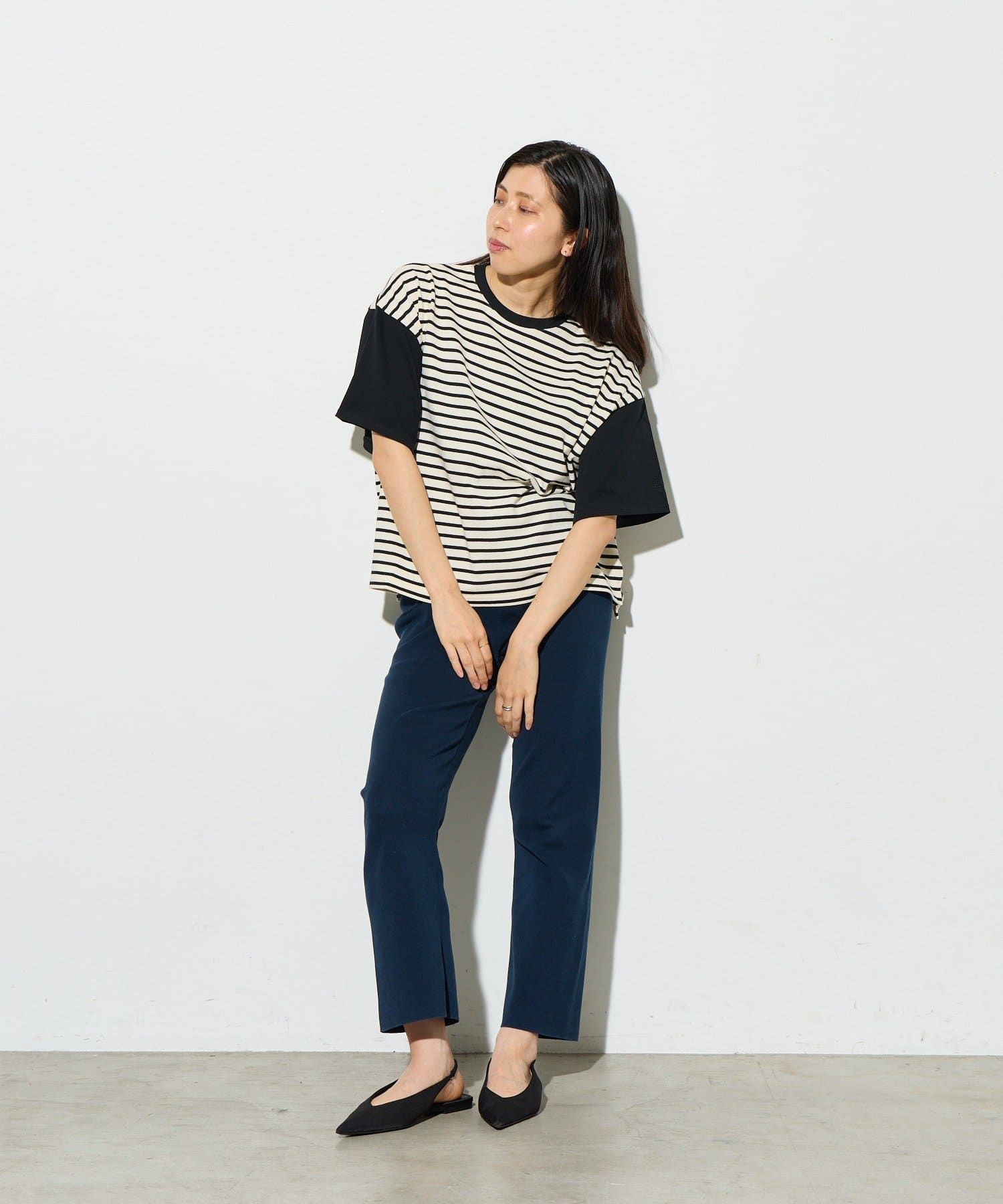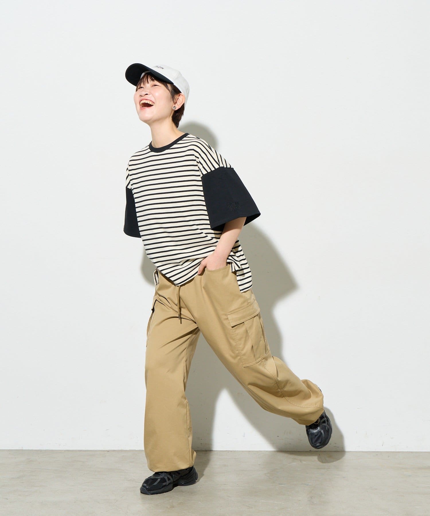 袖部分を大胆に切り替えたスリーブデザインがポイントのボーダー配色のカットソー