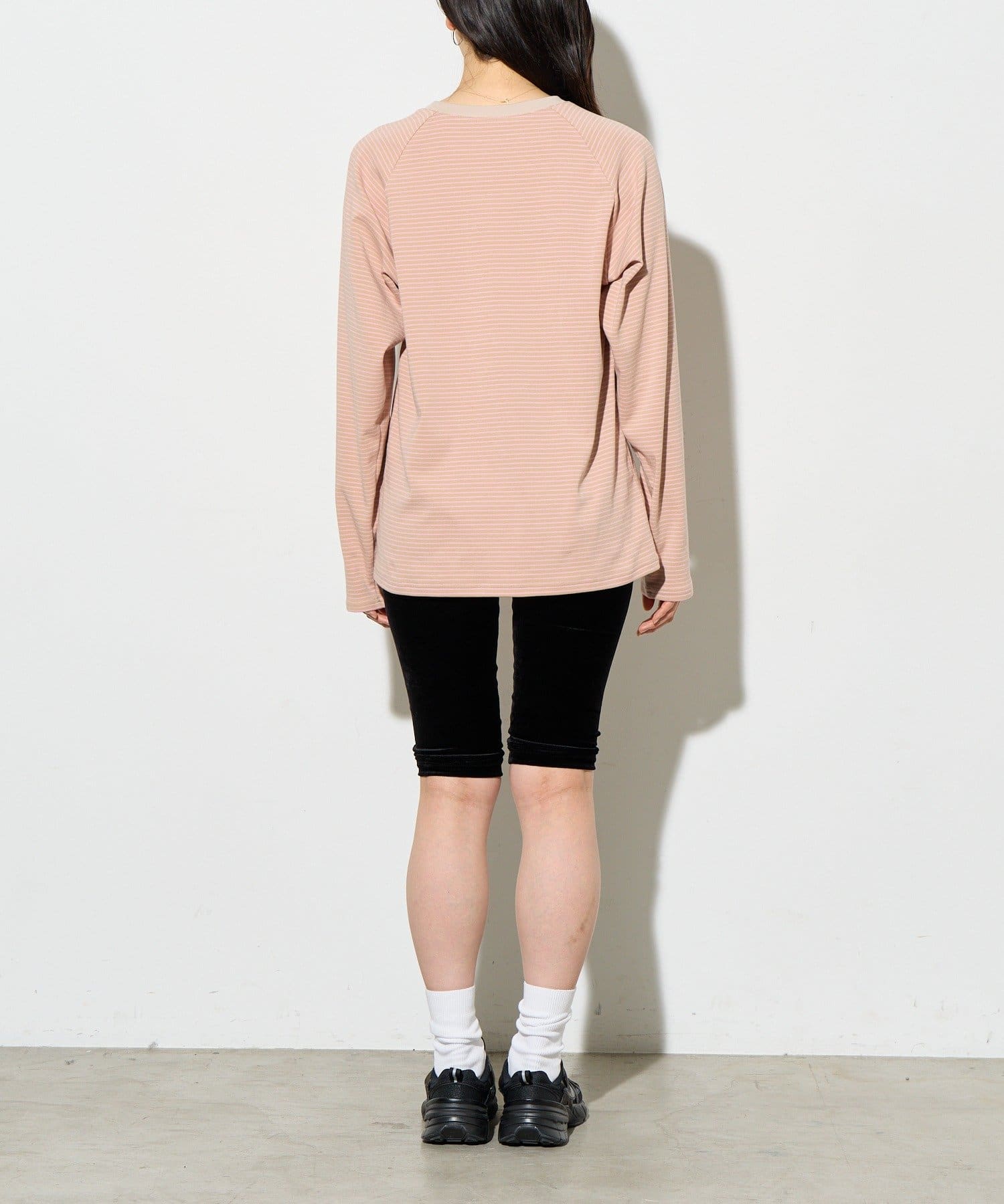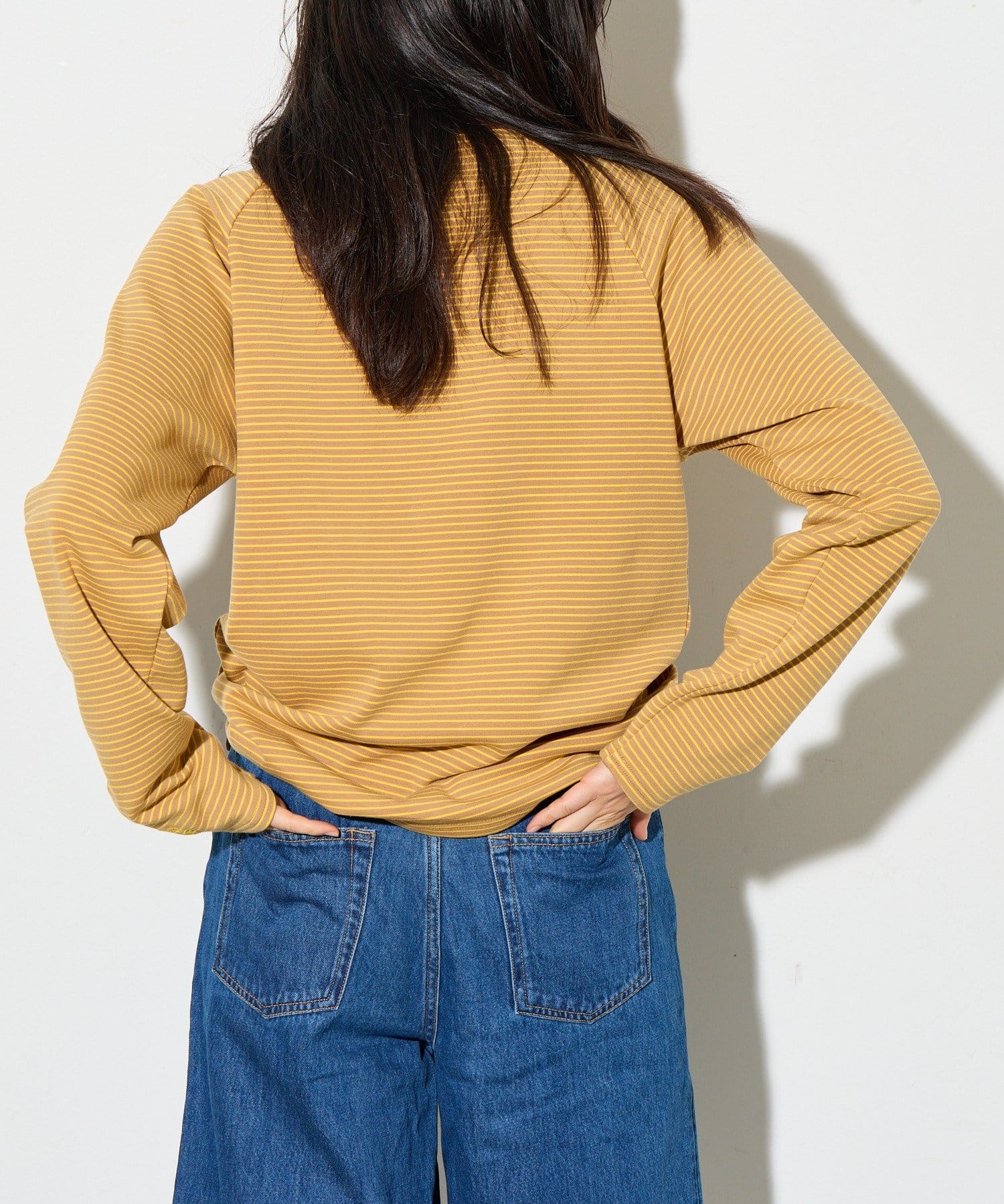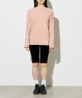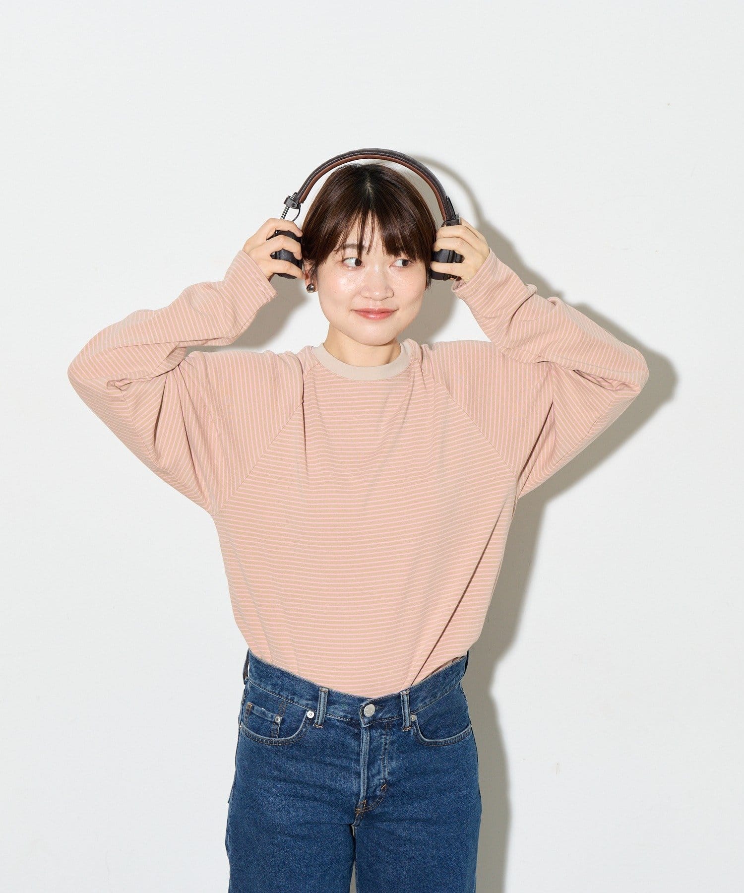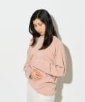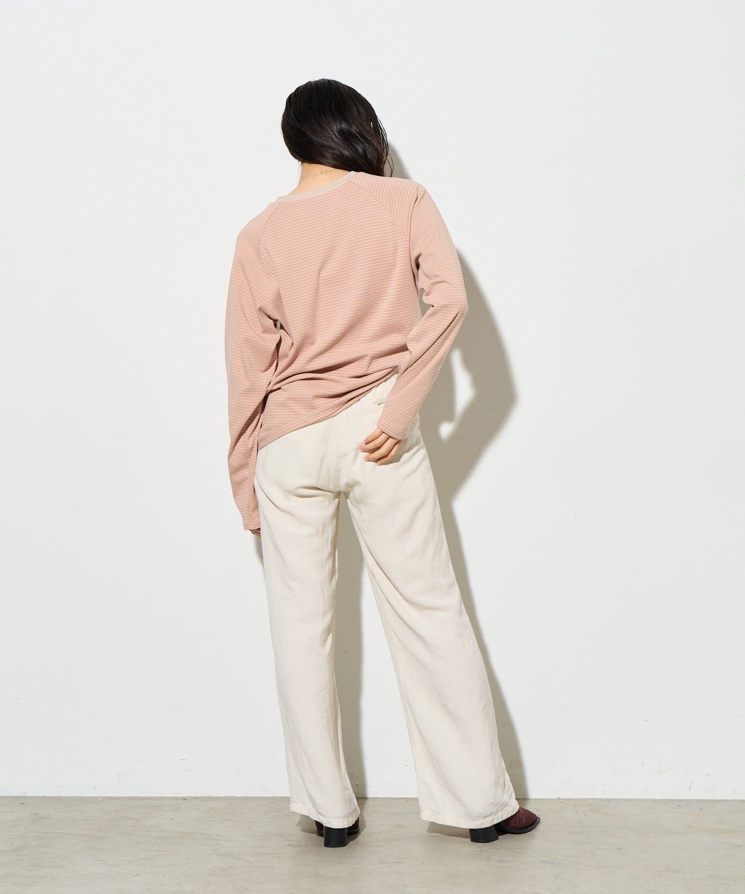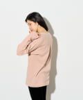 顔周りをすっきりと見せるクルーネックのデザインで、首元のリブは本体より少し濃い色合いになっており、さりげないデザインのアクセントに。
