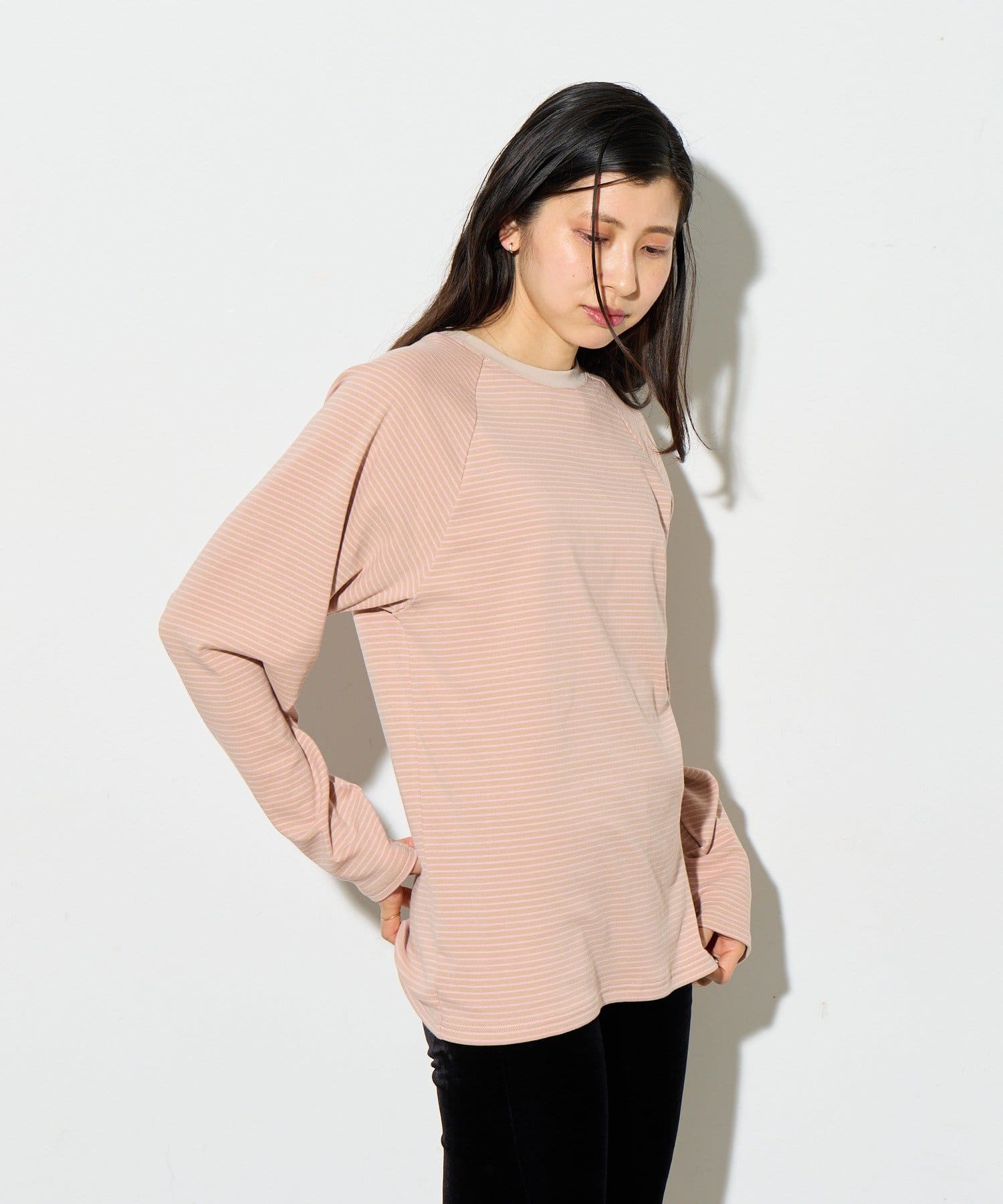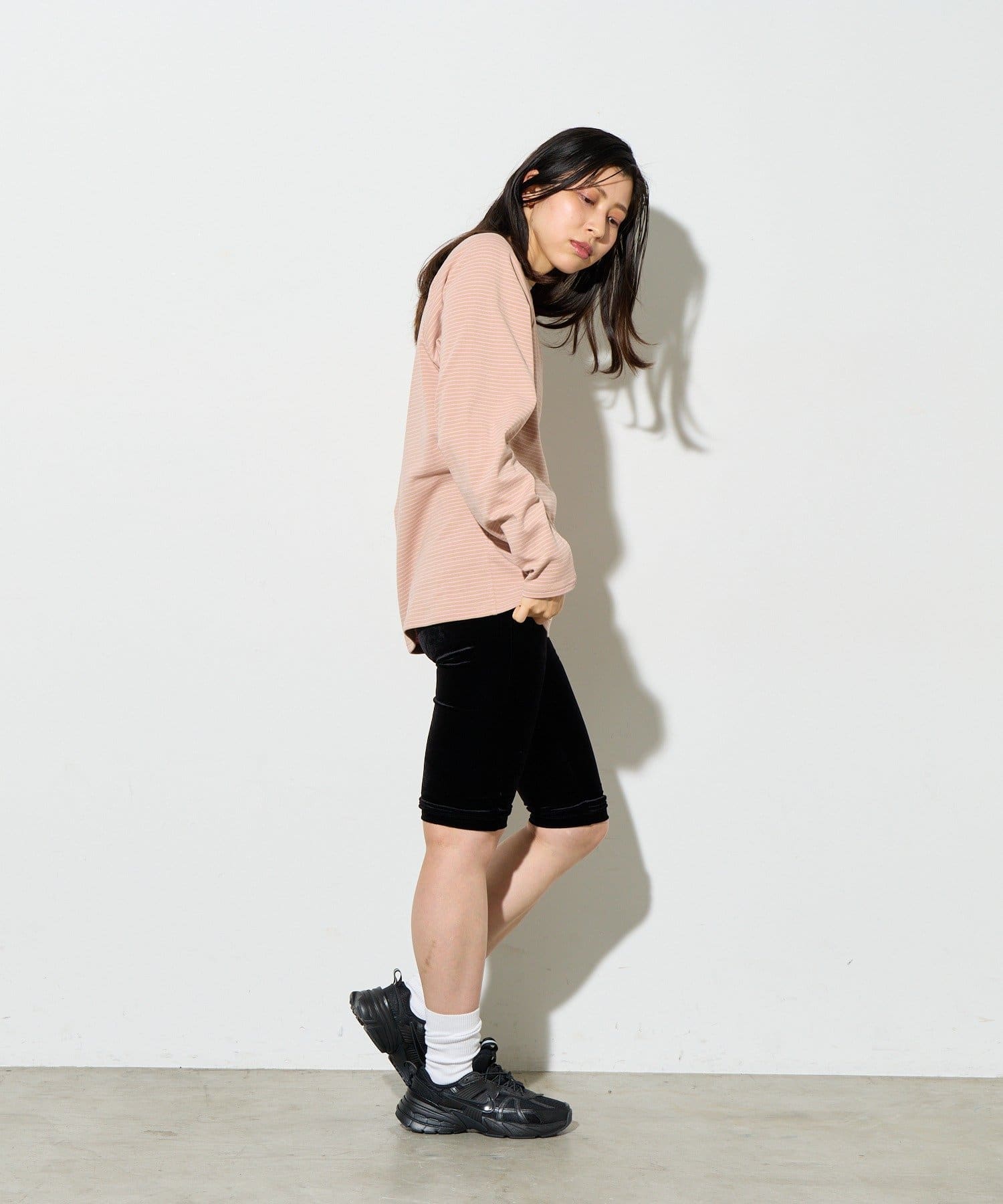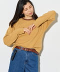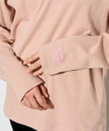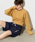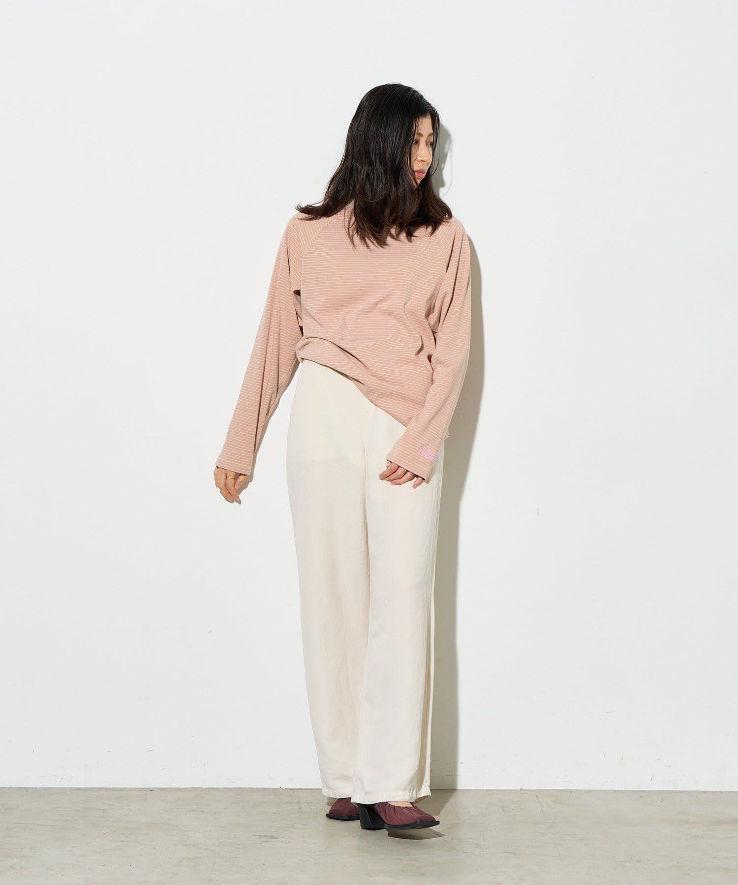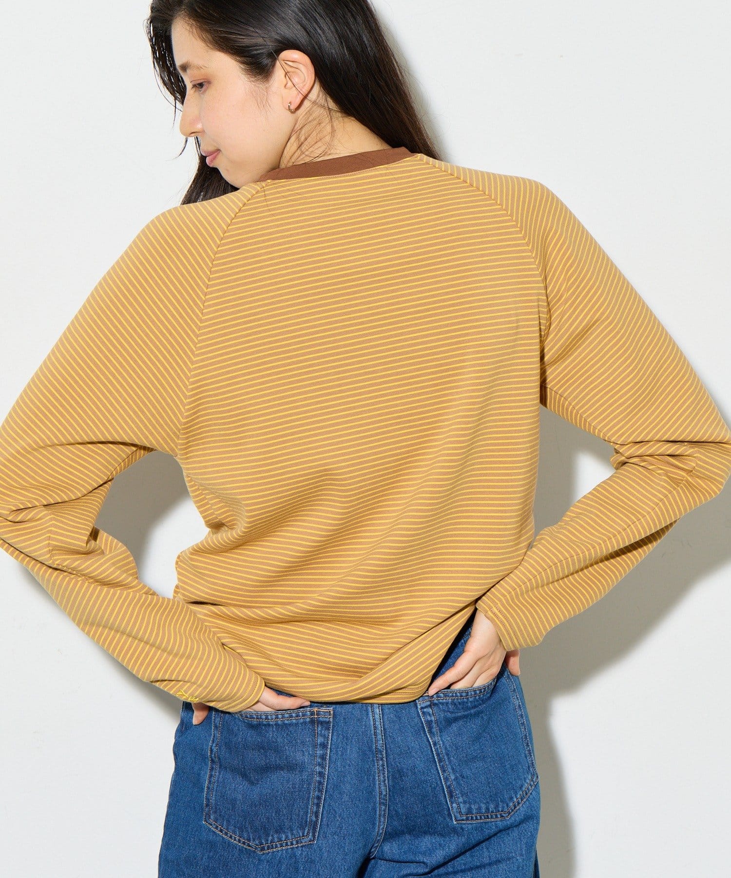 顔周りをすっきりと見せるクルーネックのデザインで、首元のリブは本体より少し濃い色合いになっており、さりげないデザインのアクセントに。