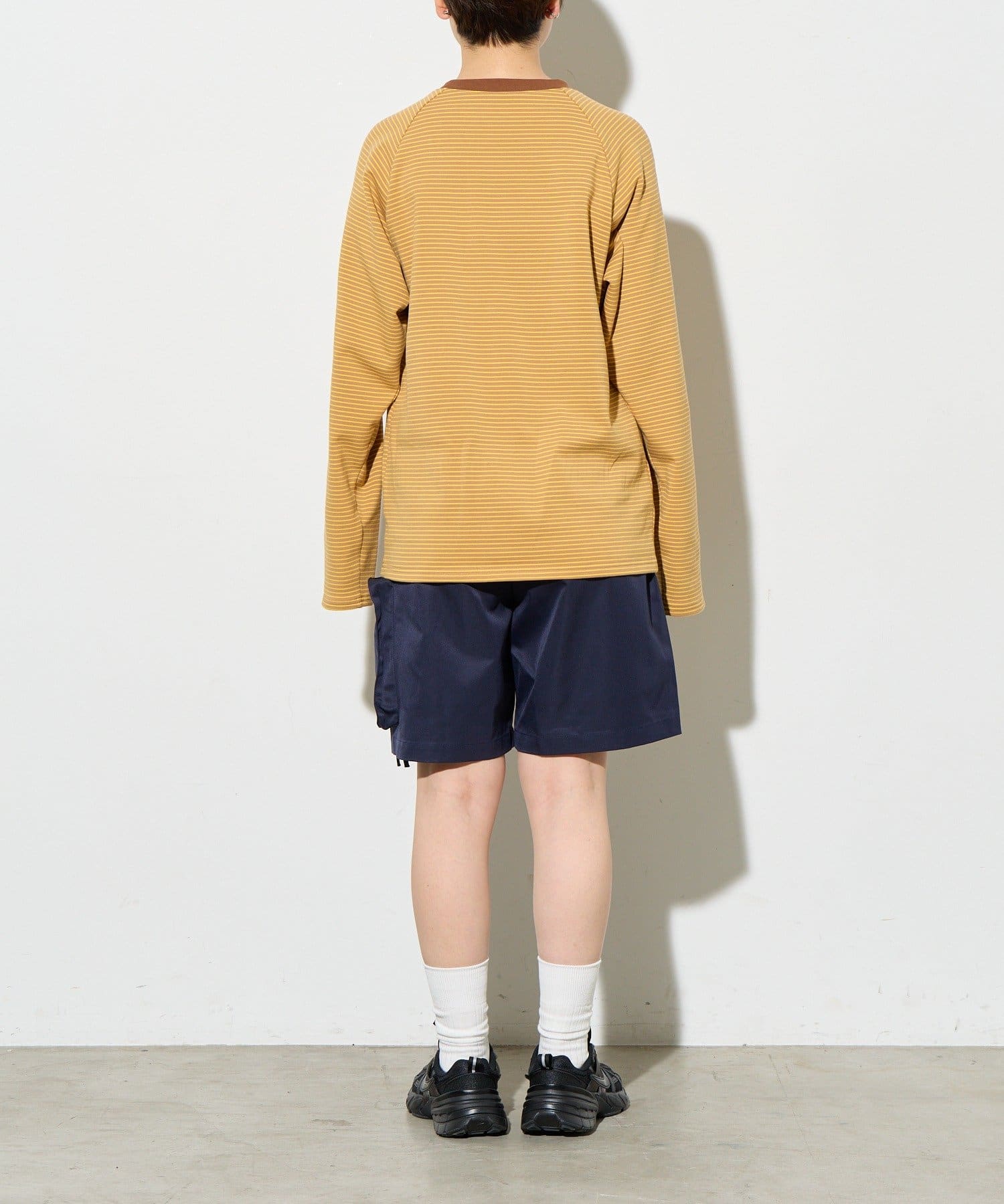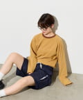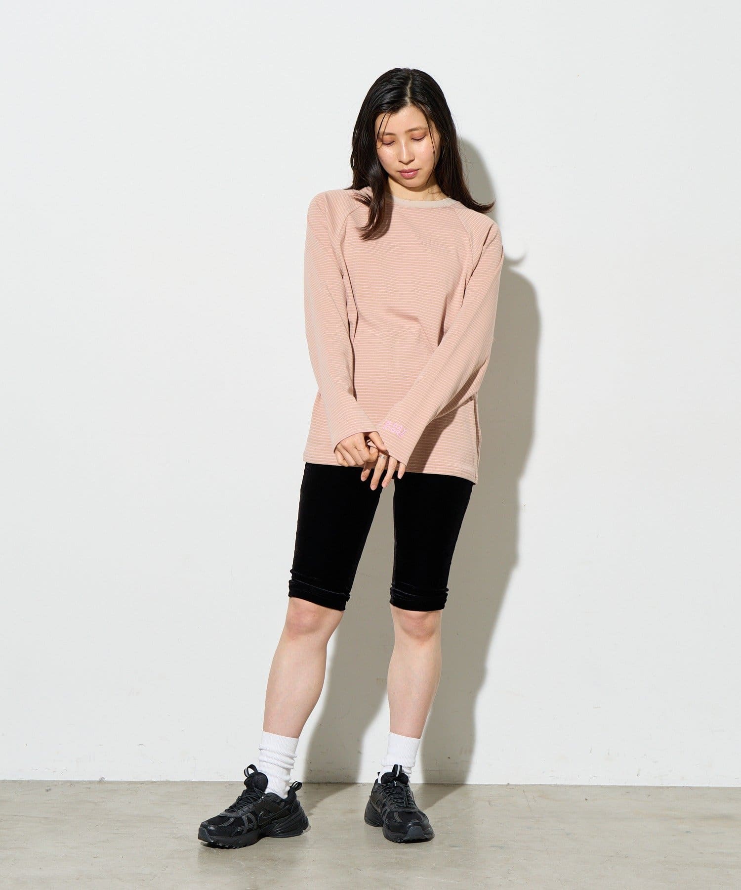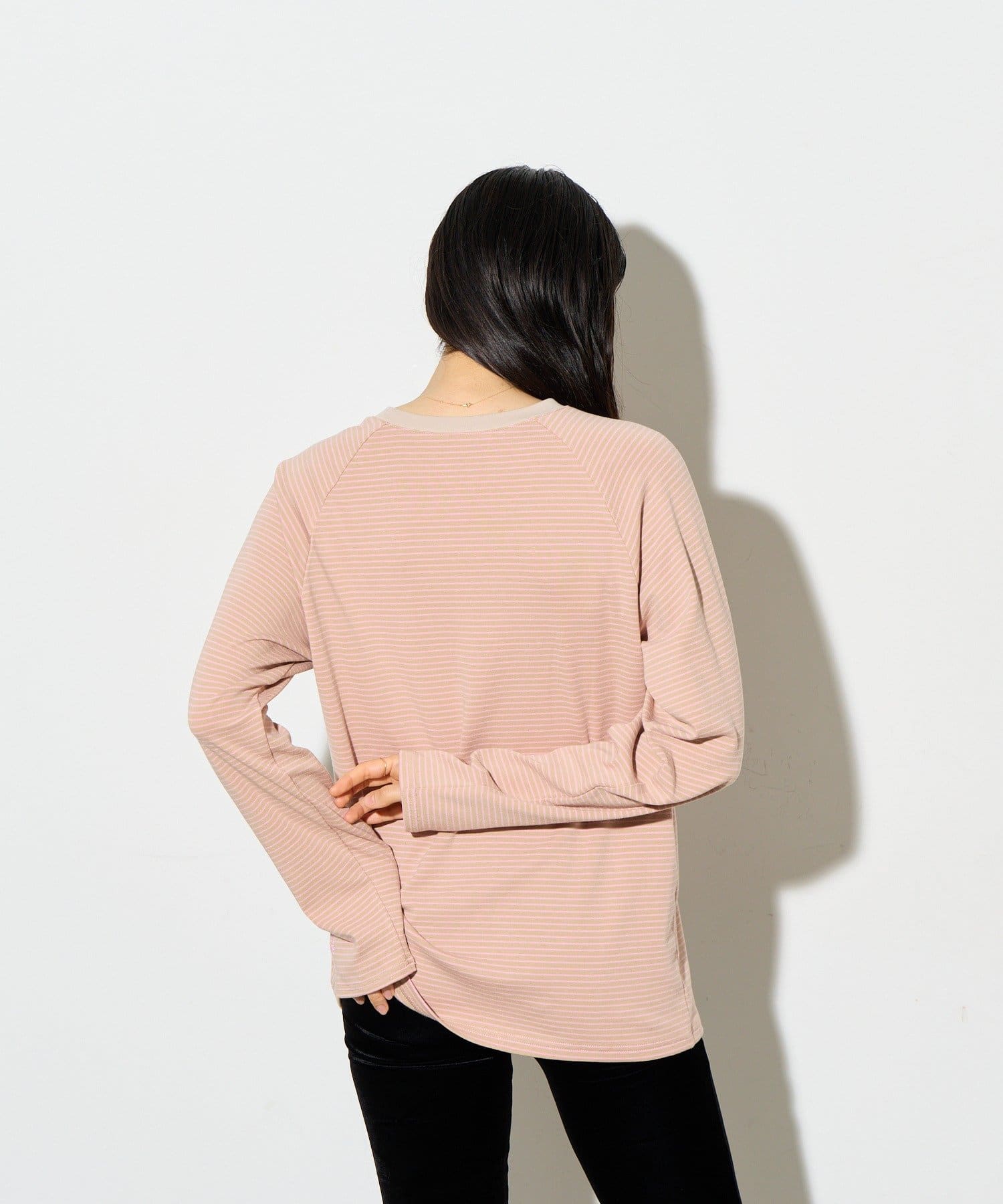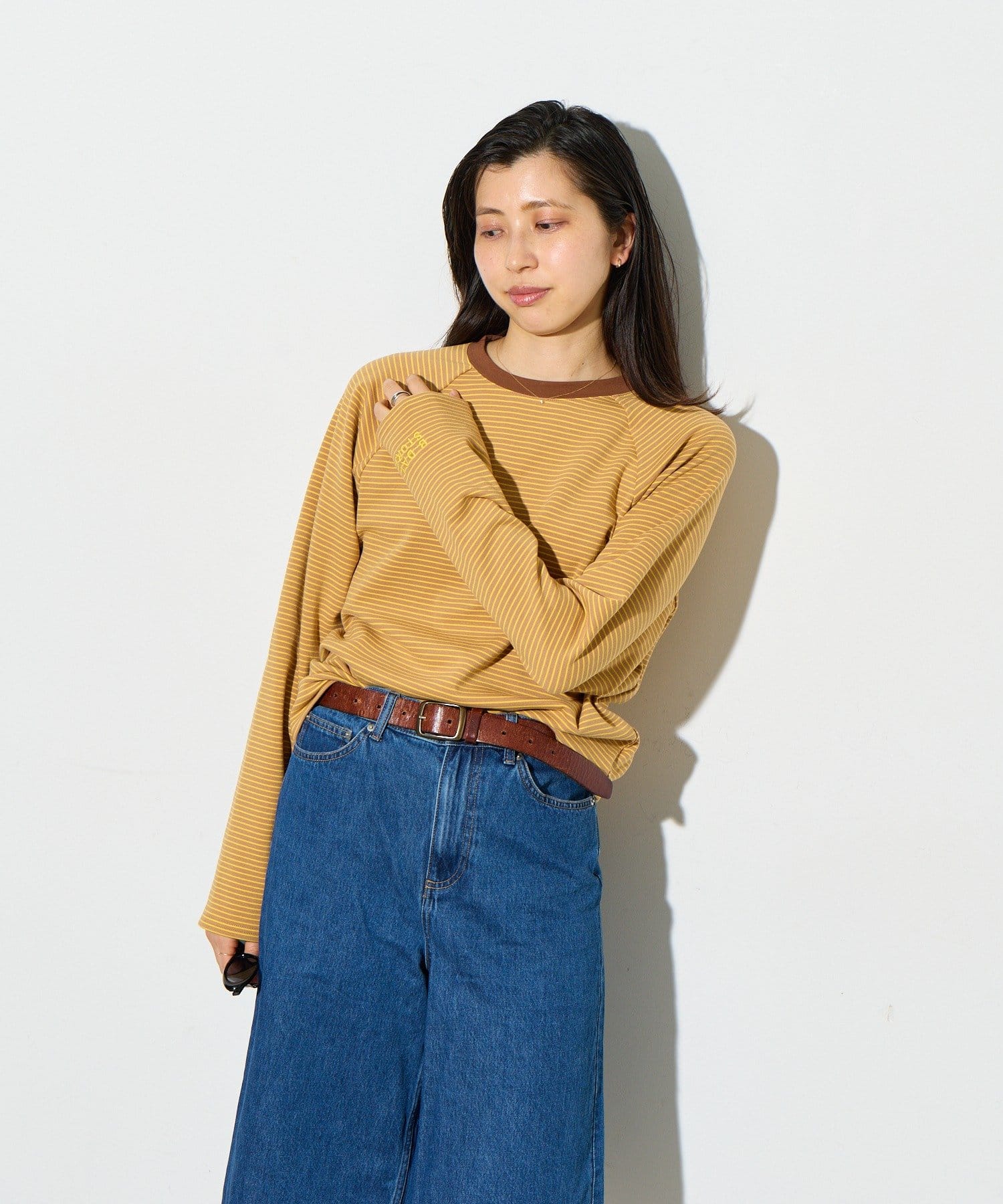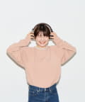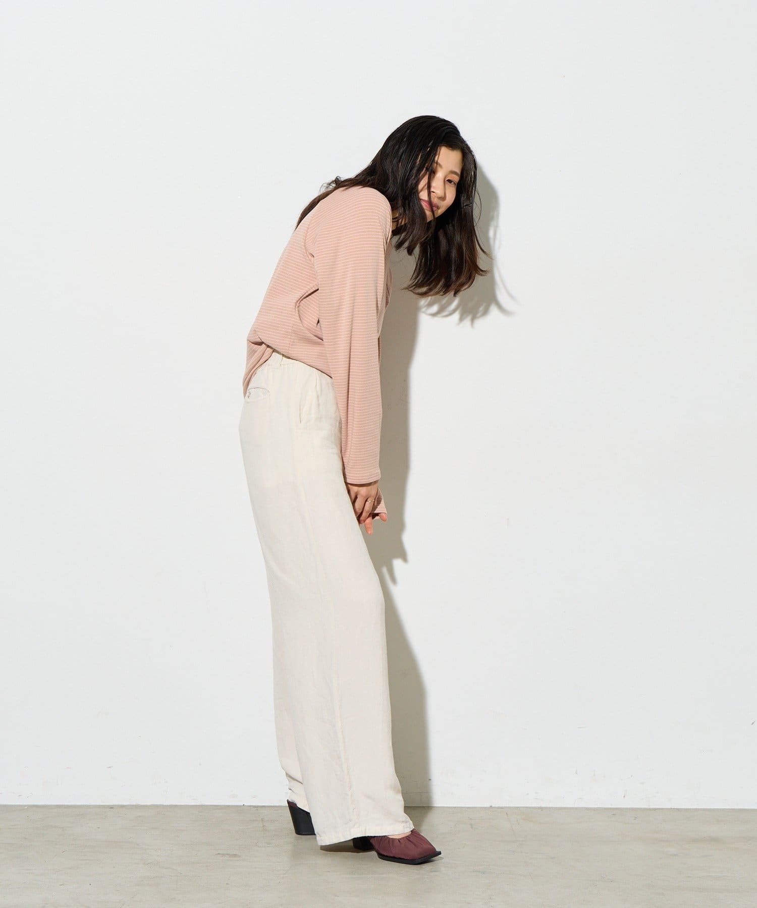 顔周りをすっきりと見せるクルーネックのデザインで、首元のリブは本体より少し濃い色合いになっており、さりげないデザインのアクセントに。