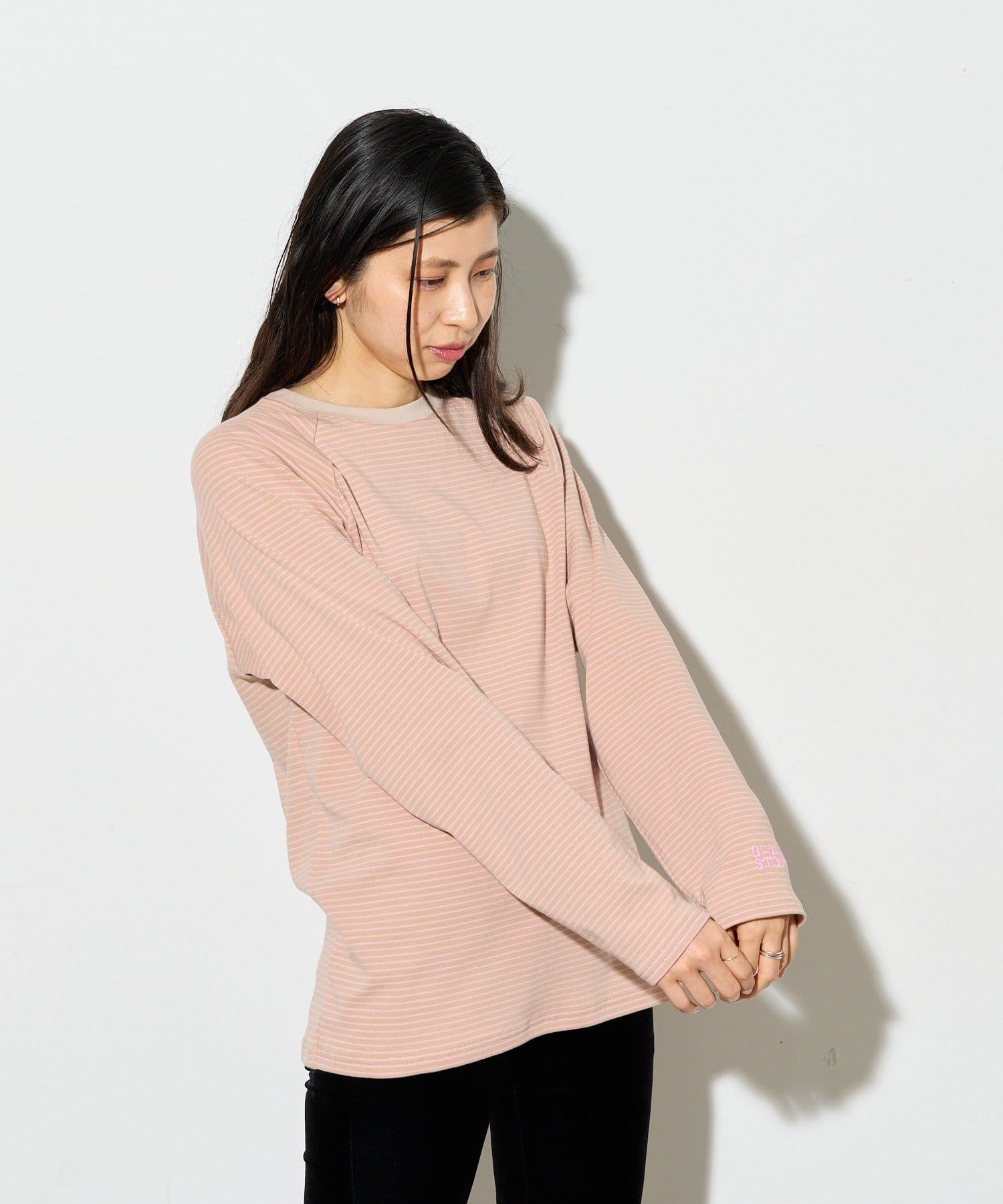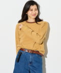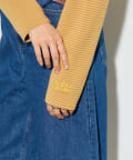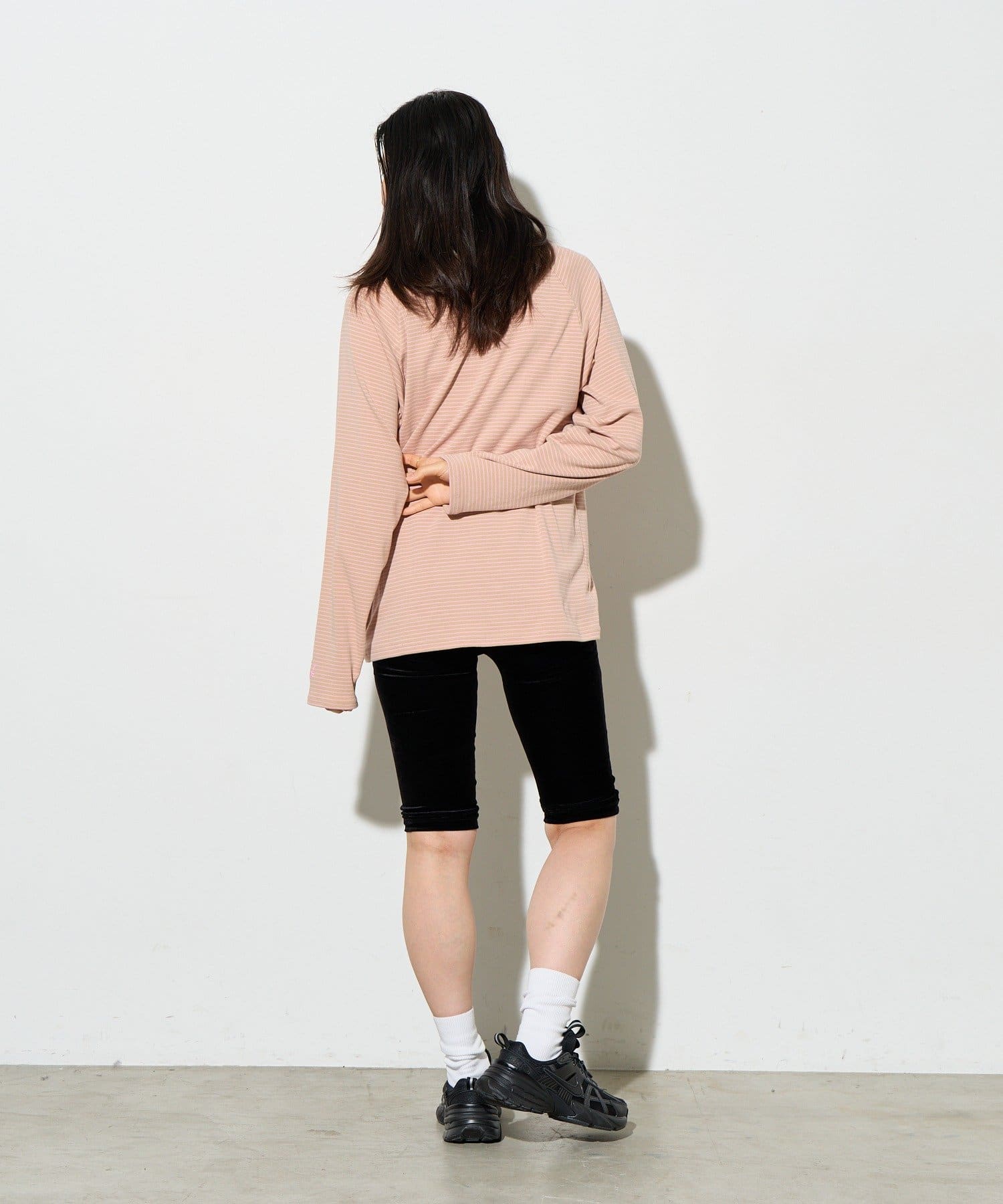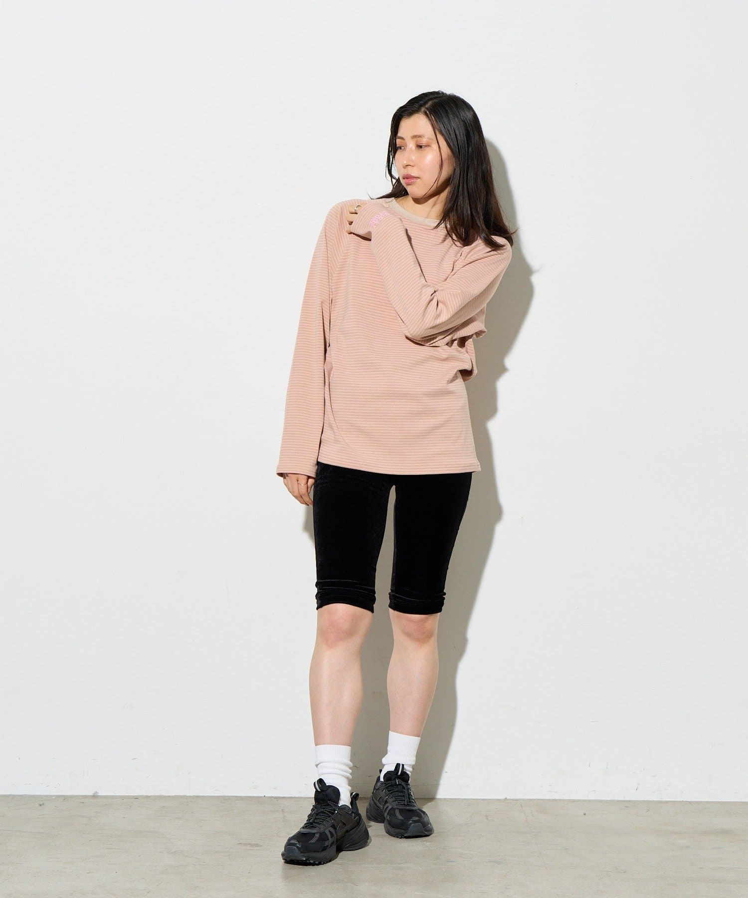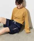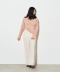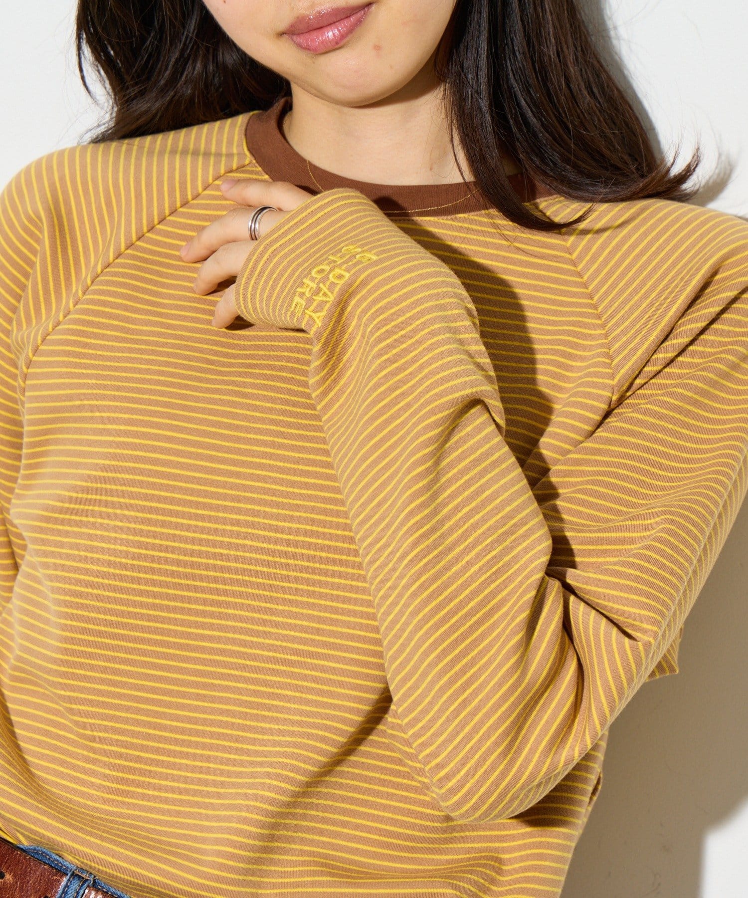 顔周りをすっきりと見せるクルーネックのデザインで、首元のリブは本体より少し濃い色合いになっており、さりげないデザインのアクセントに。